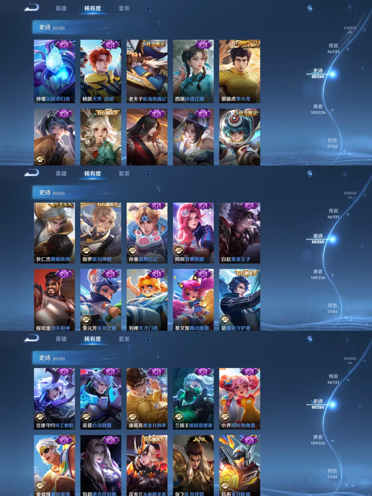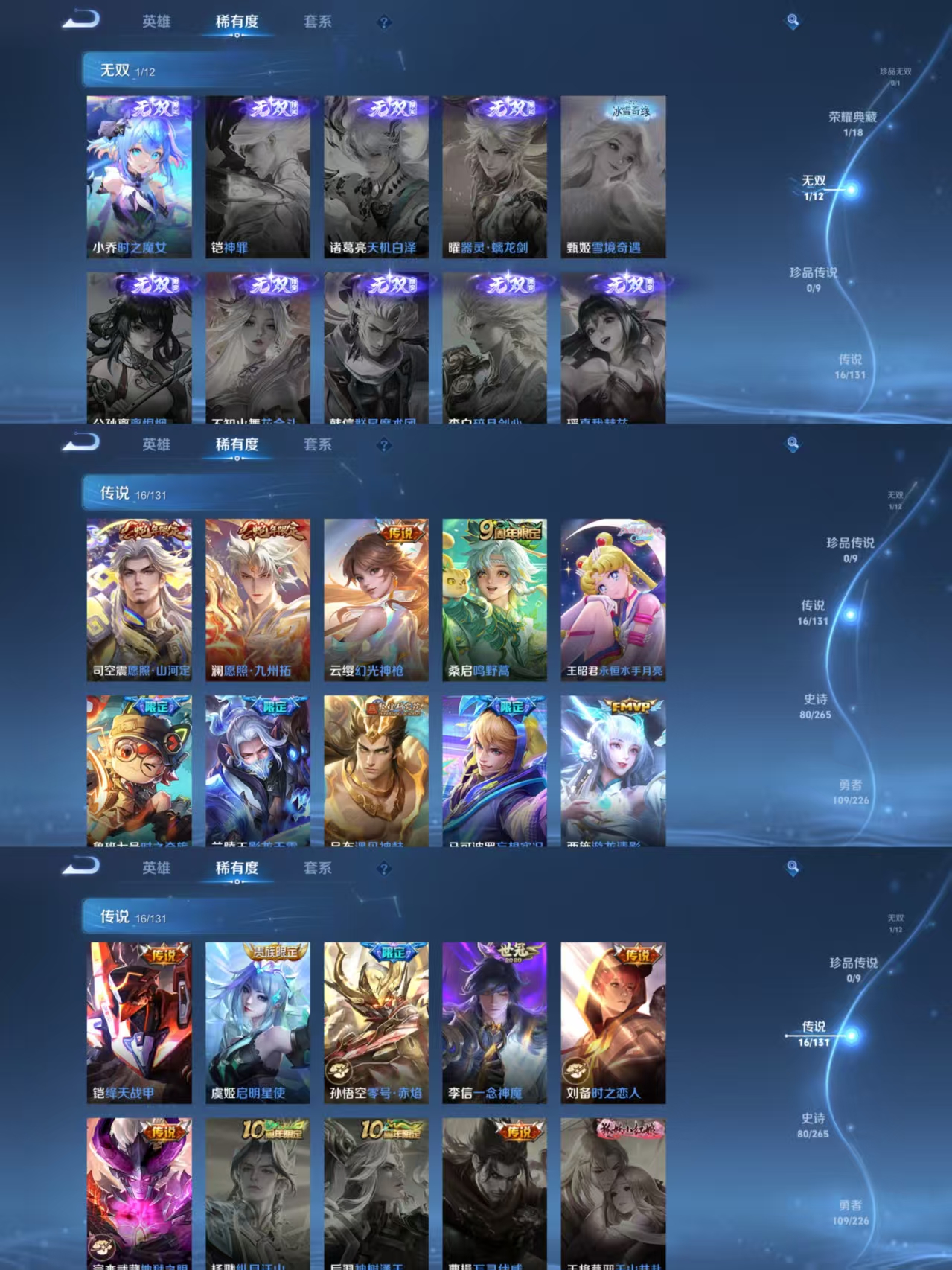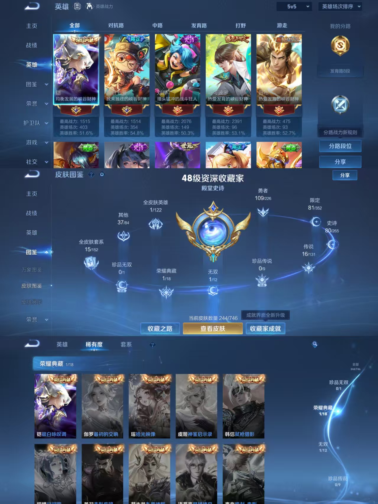 贵族等级:v8皮肤数:244传说品质16 生肖限定3 无双1 荣耀典藏1 英雄数:126