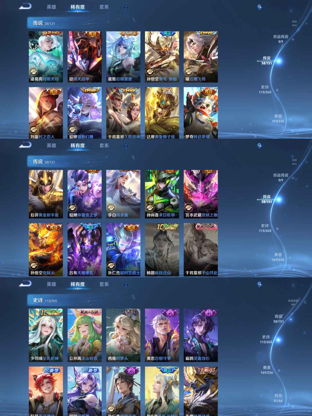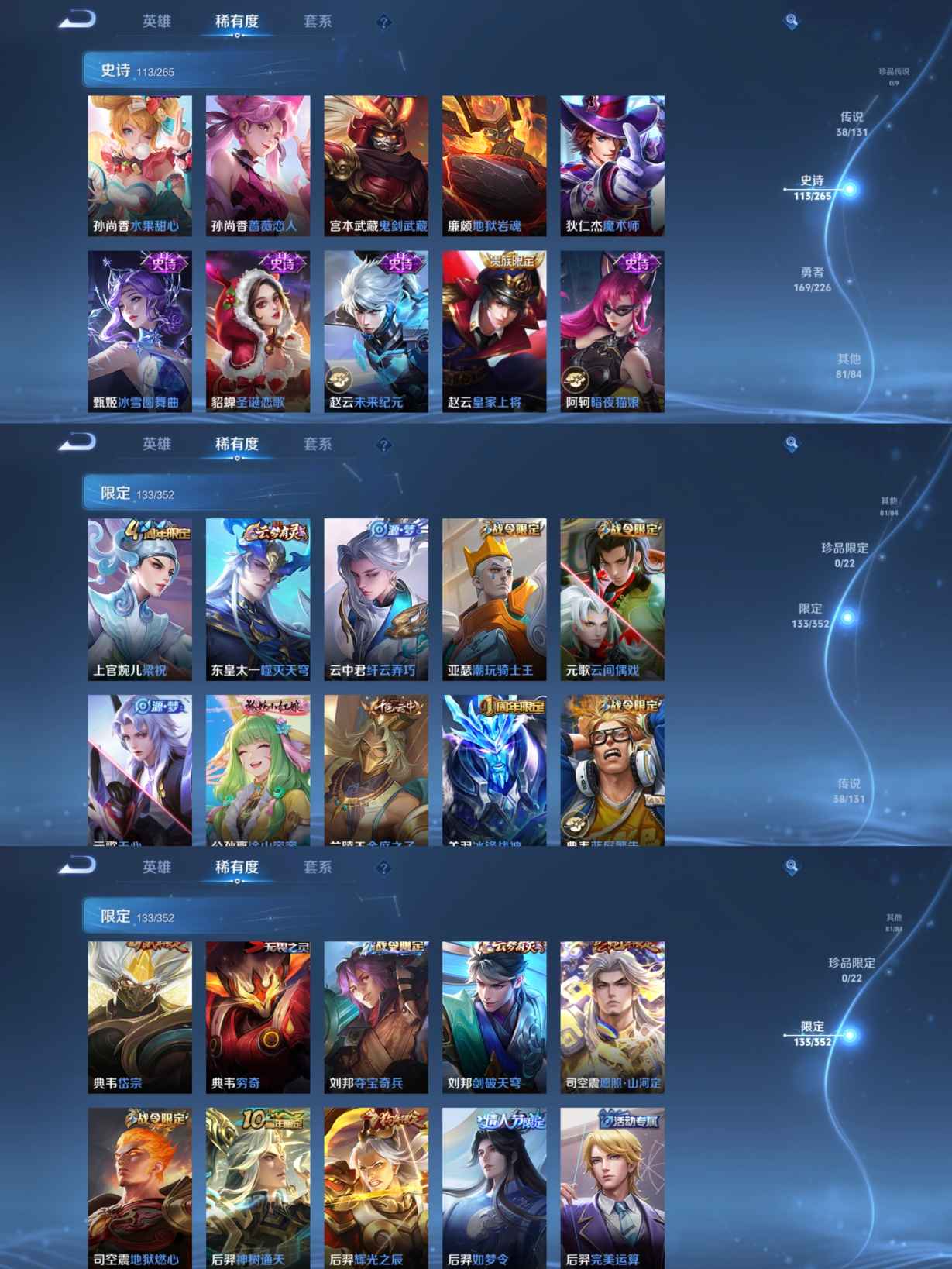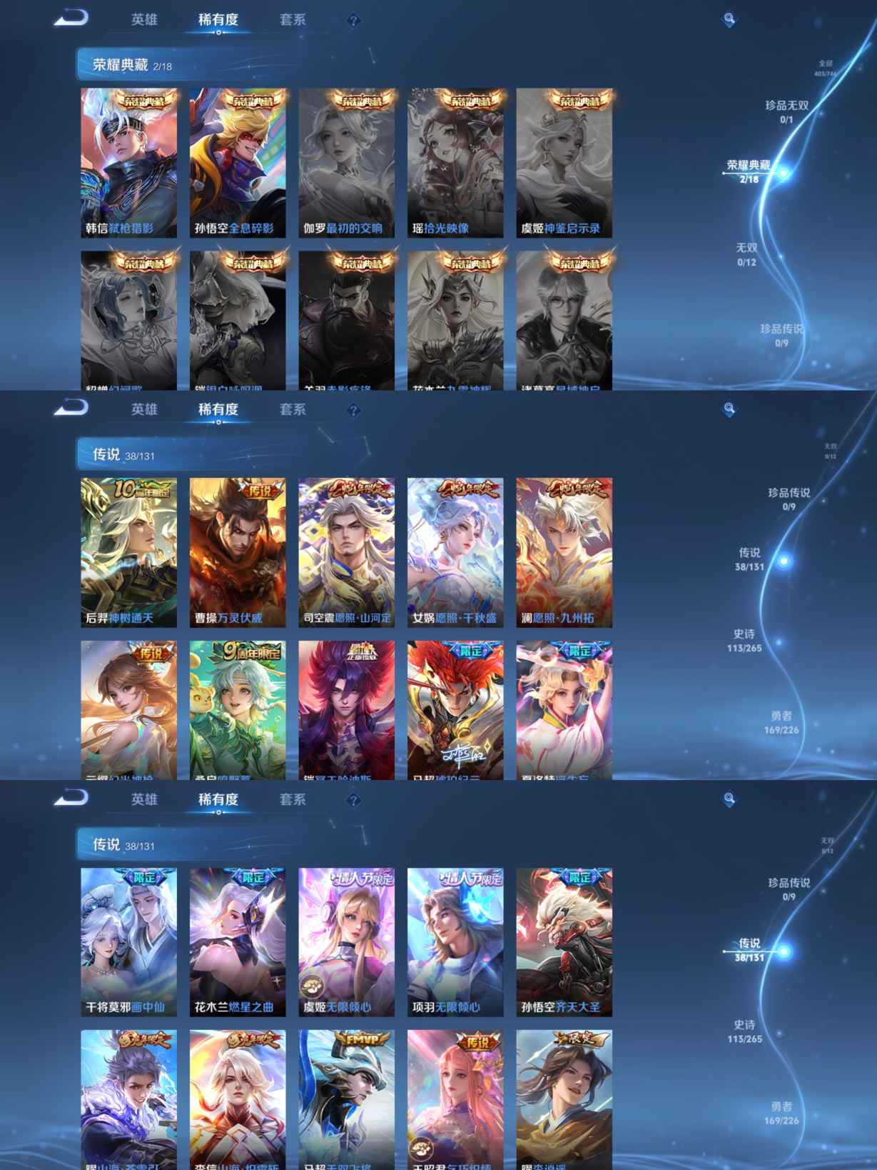 贵族等级:v9皮肤数:403生肖限定15 传说品质38 情人节限定5 荣耀典藏2 英雄数:127