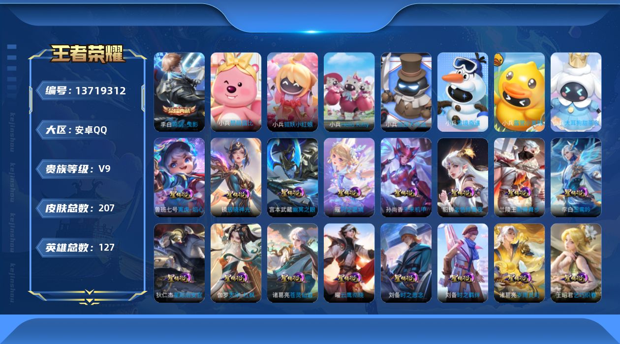 贵族等级:v9皮肤数:207情人节限定2 传说品质5 生肖限定3 荣耀典藏1 英雄数:127