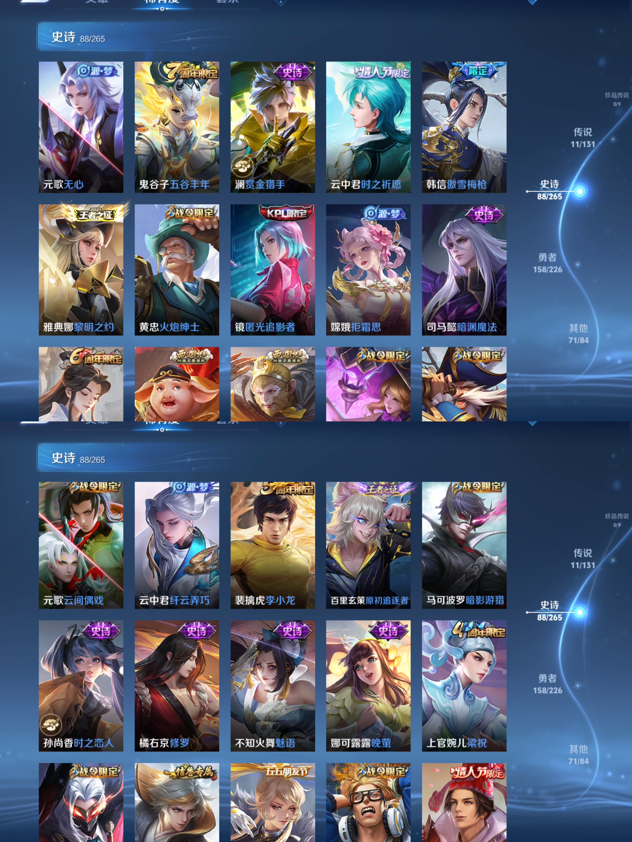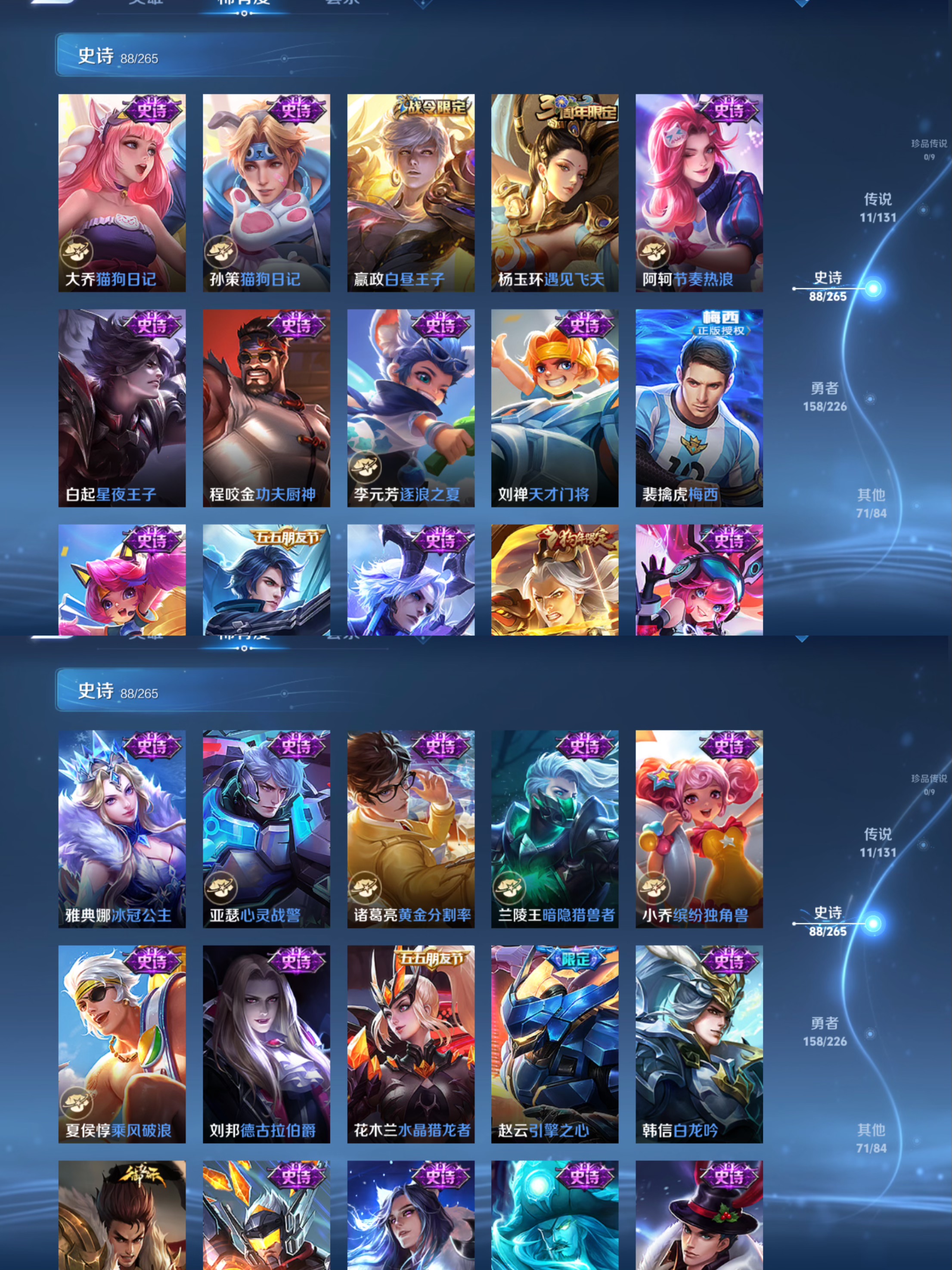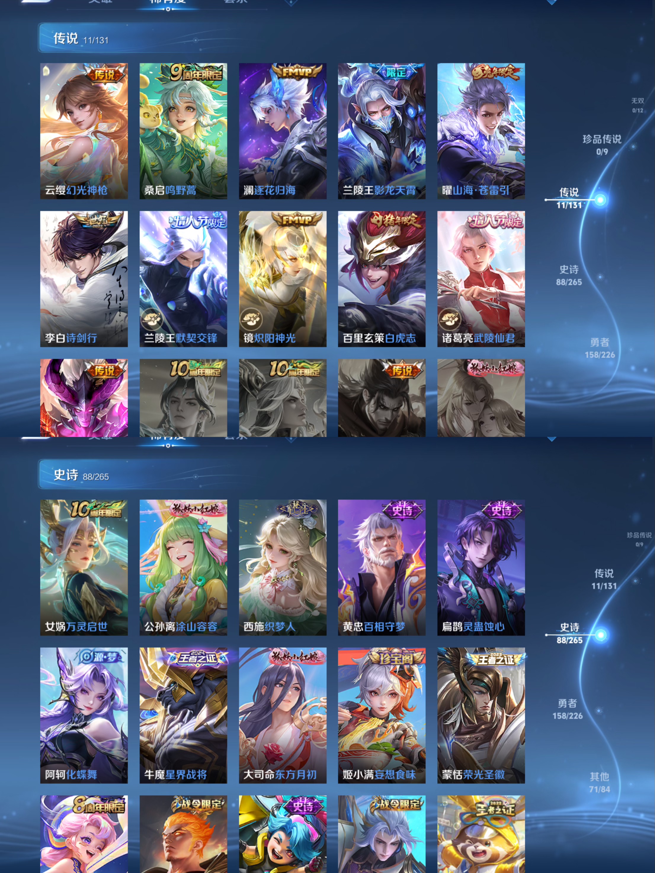 贵族等级:v7皮肤数:330生肖限定4 情人节限定4 传说品质11 荣耀典藏2 英雄数:126