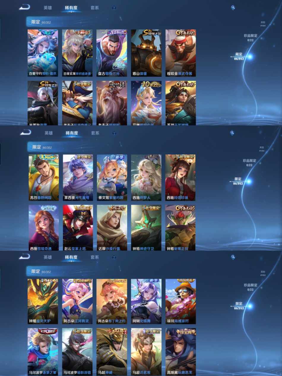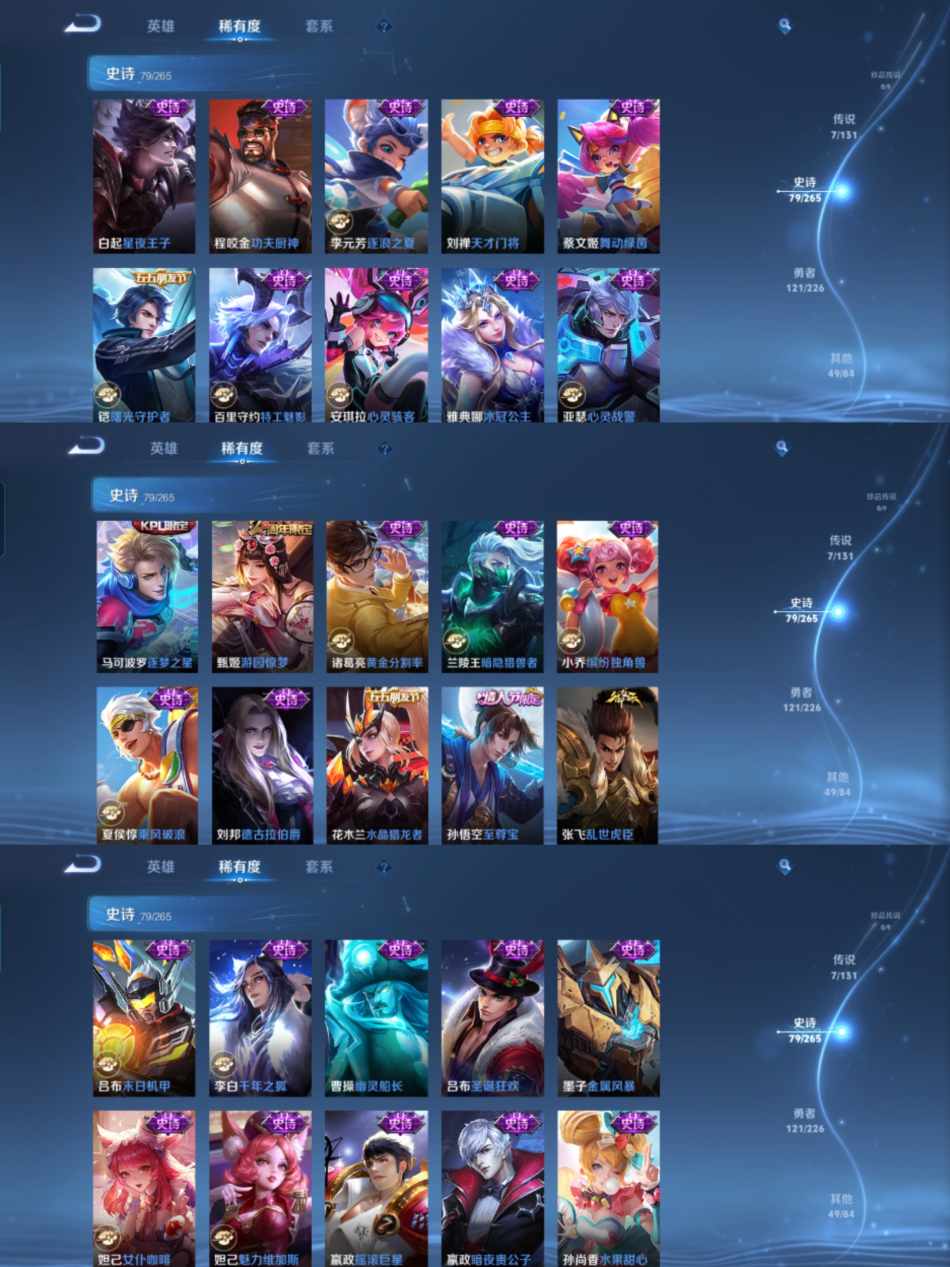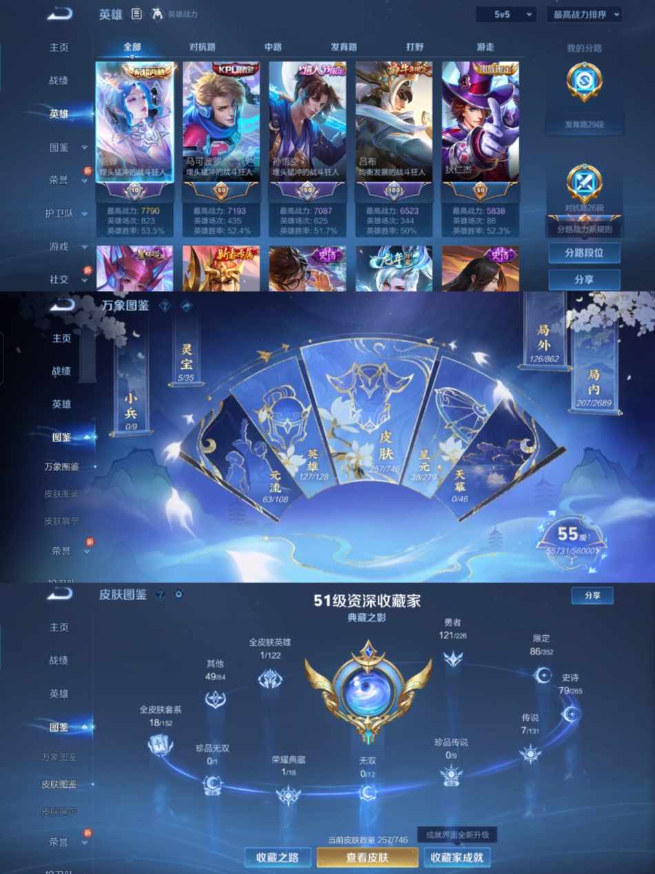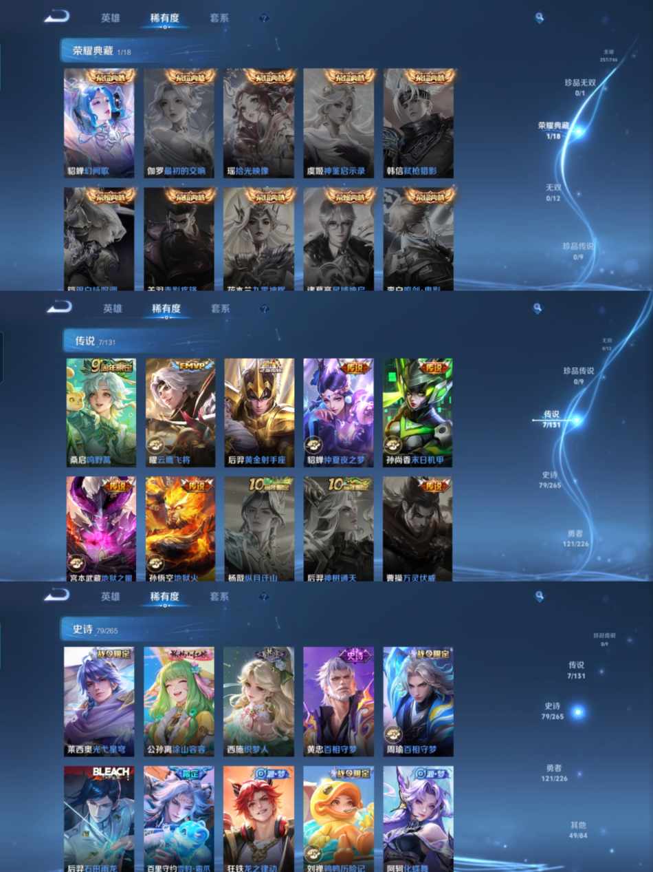 贵族等级:v7皮肤数:257传说品质7 生肖限定1 情人节限定1 荣耀典藏1 英雄数:127