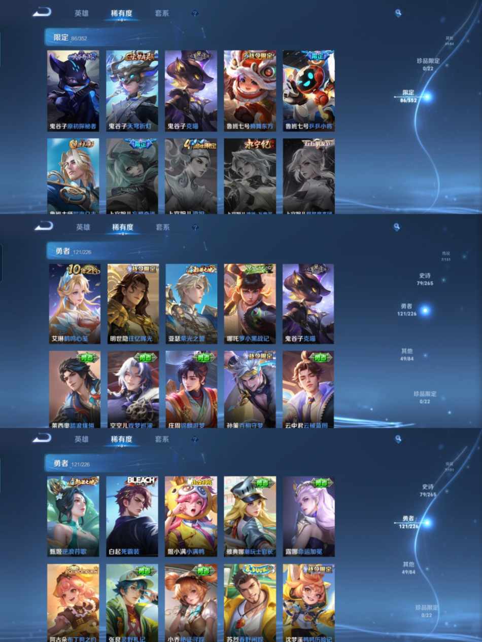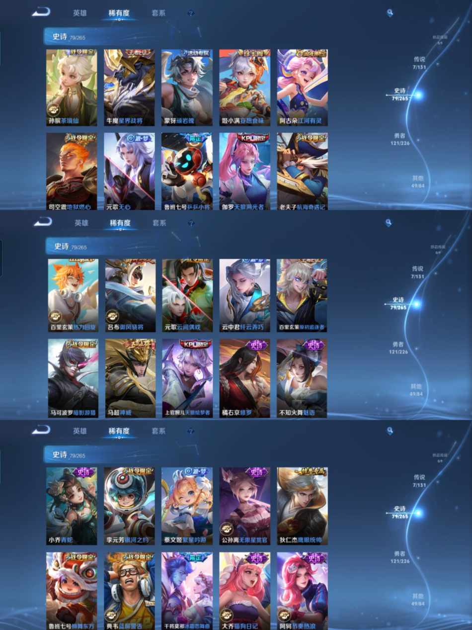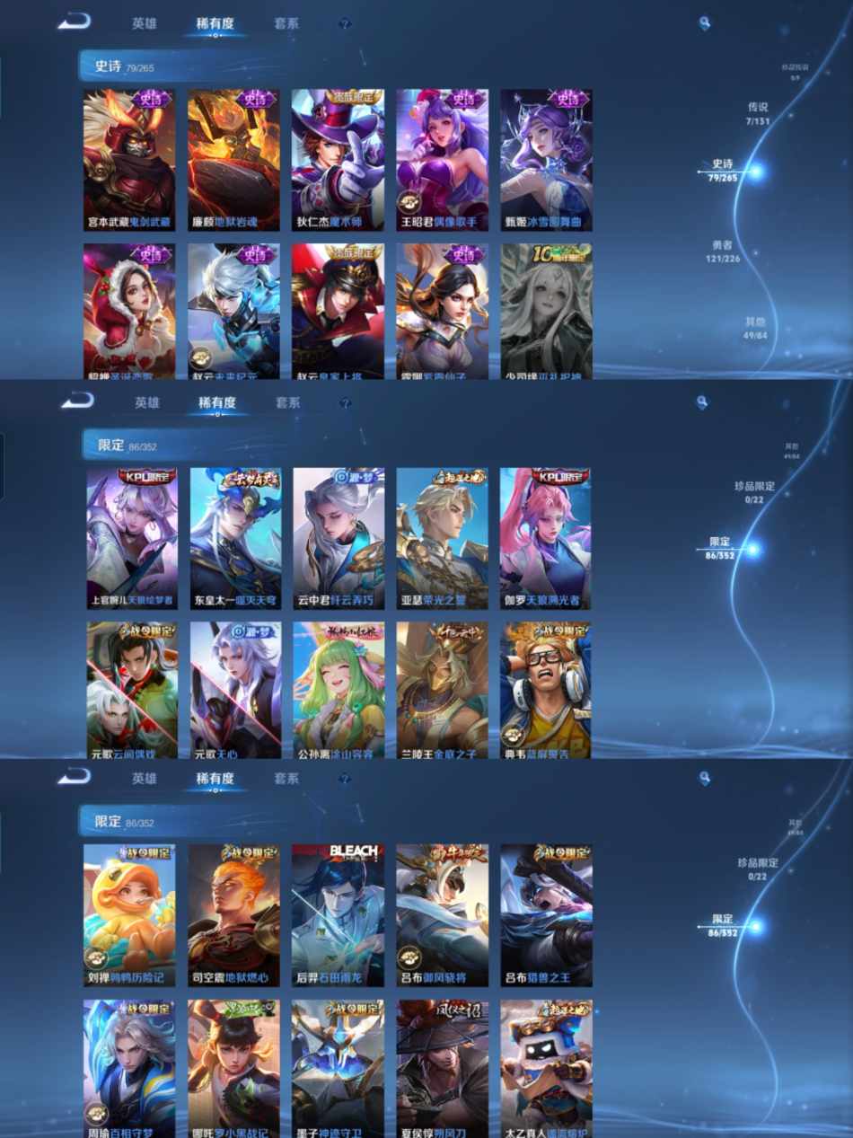 贵族等级:v7皮肤数:257传说品质7 生肖限定1 情人节限定1 荣耀典藏1 英雄数:127