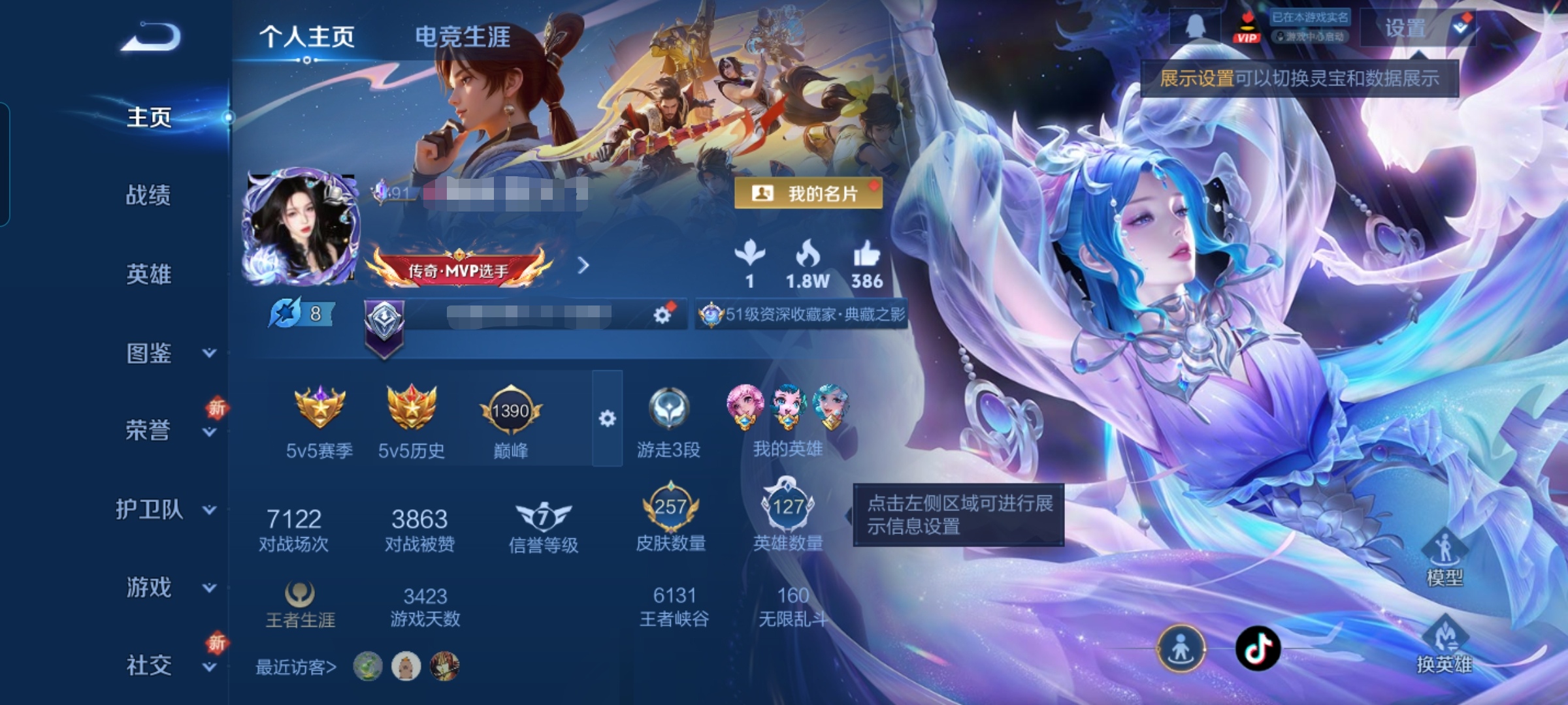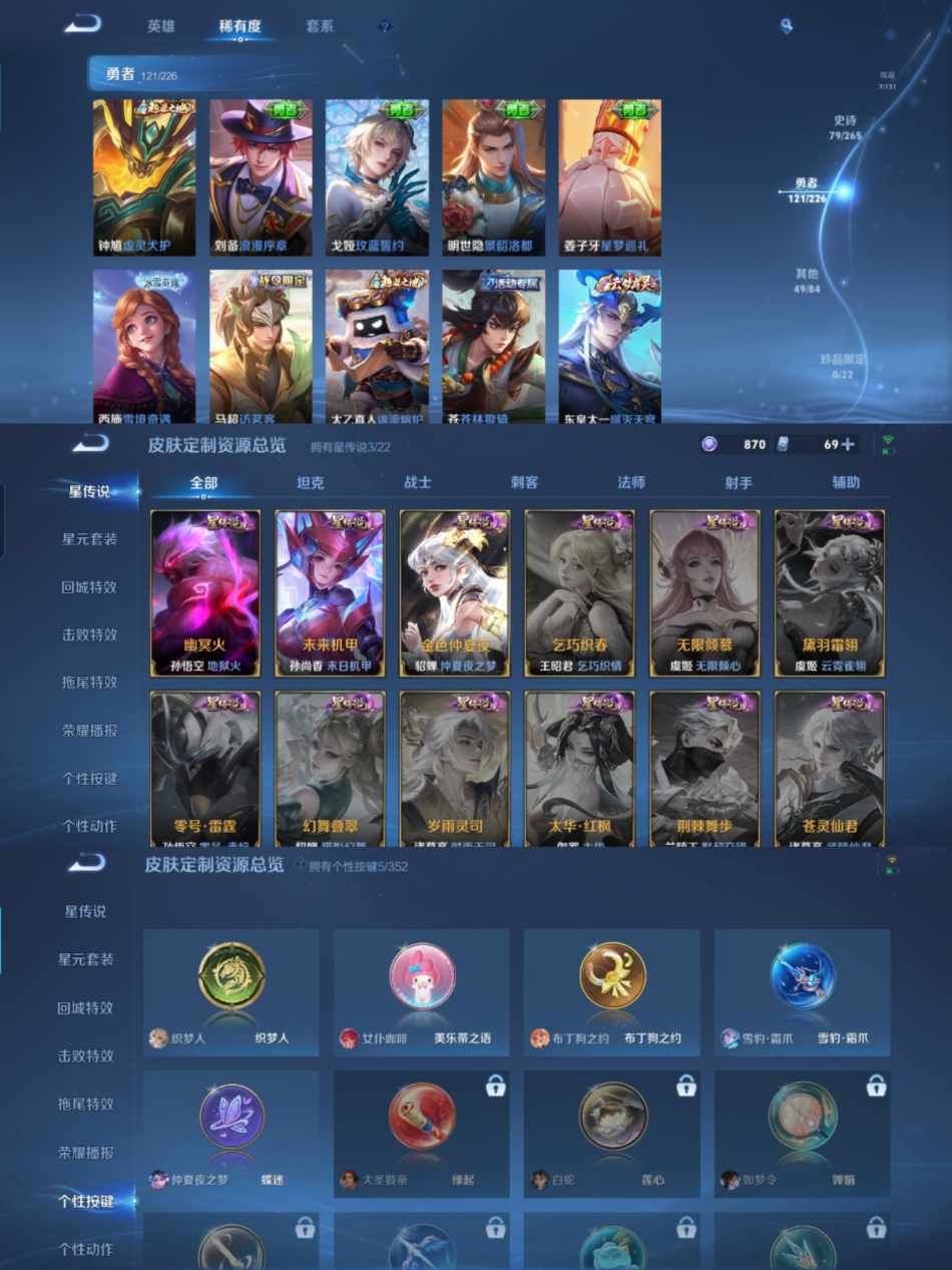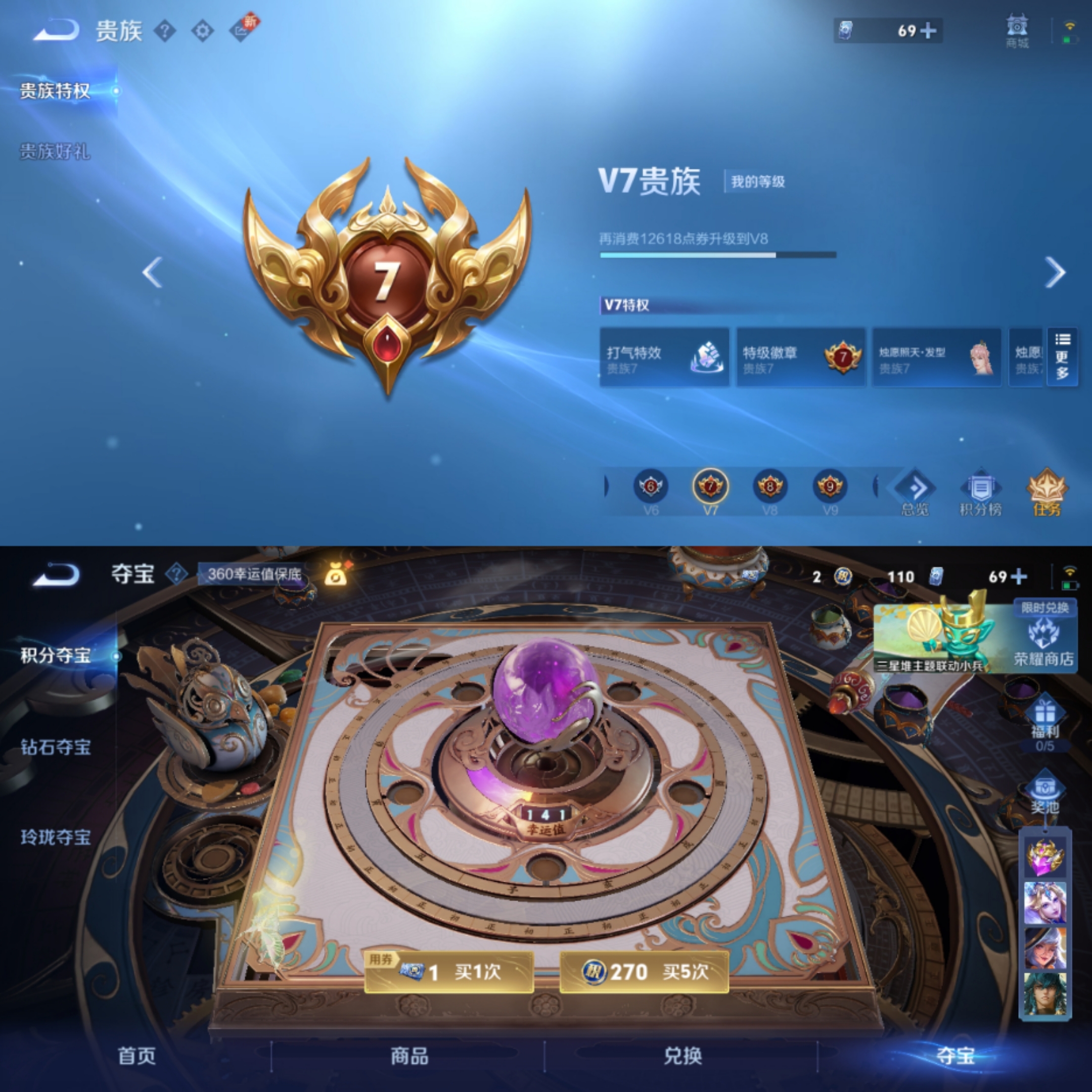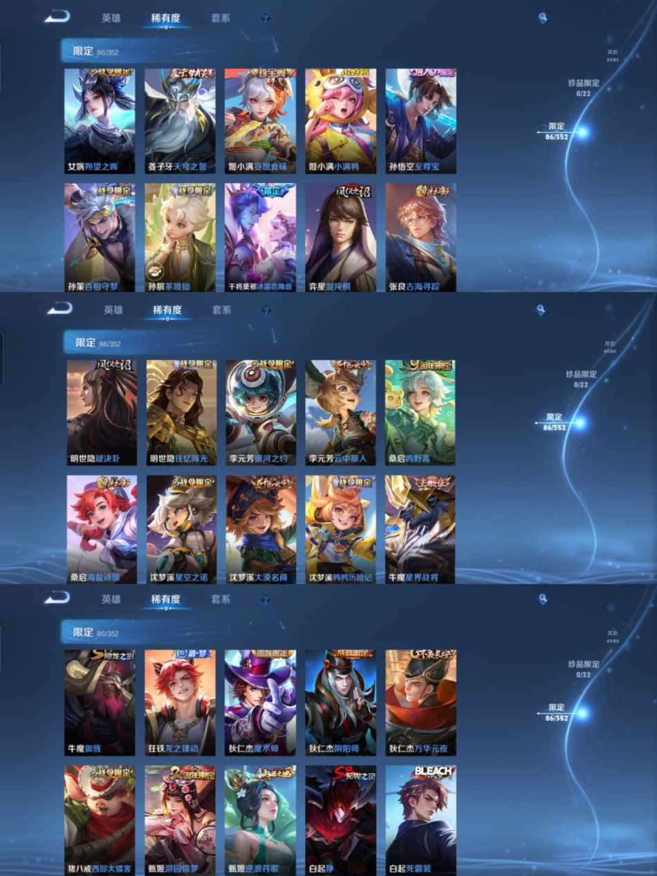 贵族等级:v7皮肤数:257传说品质7 生肖限定1 情人节限定1 荣耀典藏1 英雄数:127