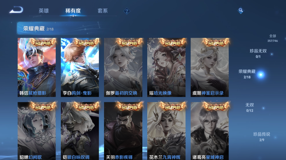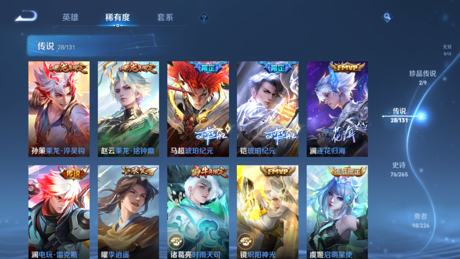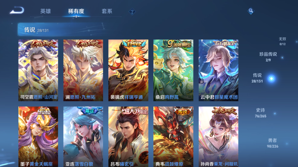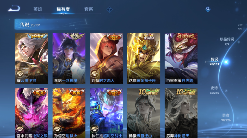 传说品质_司空震_愿照·山河定传说品质_云中君_群星魔术团传说品质_澜_电玩·雷克斯传说品质_澜_逐花归海传说品质_澜_愿照·九州拓传说品质_典韦_战鼓燎原传说品质_墨子_黄金天蝎座传说品质_诸葛亮_时雨天司传说品质_吕布_曦玄引传说品质_孙悟空_地狱火传说品质_马超_琥珀纪元传说品质_宫本武藏_地狱之眼传说品质_镜_炽阳神光传说品质_亚连_落雪白狼传说品质_李信_一念神魔传说品质_孙尚香_乘龙·问璇玑传说品质_曜_云鹰飞将传说品质_曜_李逍遥 传说品质_孙策_乘龙·淬吴钩传说品质_达摩_黄金狮子座传说品质_狄仁杰_超时空战士传说品质_桑启_鸣野蒿传说品质_铠_琥珀纪元传说品质_虞姬_启明星使传说品质_刘备_时之恋人传说品质_百里玄策_白虎志传说品质_裴擒虎_祥瑞亨通传说品质_赵云_乘龙·铭钟鼎