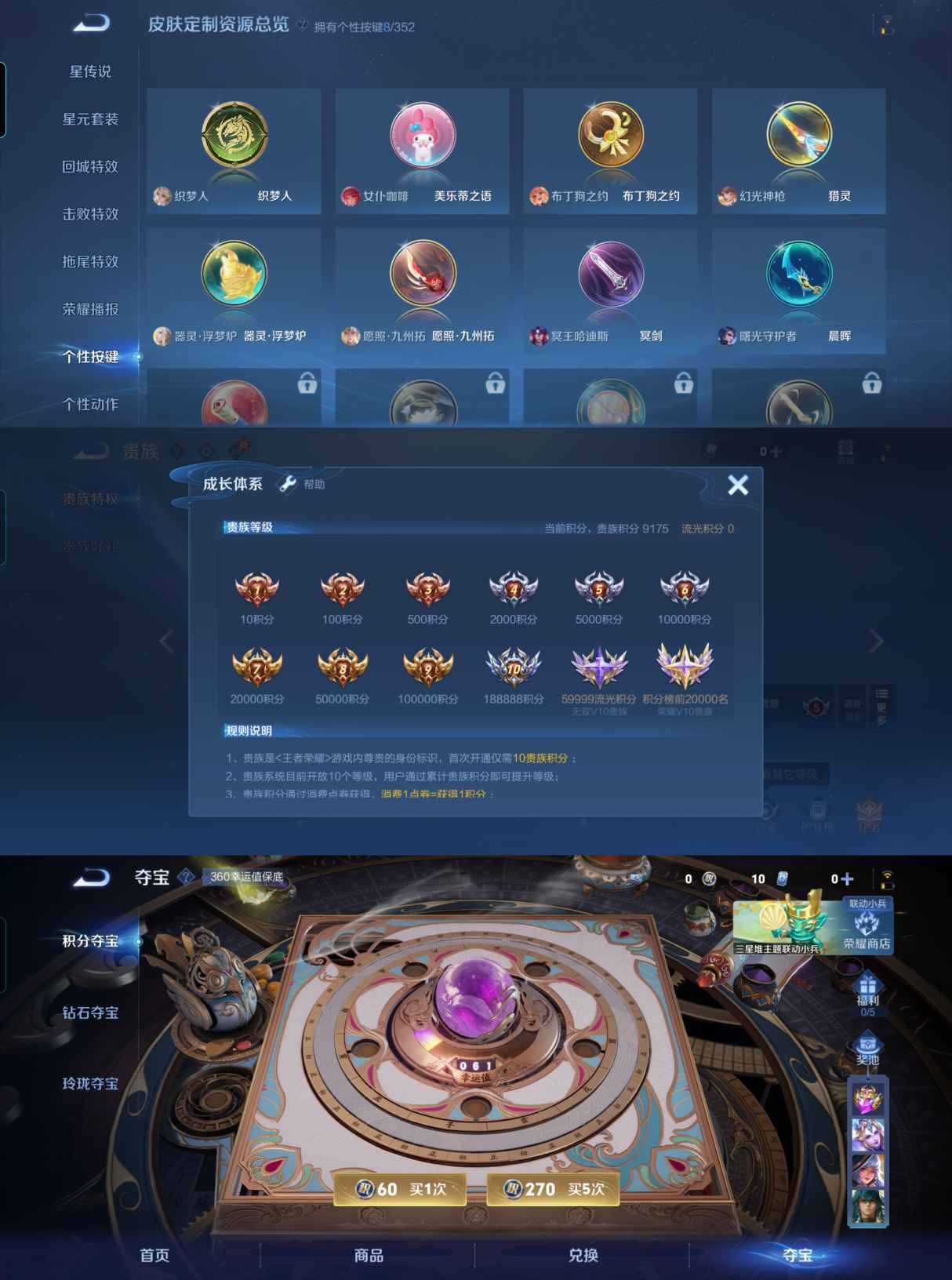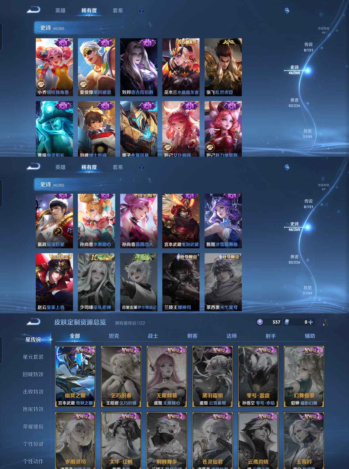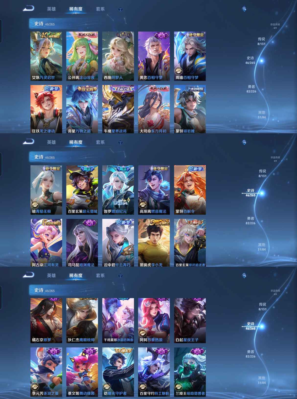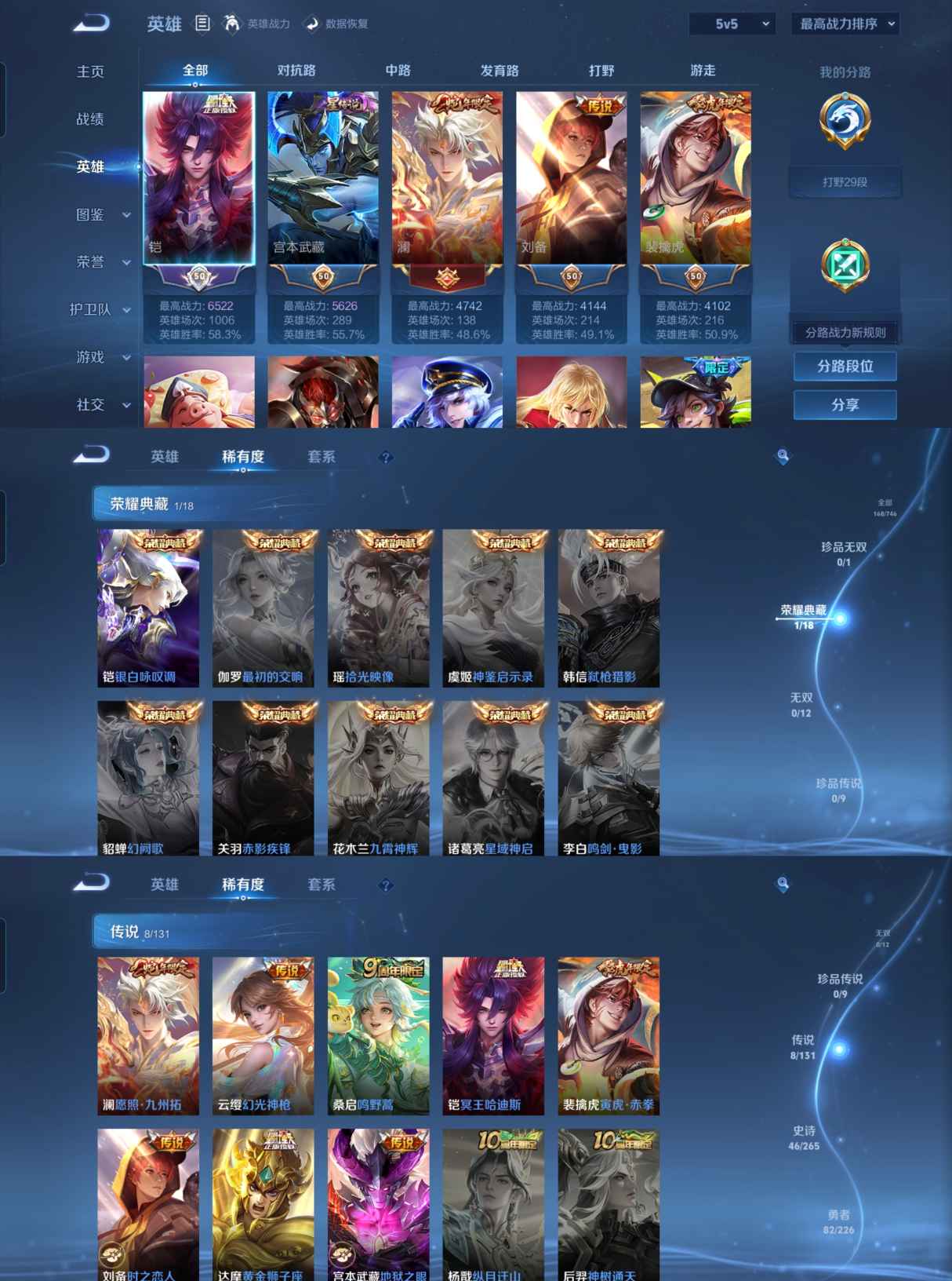 贵族等级:v6皮肤数:168传说品质8 生肖限定2 荣耀典藏1 英雄数:124