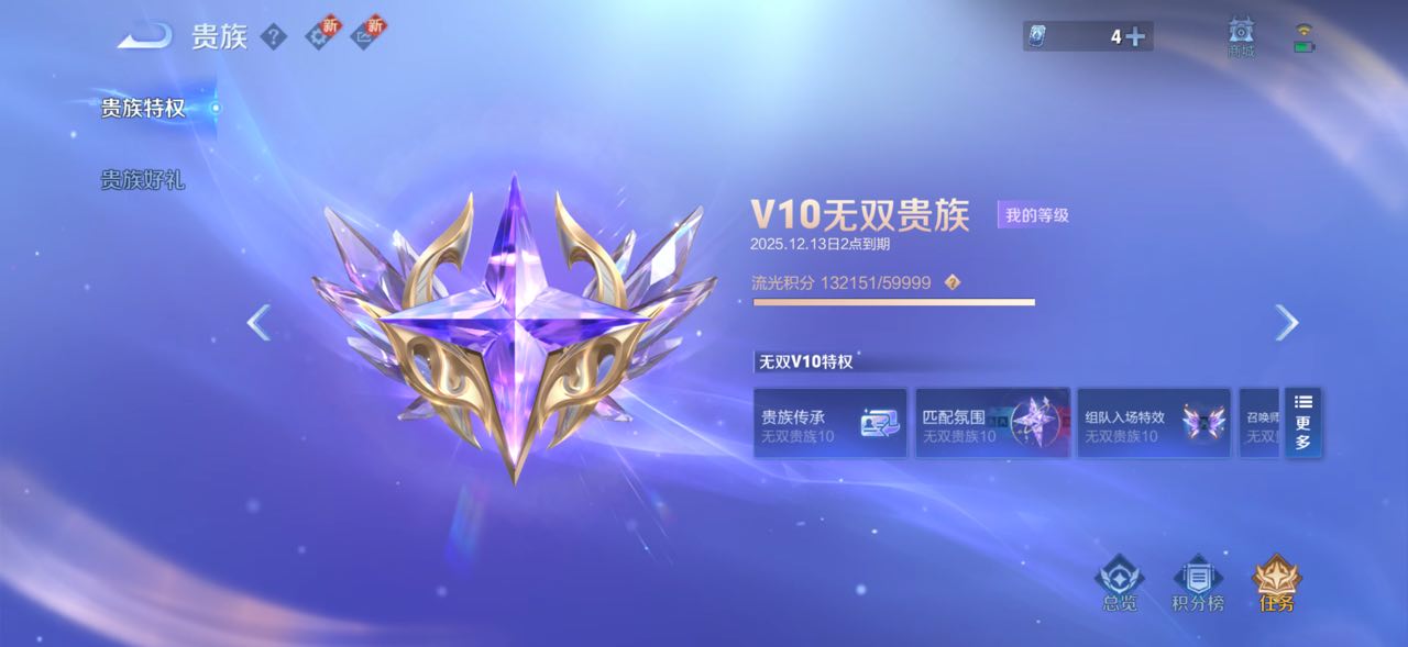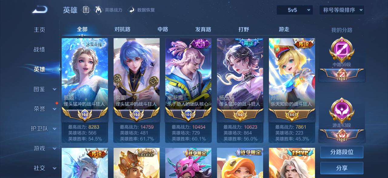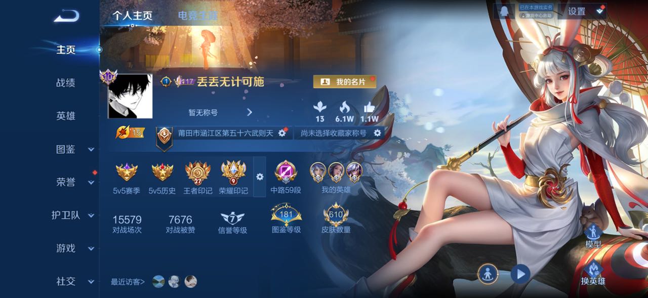 贵族等级:无双v10皮肤数:610传说品质101 情人节限定9 生肖限定32 珍品传说7 荣耀典藏9 无双4 英雄数:128