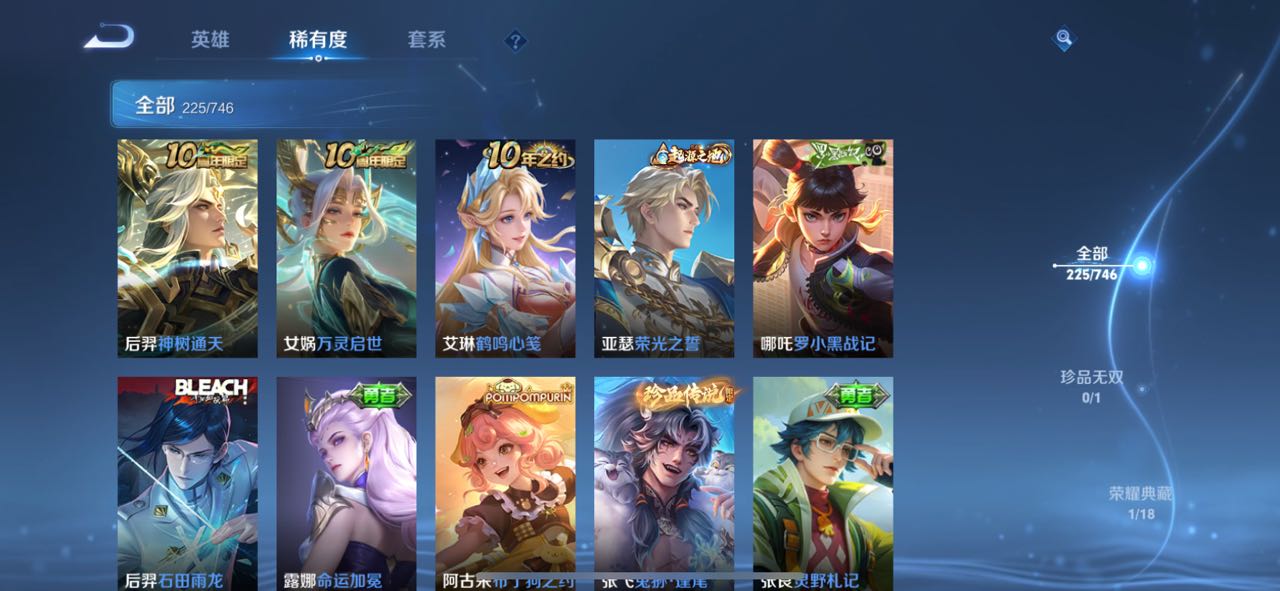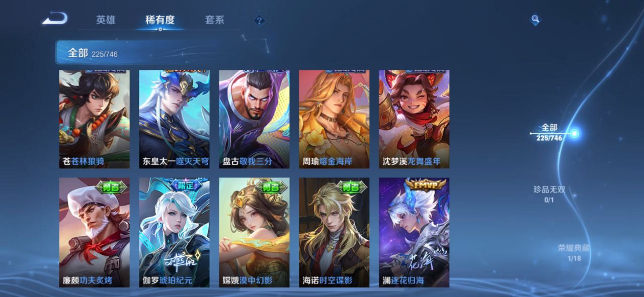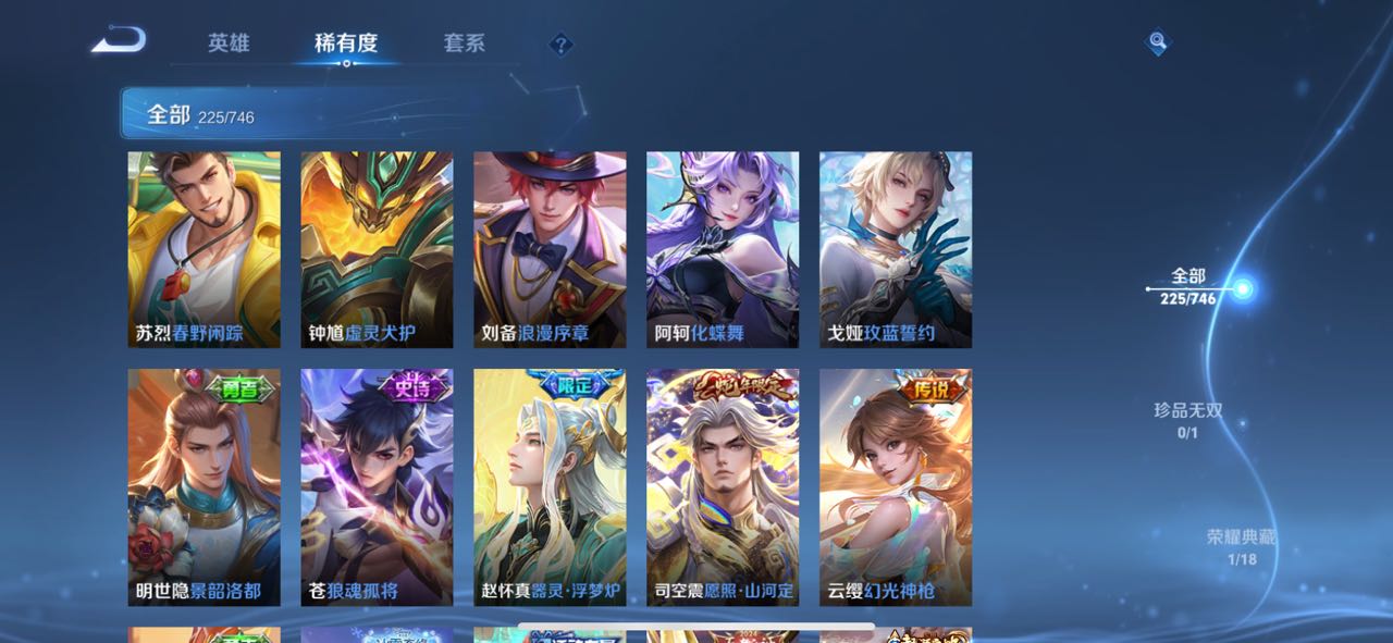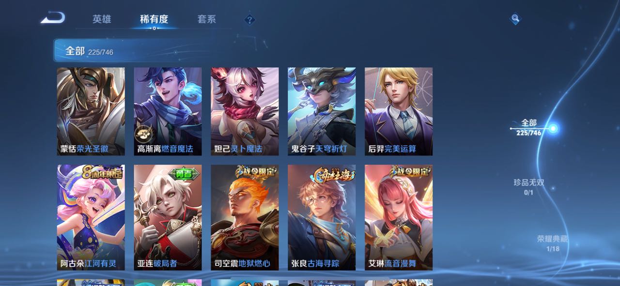 贵族等级:v7皮肤数:225生肖限定3 传说品质12 情人节限定1 荣耀典藏1 珍品传说1 英雄数:126