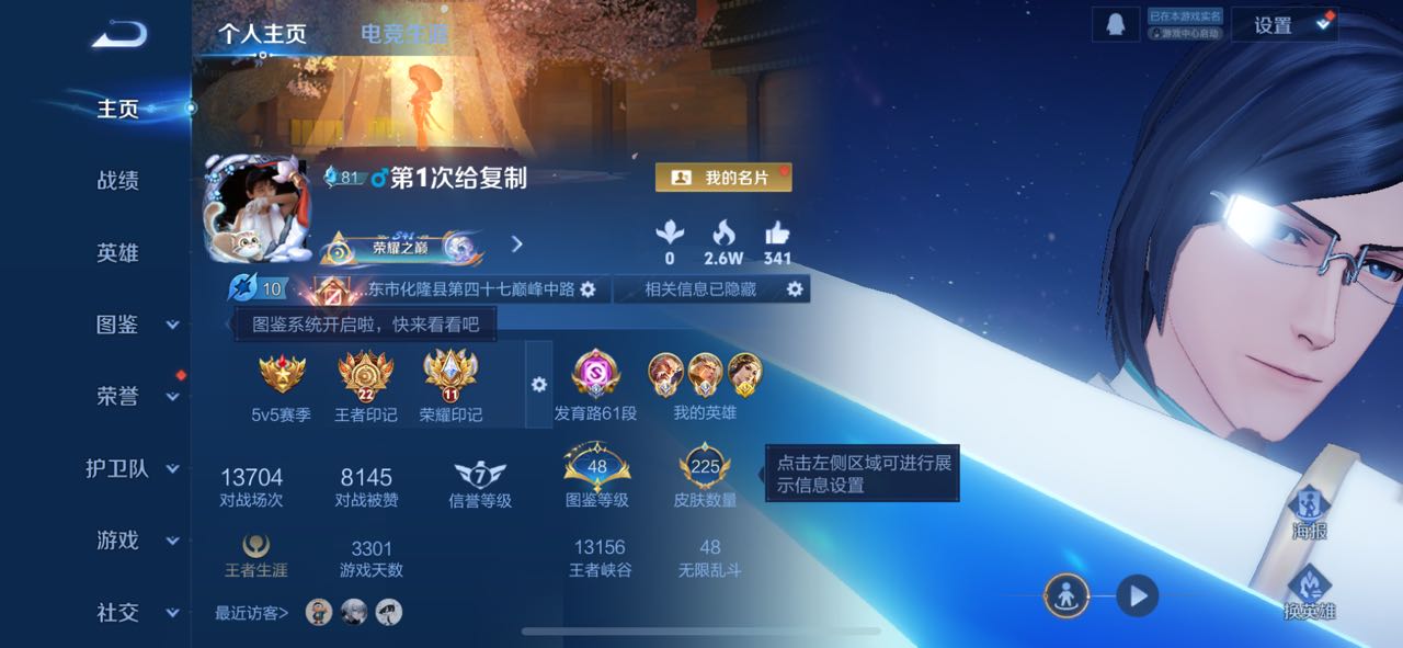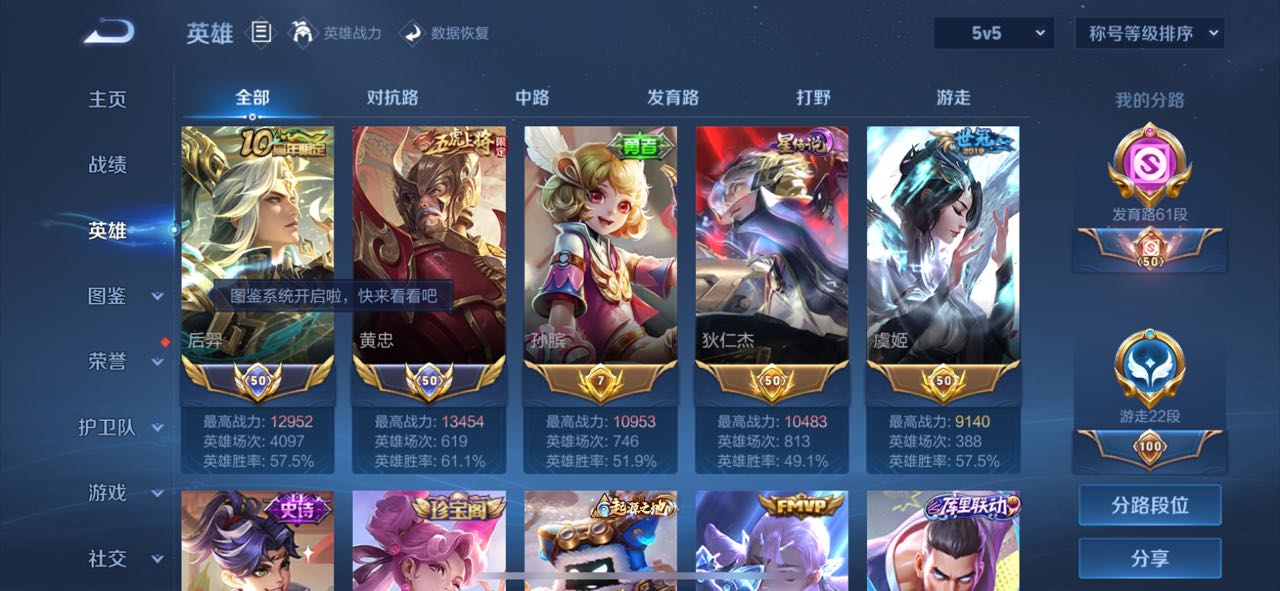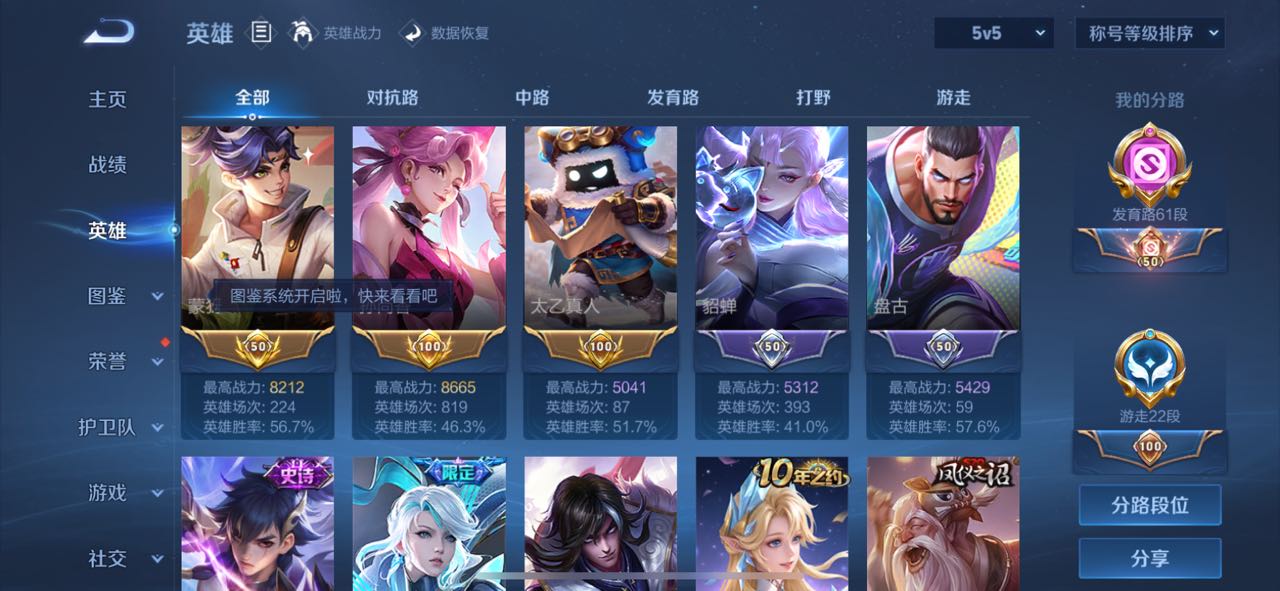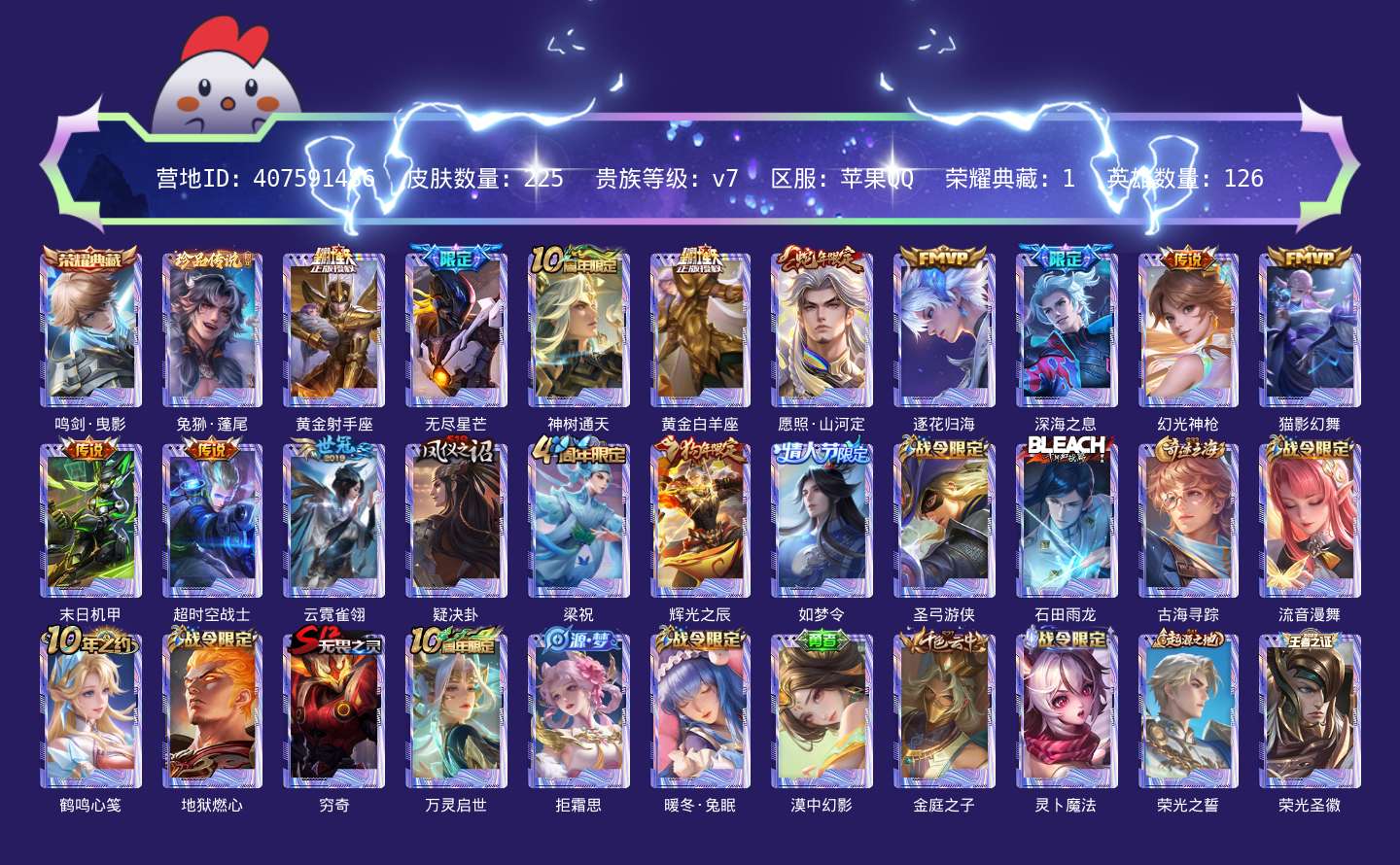 贵族等级:v7皮肤数:225生肖限定3 传说品质12 情人节限定1 荣耀典藏1 珍品传说1 英雄数:126