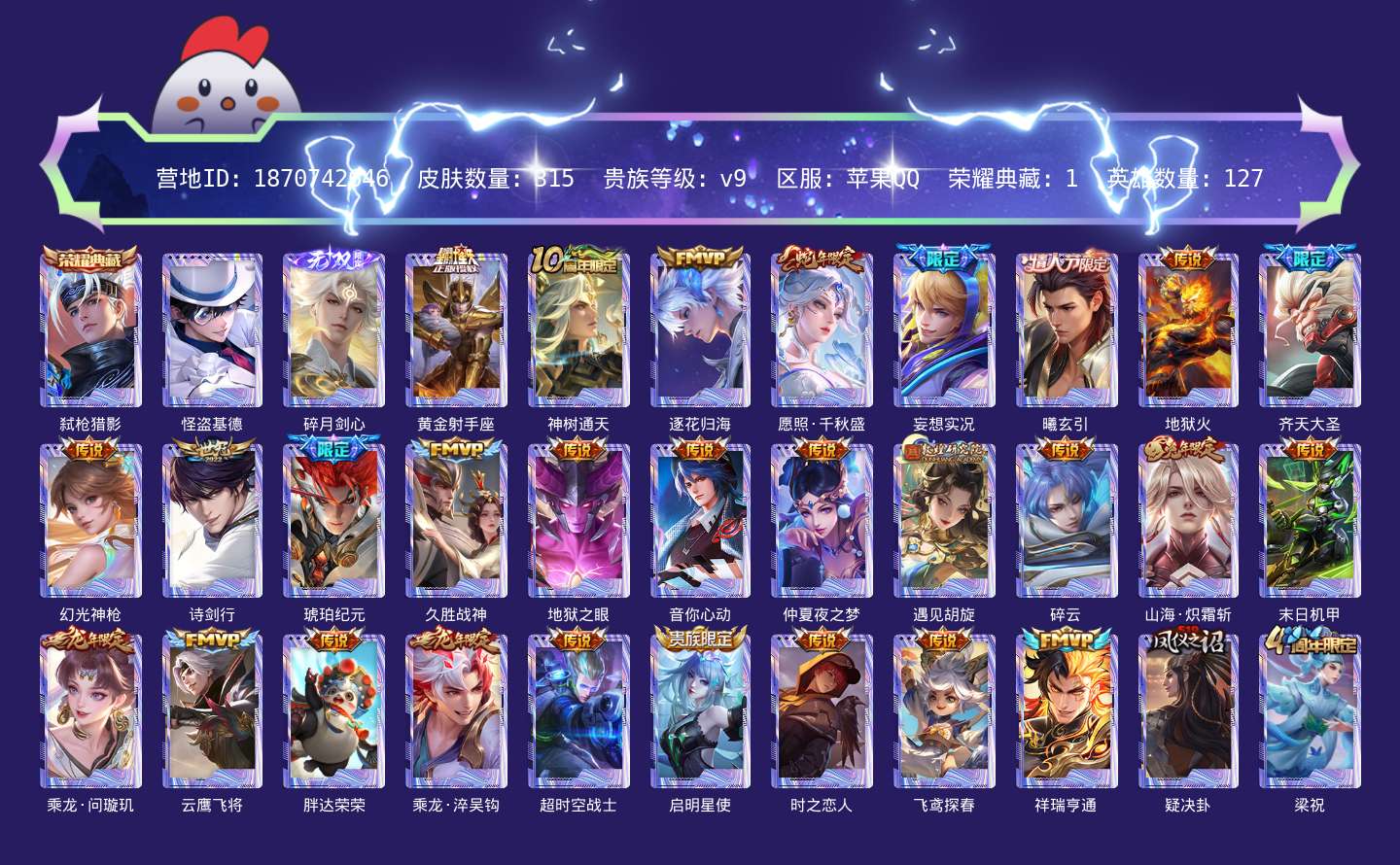 传说品质_后羿_黄金射手座传说品质_后羿_神树通天传说品质_澜_逐花归海传说品质_女娲_愿照·千秋盛传说品质_马可波罗_妄想实况传说品质_吕布_曦玄引传说品质_孙悟空_地狱火传说品质_孙悟空_齐天大圣传说品质_云缨_幻光神枪传说品质_李白_诗剑行传说品质_马超_琥珀纪元传说品质_干将莫邪_久胜战神传说品质_宫本武藏_地狱之眼传说品质_周瑜_音你心动传说品质_貂蝉_仲夏夜之梦传说品质_貂蝉_遇见胡旋传说品质_百里守约_碎云传说品质_李信_山海·炽霜斩传说品质_孙尚香_末日机甲传说品质_孙尚香_乘龙·问璇玑传说品质_曜_云鹰飞将传说品质_梦奇_胖达荣荣传说品质_孙策_乘龙·淬吴钩传说品质_狄仁杰_超时空战士传说品质_虞姬_启明星使传说品质_刘备_时之恋人传说品质_李元芳_飞鸢探春传说品质_裴擒虎_祥瑞亨通