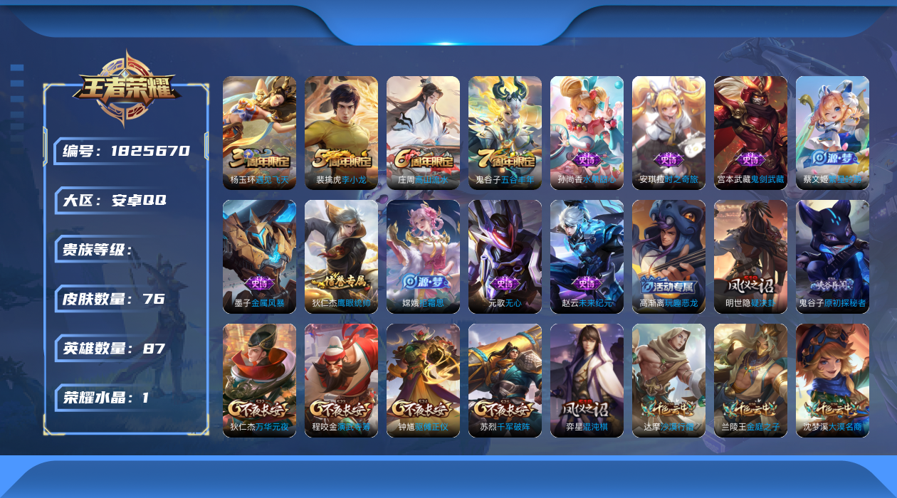 [1825670]实名: 可修改 英雄数: 87 皮肤数: 76 限定皮: 遇见飞天,李小龙,高山流水,五谷丰年