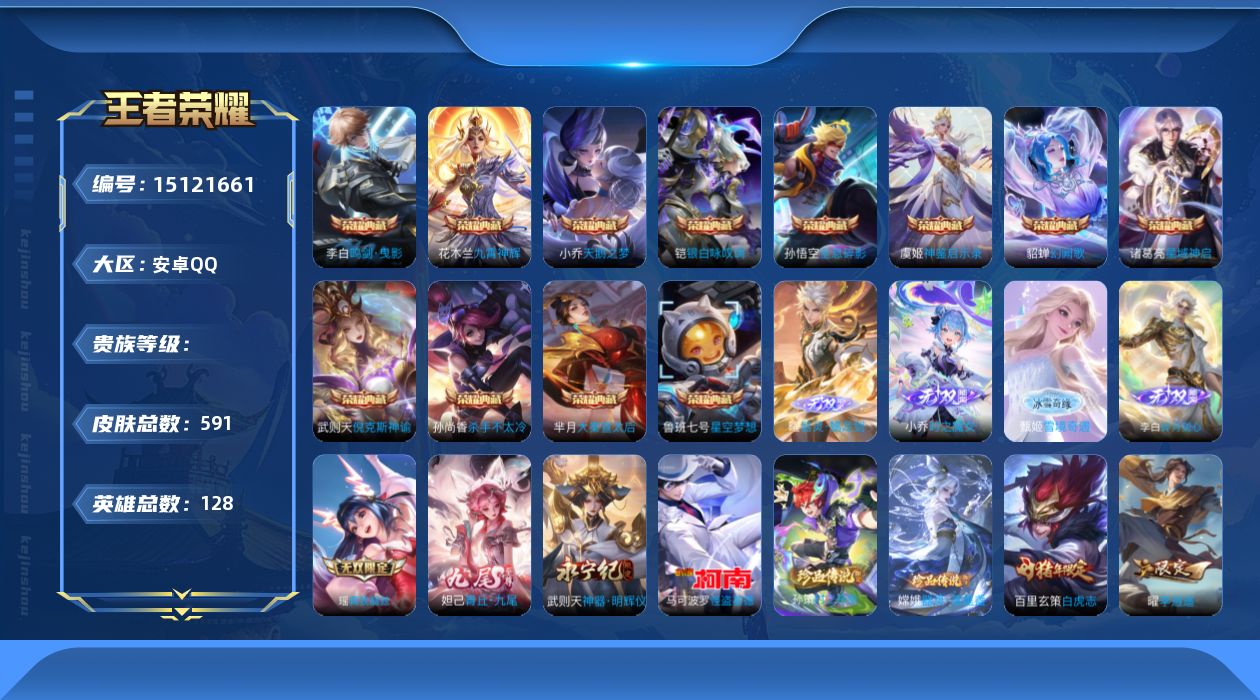 荣耀典藏_诸葛亮_星域神启荣耀典藏_孙悟空_全息碎影荣耀典藏_李白_鸣剑·曳影荣耀典藏_武则天_倪克斯神谕荣耀典藏_花木兰_九霄神辉荣耀典藏_貂蝉_幻阙歌荣耀典藏_孙尚香_杀手不太冷荣耀典藏_小乔_天鹅之梦荣耀典藏_铠_银白咏叹调荣耀典藏_鲁班七号_星空梦想荣耀典藏_虞姬_神鉴启示录荣耀典藏_芈月_大秦宣太后