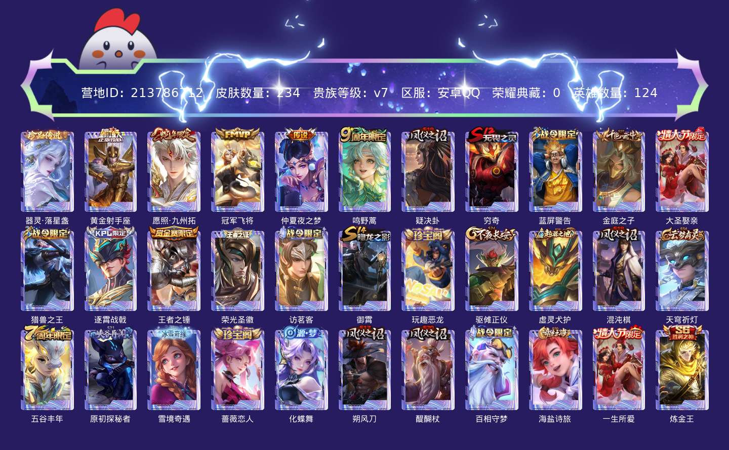 贵族等级:v7皮肤数:235传说品质5 生肖限定1 珍品传说1 情人节限定2 英雄数:124