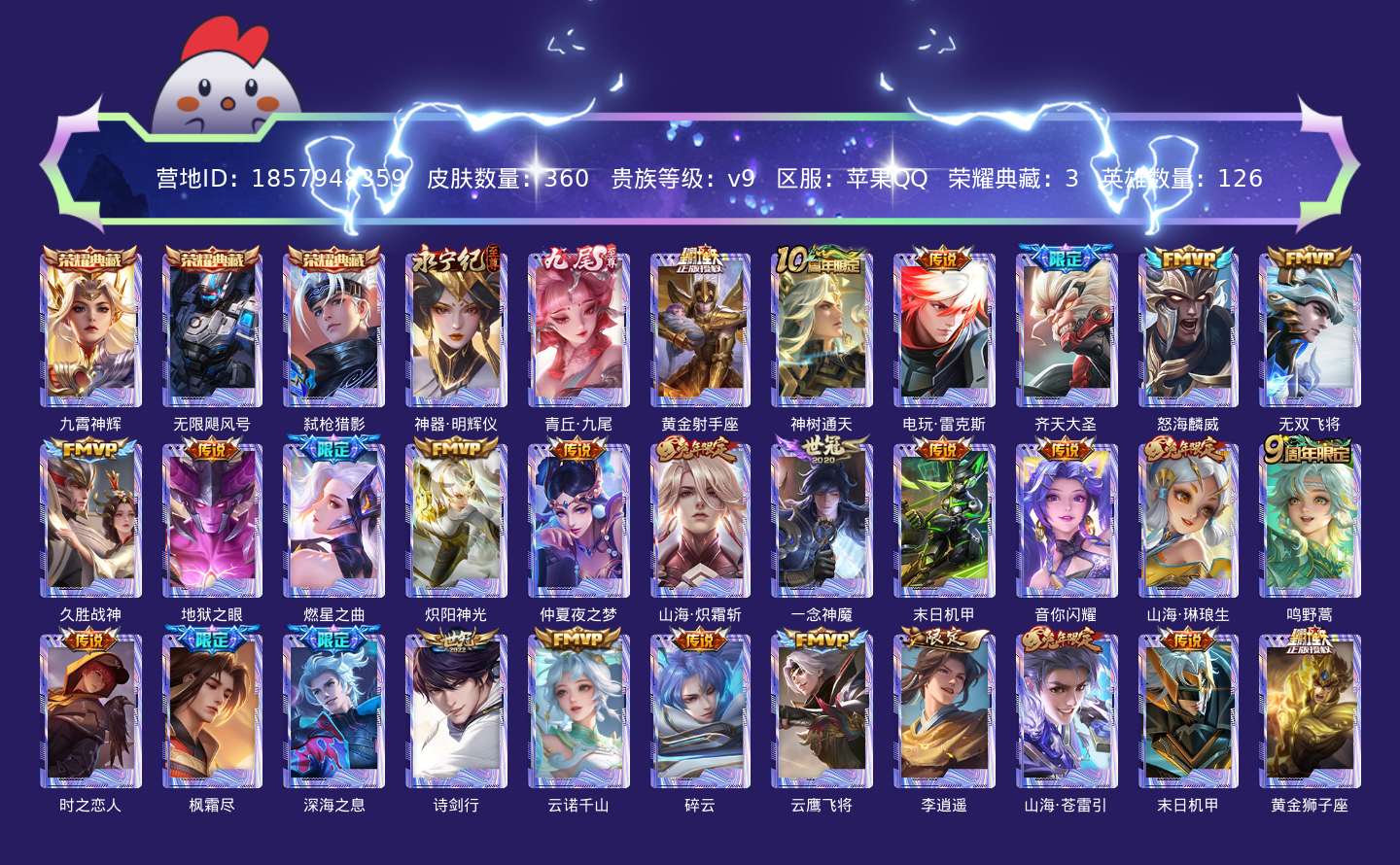 传说品质_后羿_黄金射手座传说品质_后羿_神树通天传说品质_澜_电玩·雷克斯传说品质_马可波罗_深海之息传说品质_吕布_怒海麟威传说品质_孙悟空_齐天大圣传说品质_李白_诗剑行传说品质_马超_无双飞将传说品质_干将莫邪_久胜战神传说品质_宫本武藏_地狱之眼传说品质_花木兰_燃星之曲传说品质_镜_炽阳神光传说品质_公孙离_云诺千山传说品质_貂蝉_仲夏夜之梦传说品质_百里守约_碎云传说品质_李信_山海·炽霜斩传说品质_李信_一念神魔传说品质_孙尚香_末日机甲传说品质_孙尚香_音你闪耀传说品质_小乔_山海·琳琅生传说品质_曜_云鹰飞将传说品质_曜_李逍遥 传说品质_曜_山海·苍雷引传说品质_孙策_末日机甲传说品质_达摩_黄金狮子座传说品质_桑启_鸣野蒿传说品质_虞姬_启明星使传说品质_刘备_时之恋人传说品质_橘右京_枫霜尽传说品质_裴擒虎_祥瑞亨通传说品质_赵云_淬星耀世