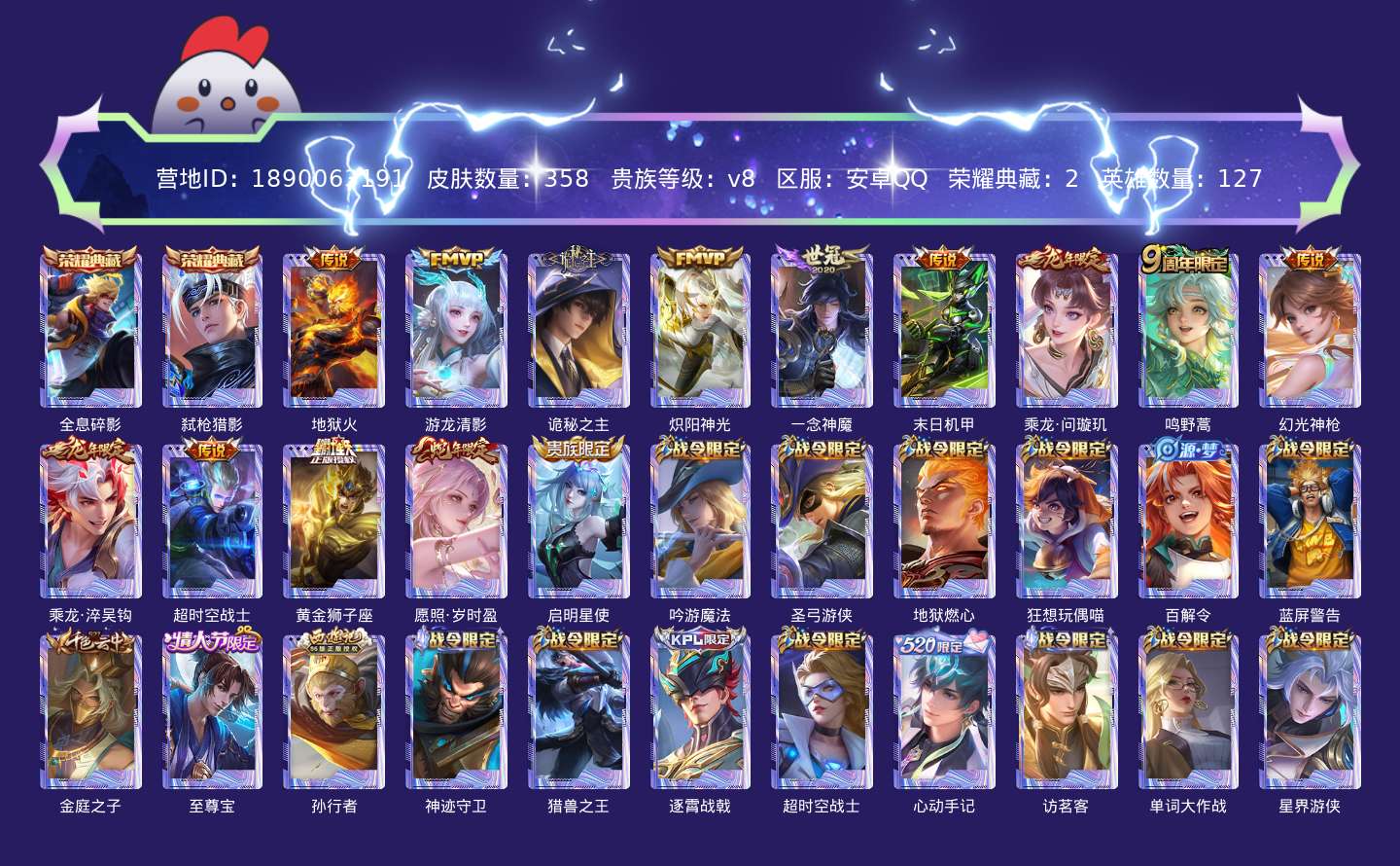 贵族等级:v8皮肤数:358生肖限定6 情人节限定1 荣耀典藏2 传说品质14 英雄数:127