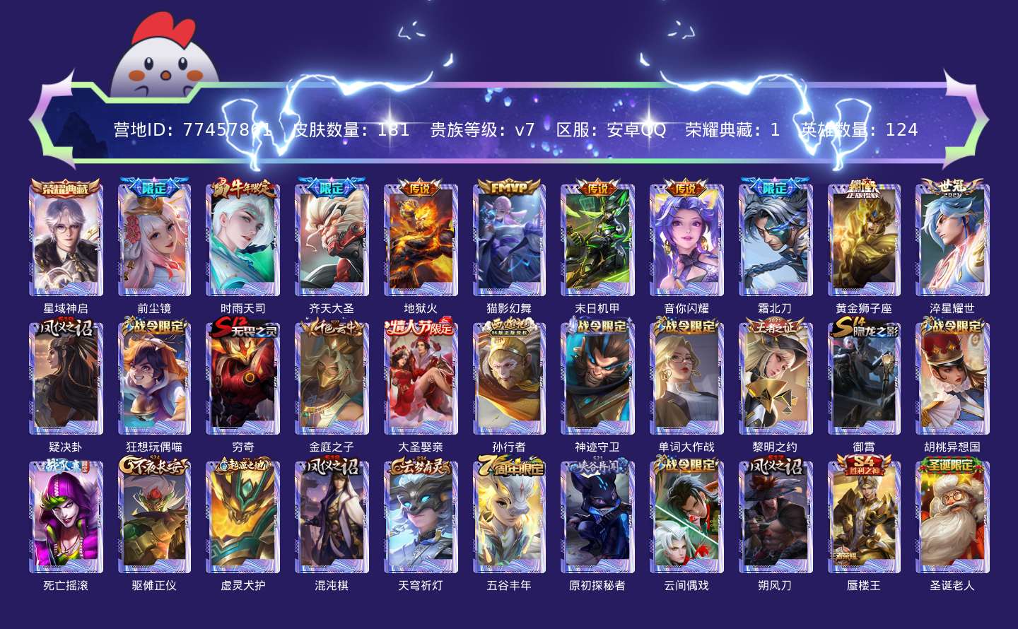 贵族等级:v7皮肤数:181传说品质10 生肖限定1 荣耀典藏1 情人节限定1 英雄数:124