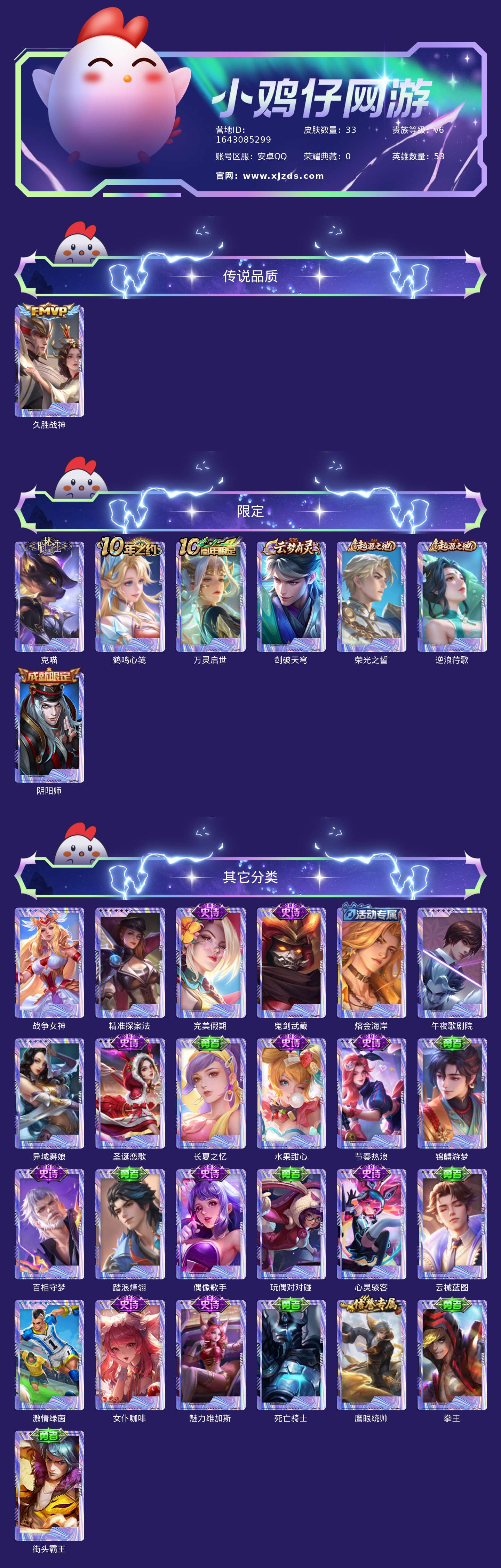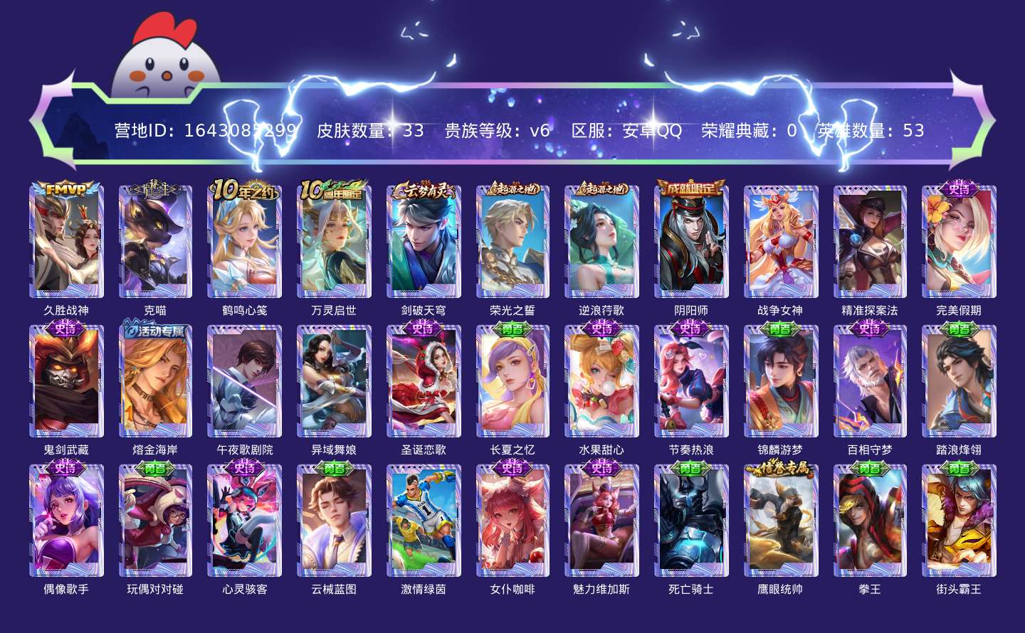 贵族等级:v6皮肤数:33传说品质1 英雄数:53