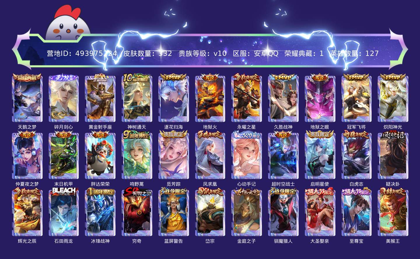 贵族等级:v10皮肤数:332生肖限定11 传说品质19 情人节限定2 无双1 荣耀典藏1 英雄数:127
