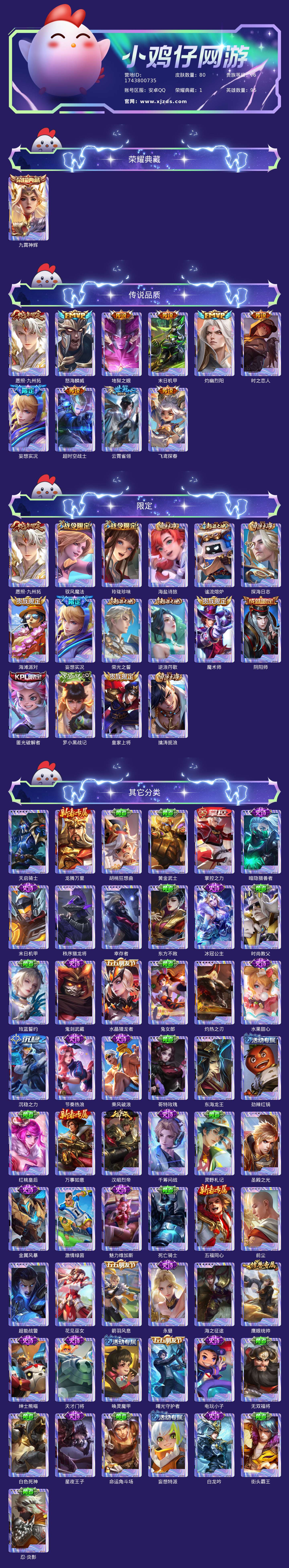 贵族等级:v6皮肤数:80传说品质10 生肖限定1 荣耀典藏1 英雄数:95