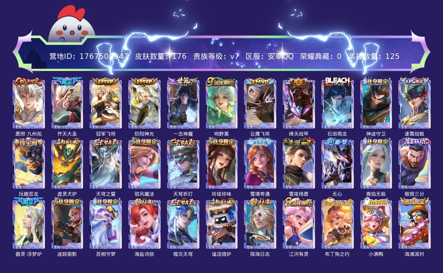 贵族等级:v7皮肤数:176传说品质8 生肖限定3 英雄数:125