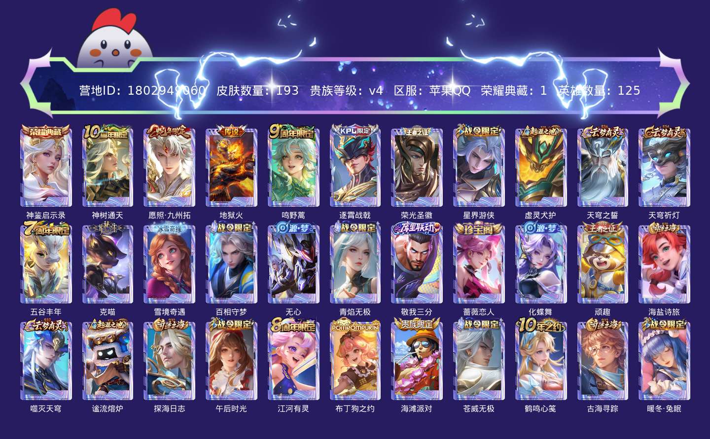 贵族等级:v4皮肤数:193传说品质4 生肖限定2 荣耀典藏1 英雄数:125