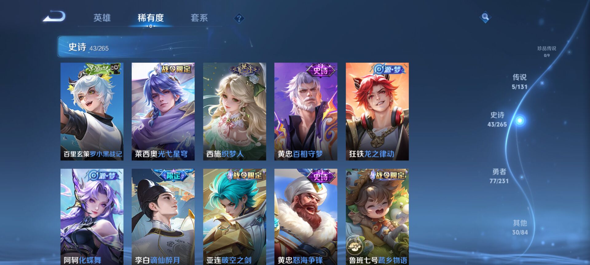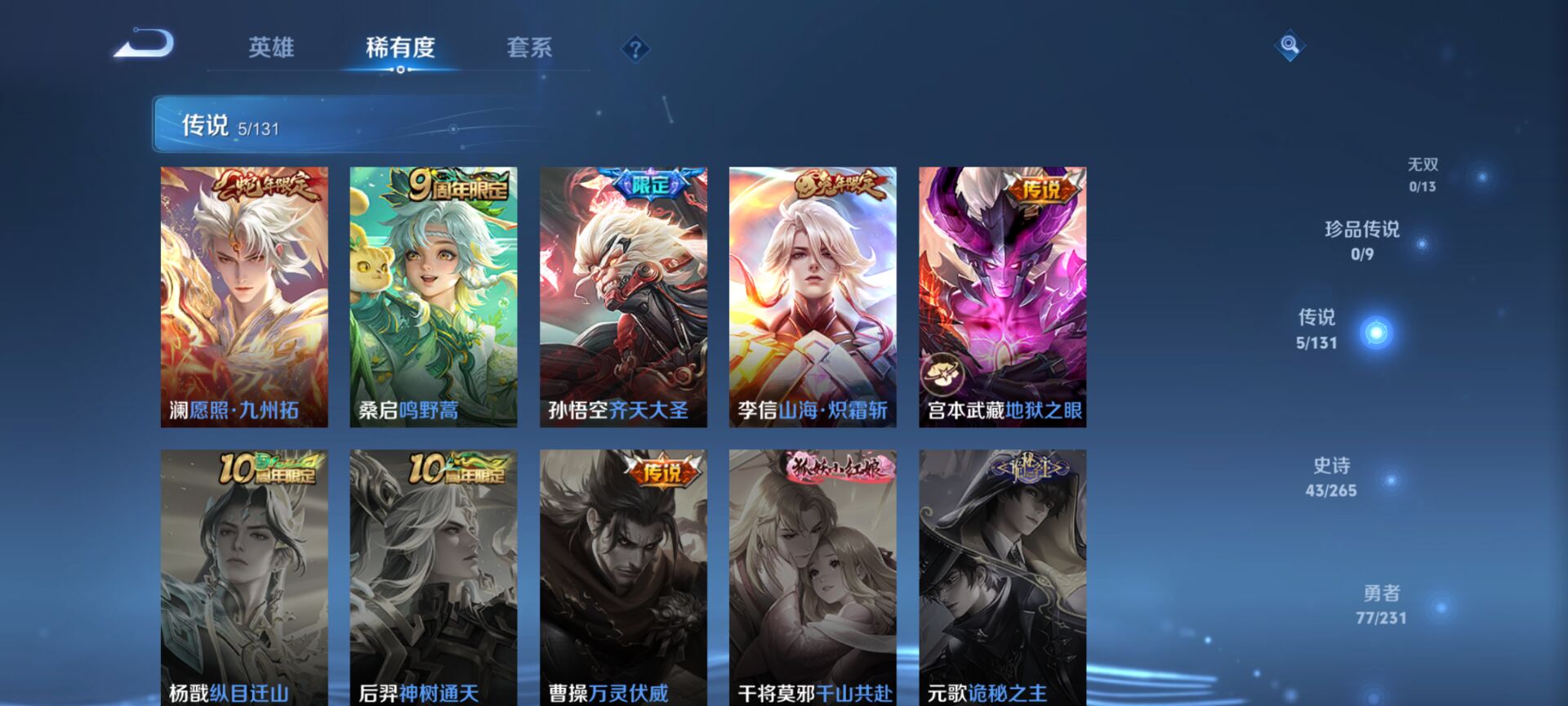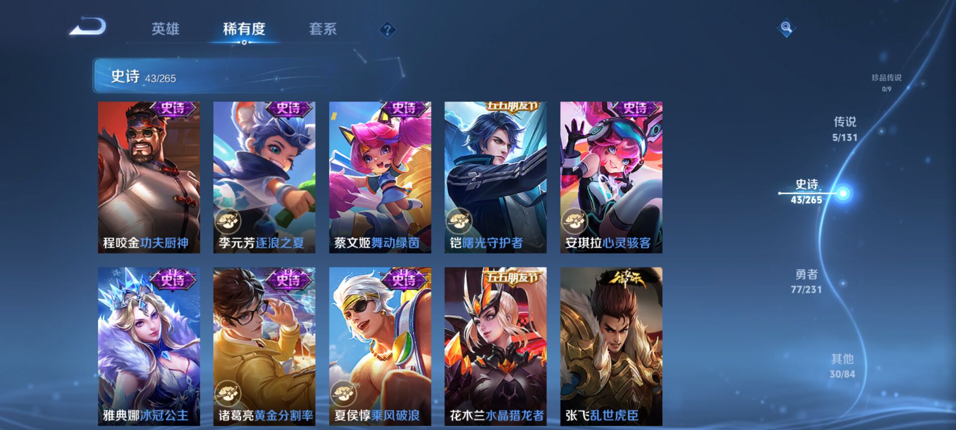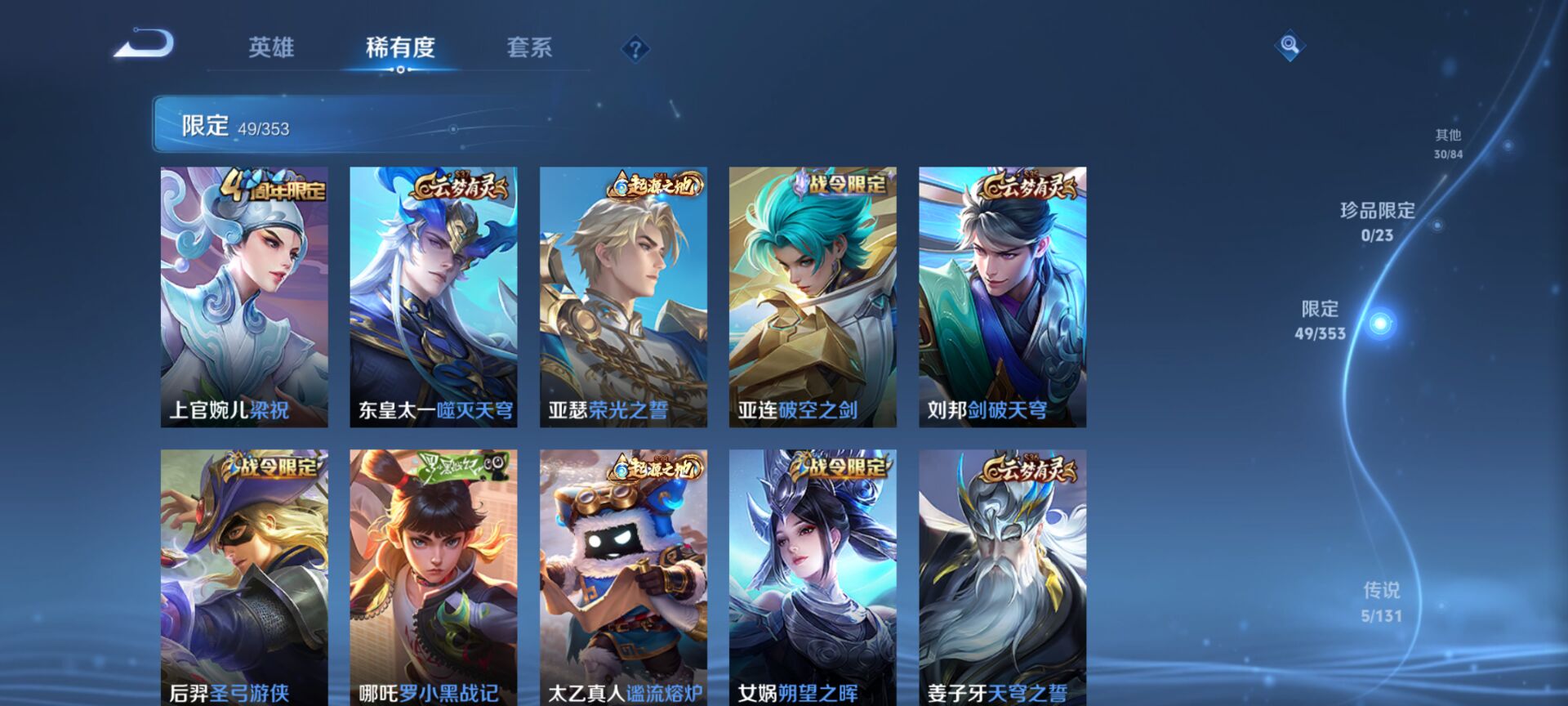 贵族等级:v5皮肤数:157传说品质5 生肖限定2 英雄数:126