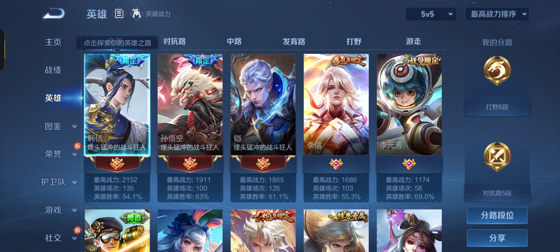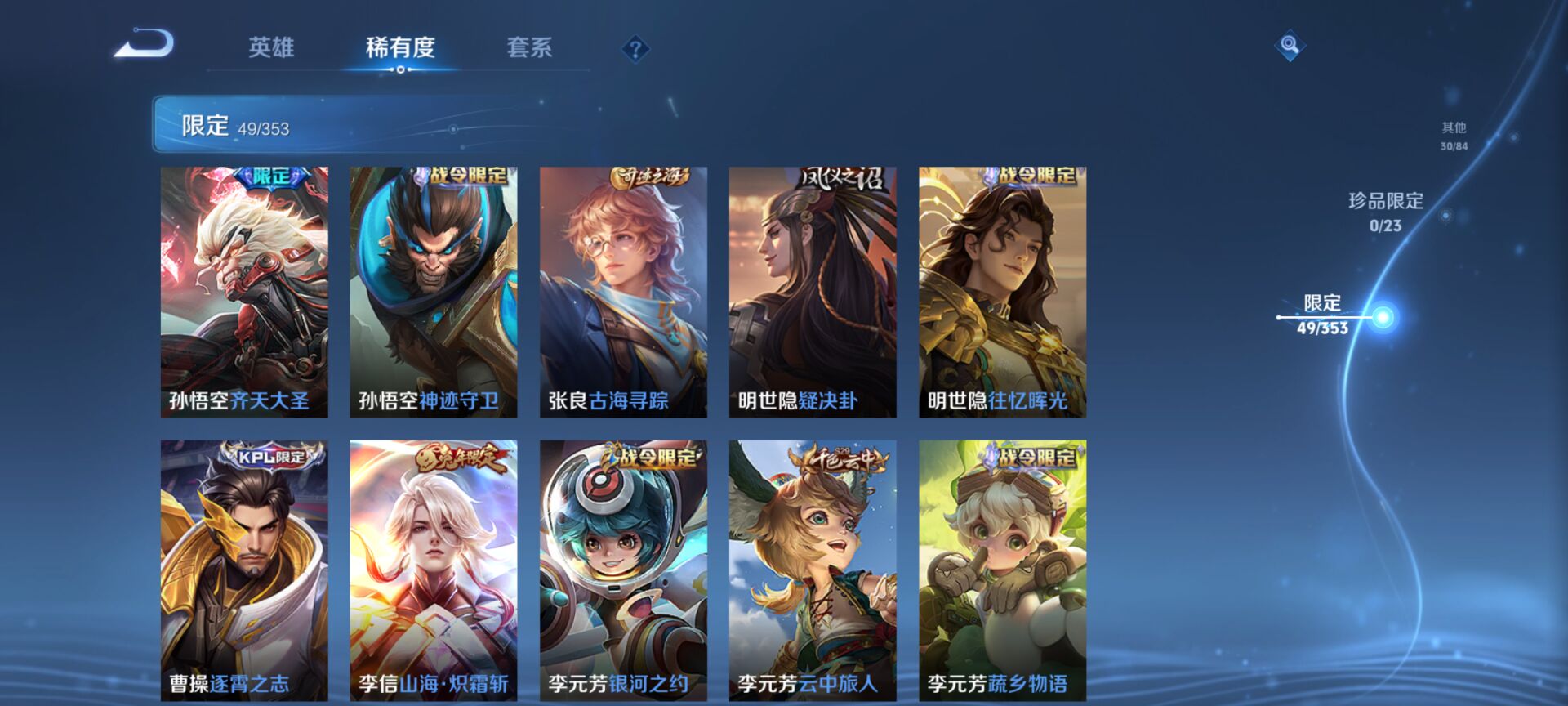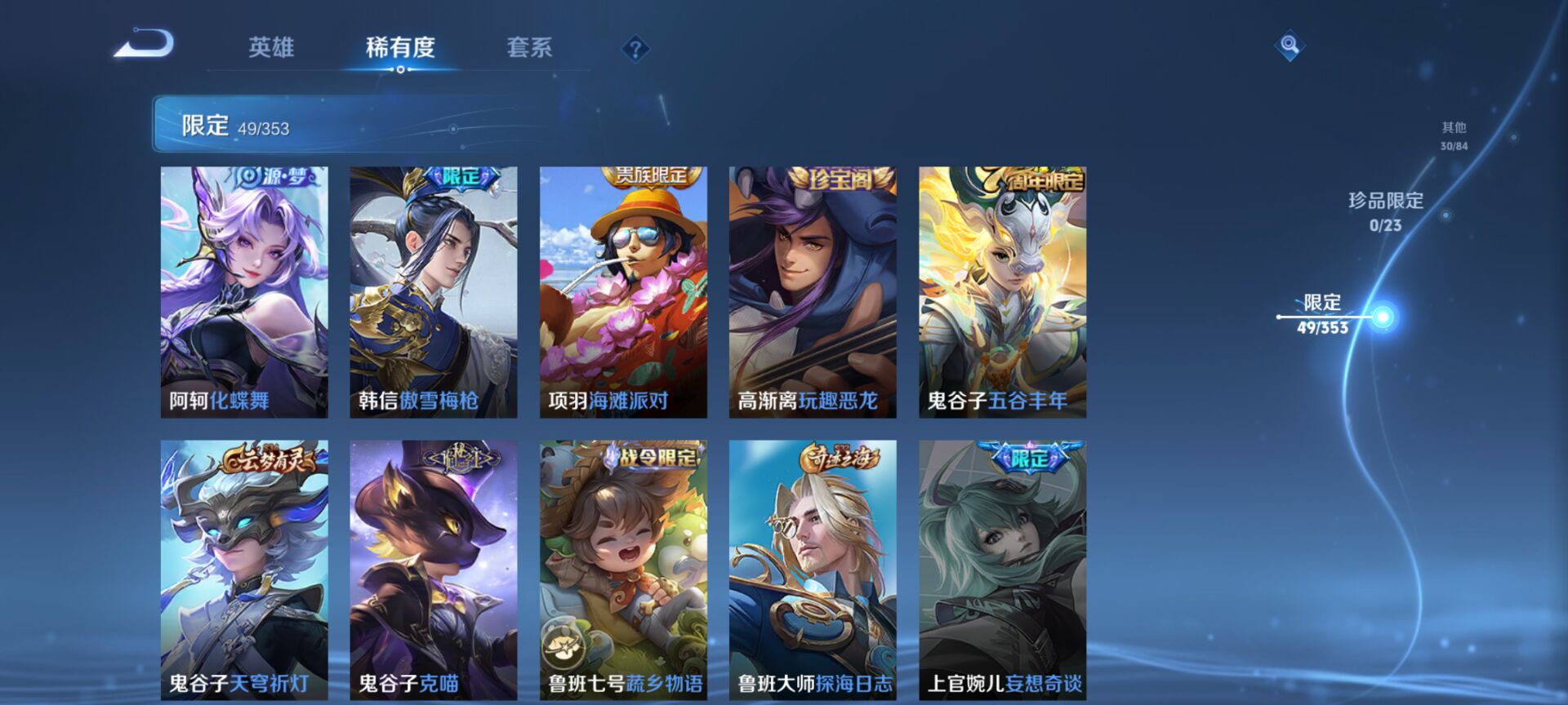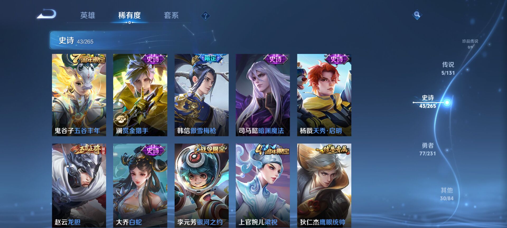 贵族等级:v5皮肤数:157传说品质5 生肖限定2 英雄数:126