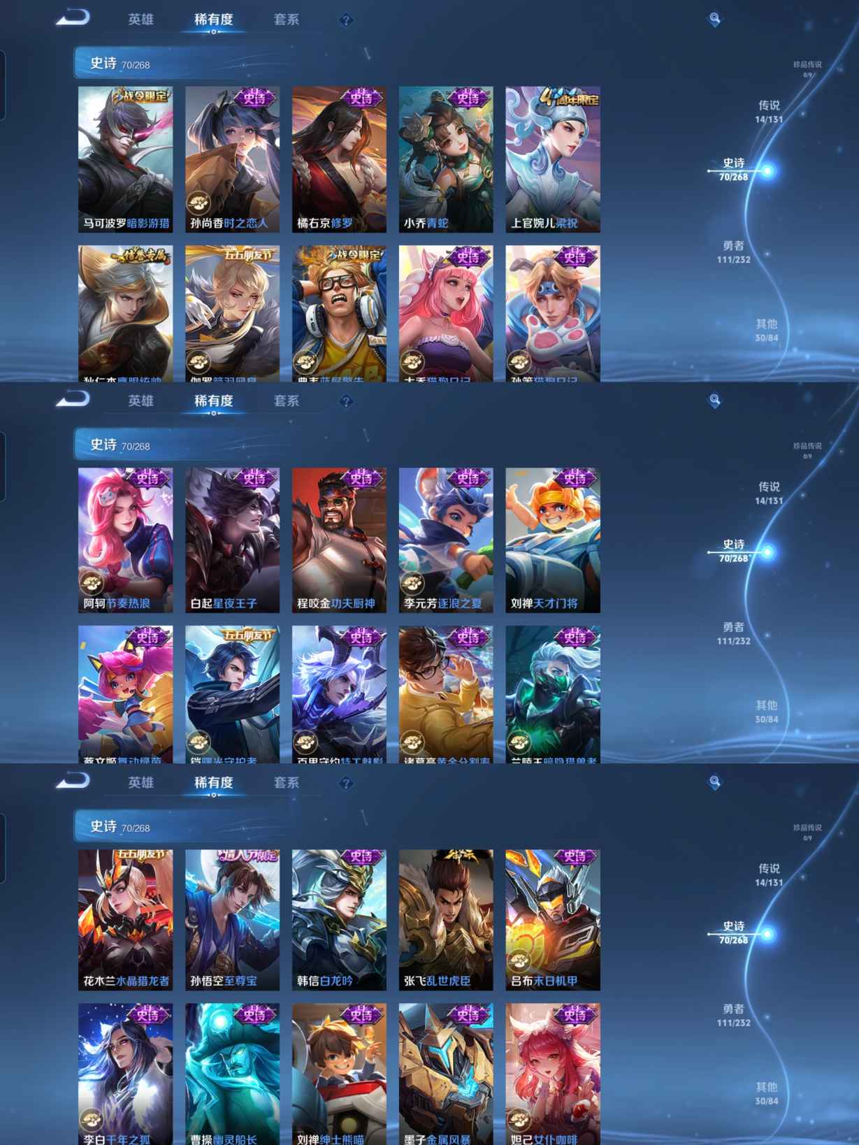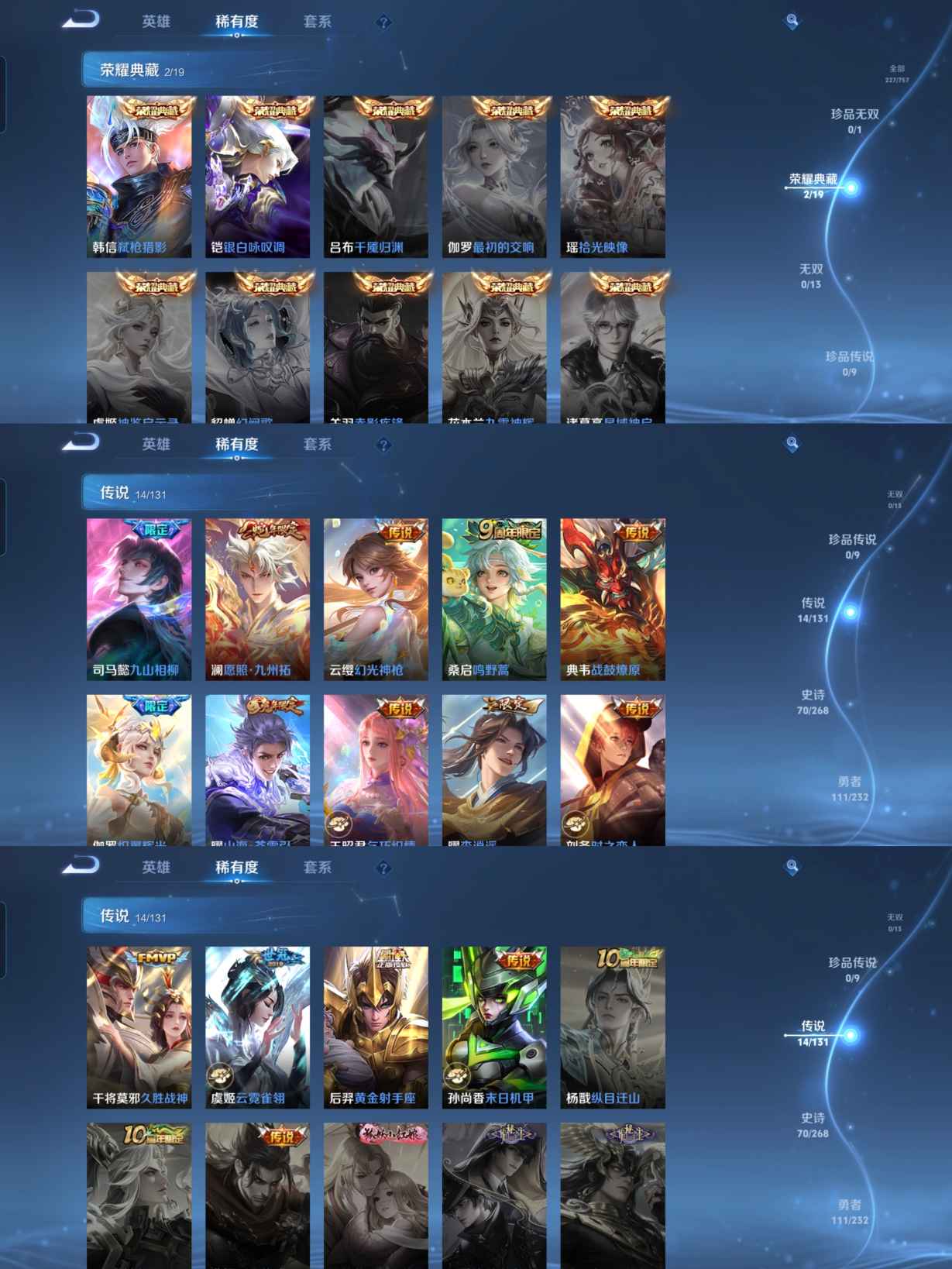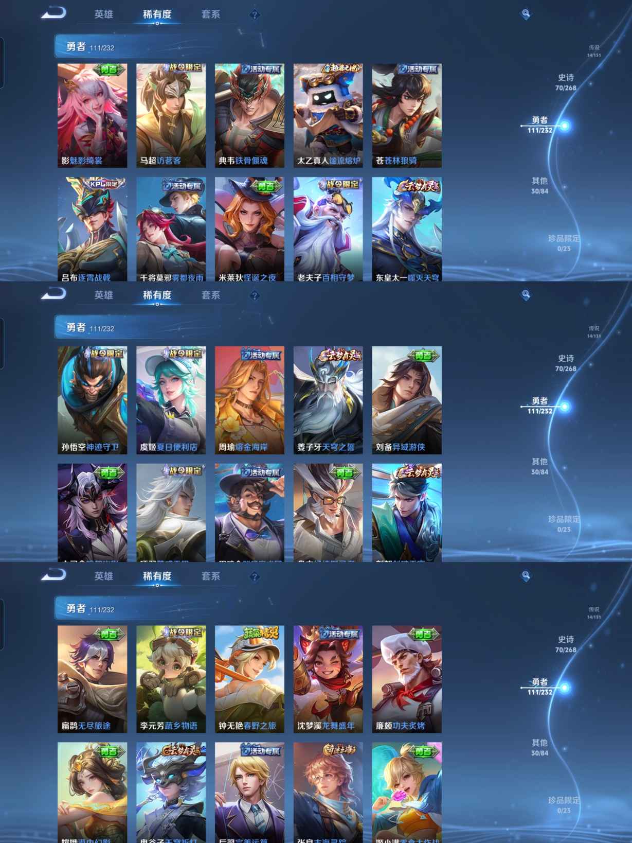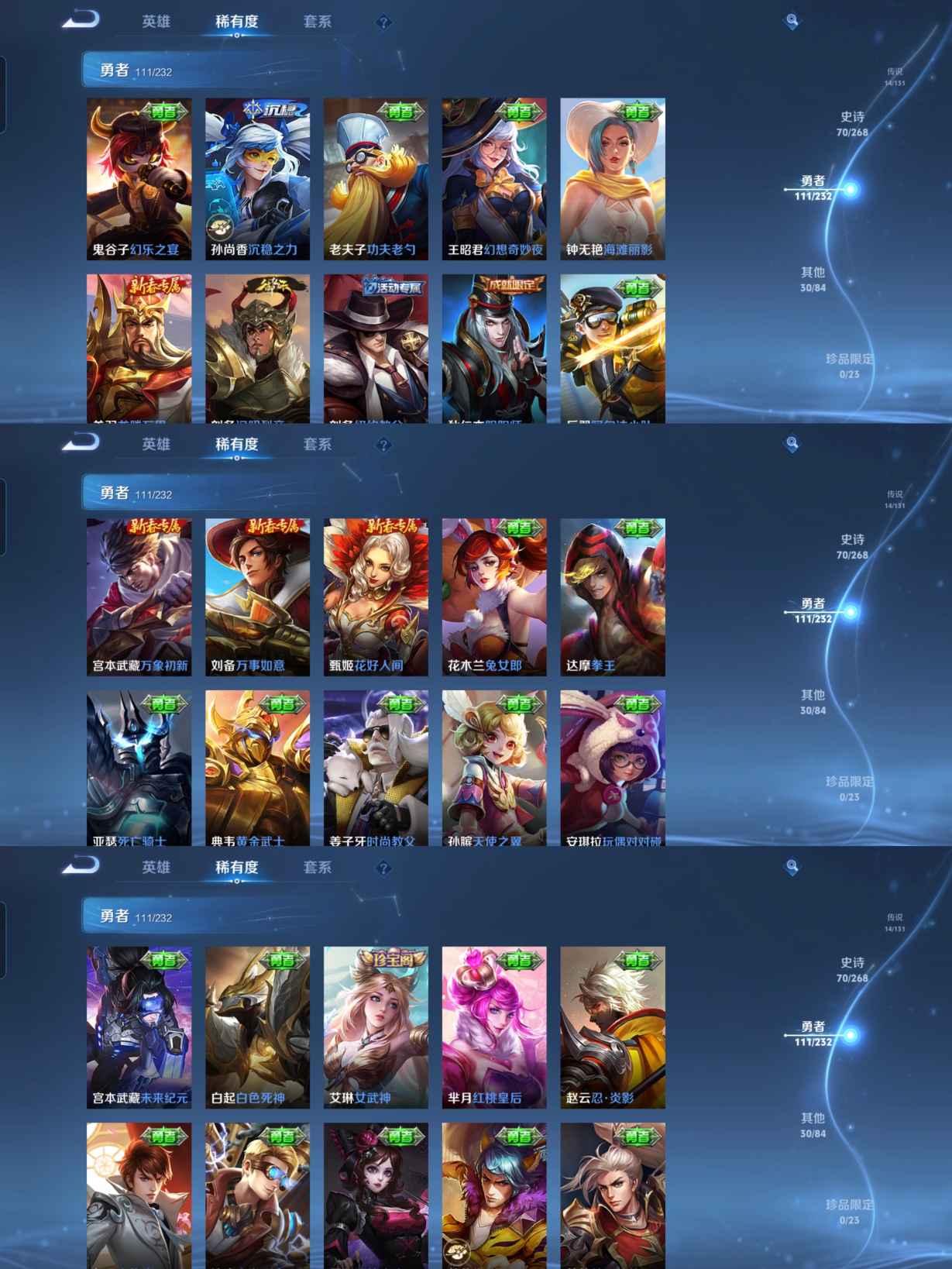 贵族等级:v7皮肤数:227传说品质14 生肖限定2 情人节限定1 荣耀典藏2 英雄数:126