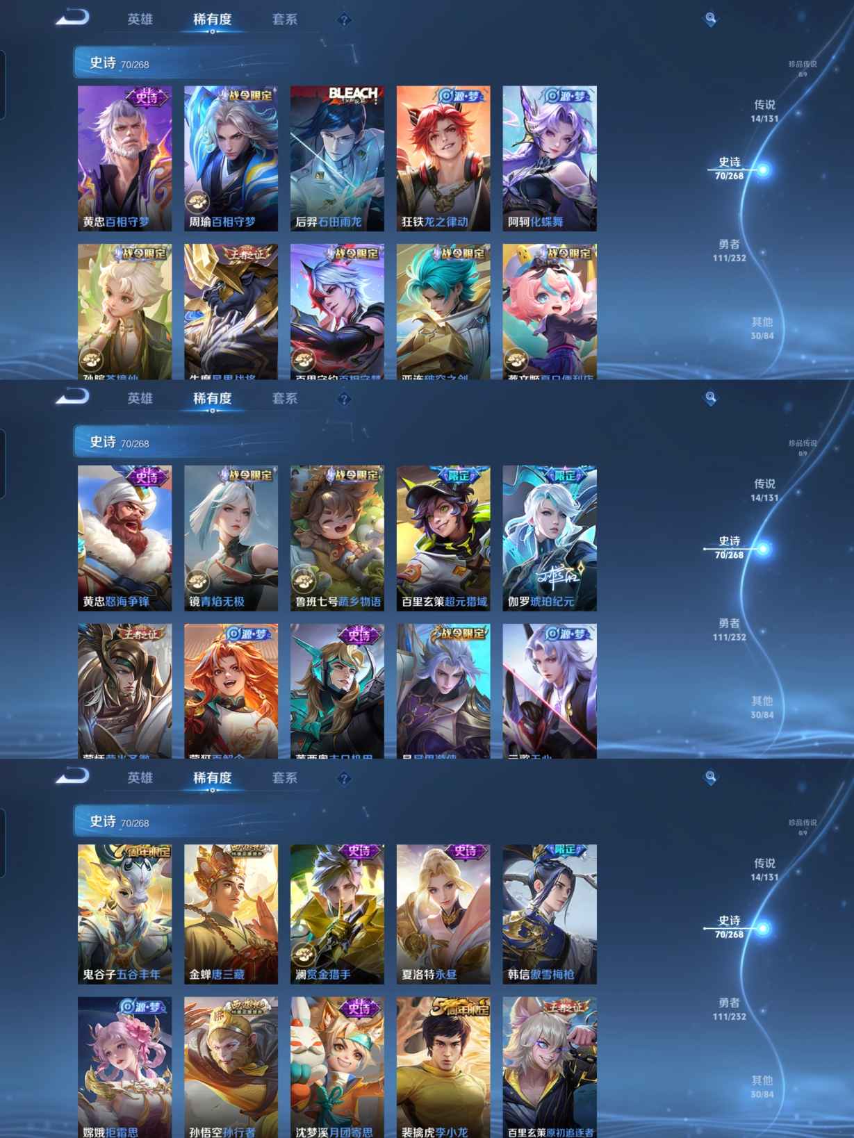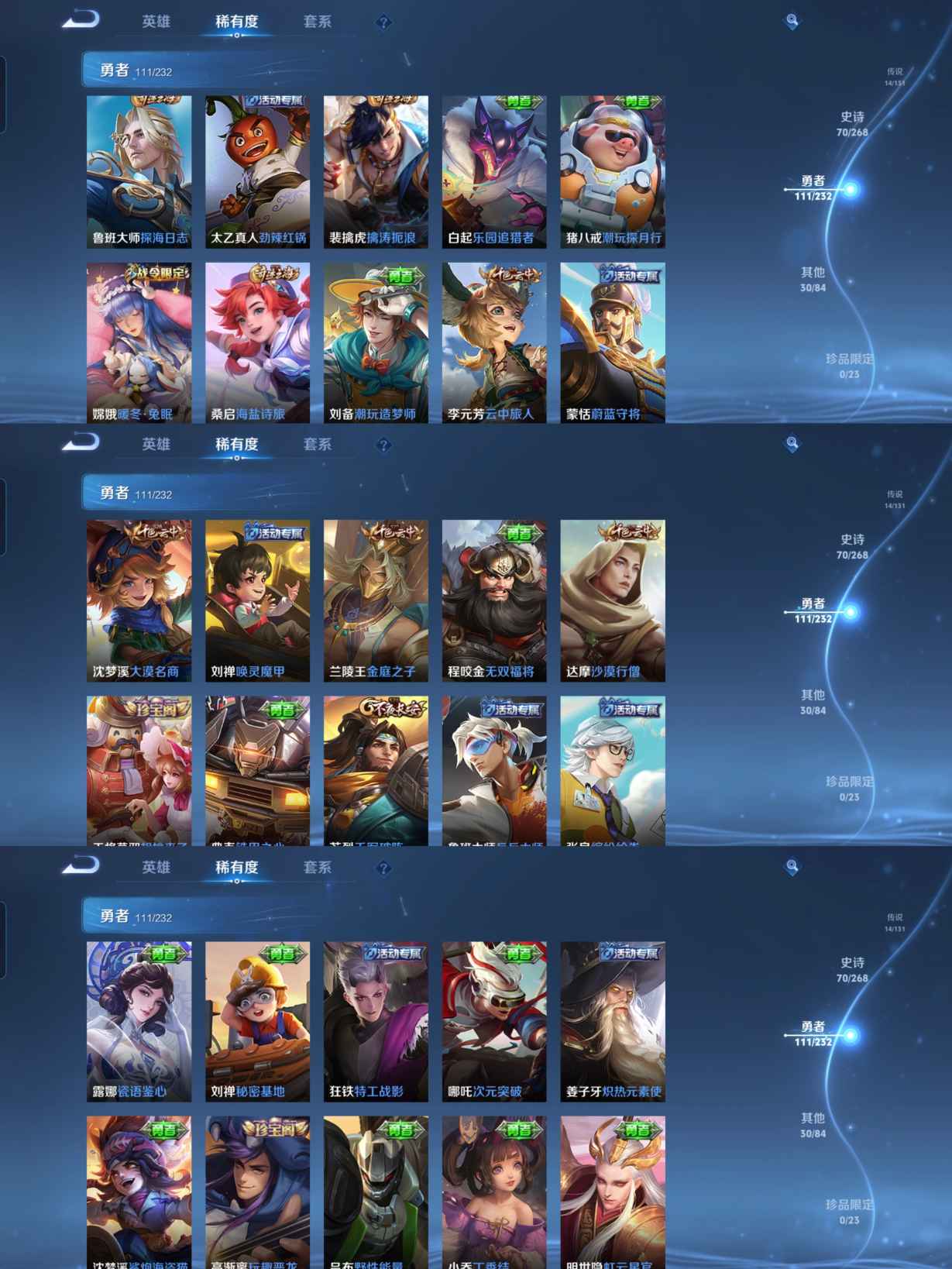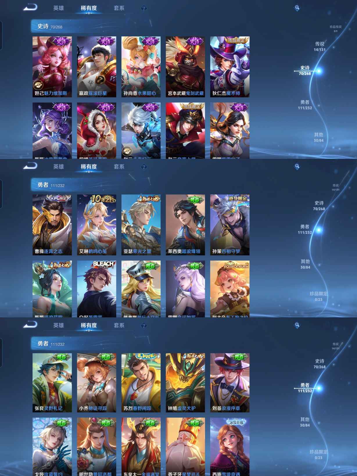 贵族等级:v7皮肤数:227传说品质14 生肖限定2 情人节限定1 荣耀典藏2 英雄数:126