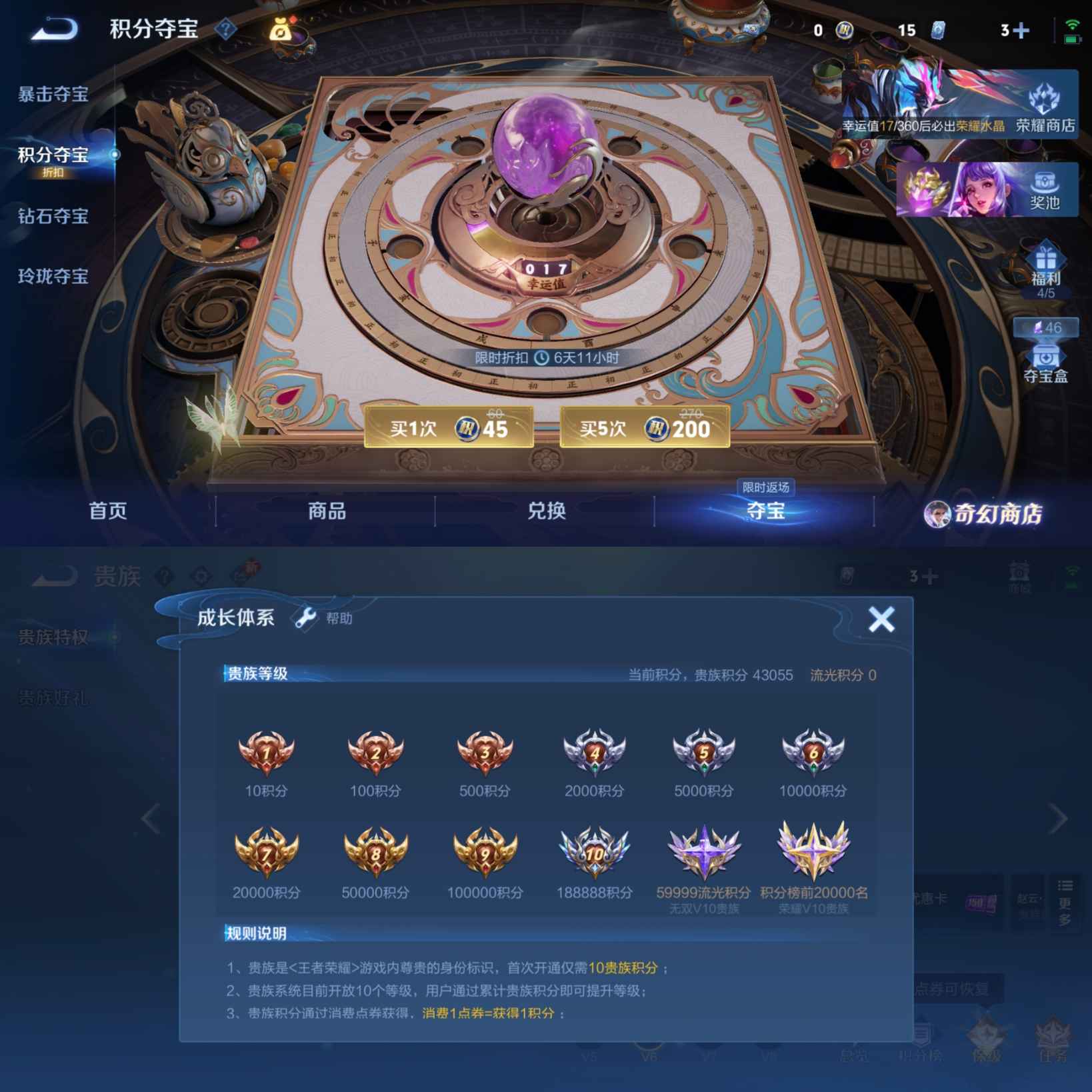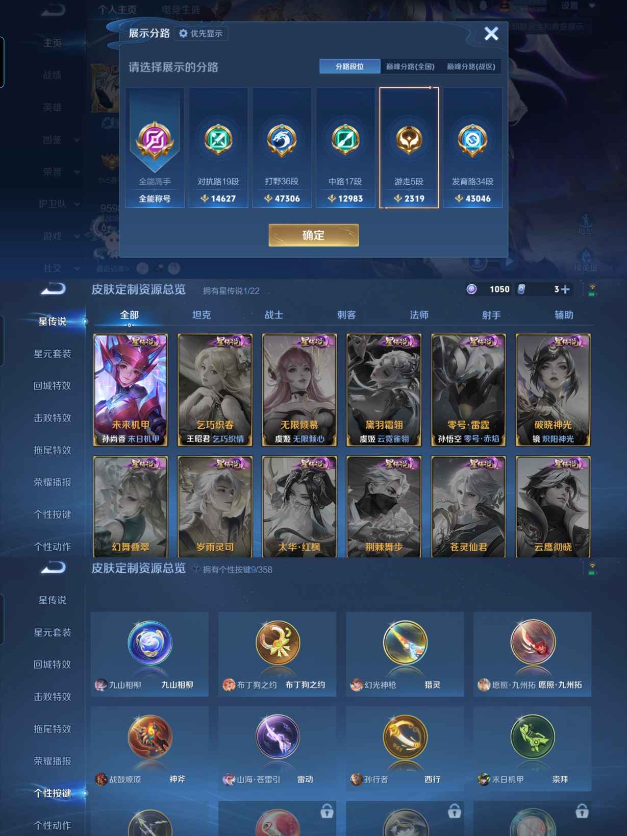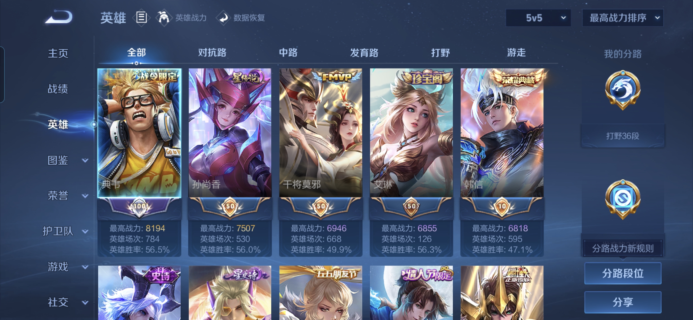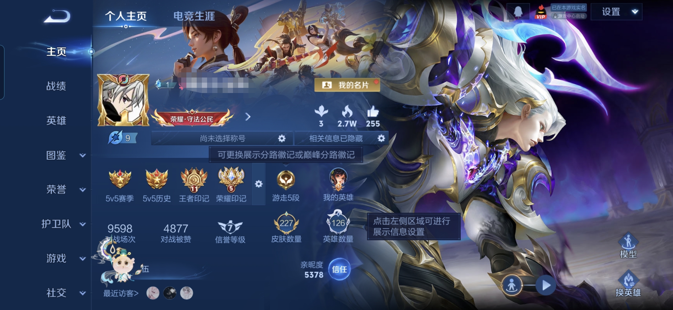 贵族等级:v7皮肤数:227传说品质14 生肖限定2 情人节限定1 荣耀典藏2 英雄数:126
