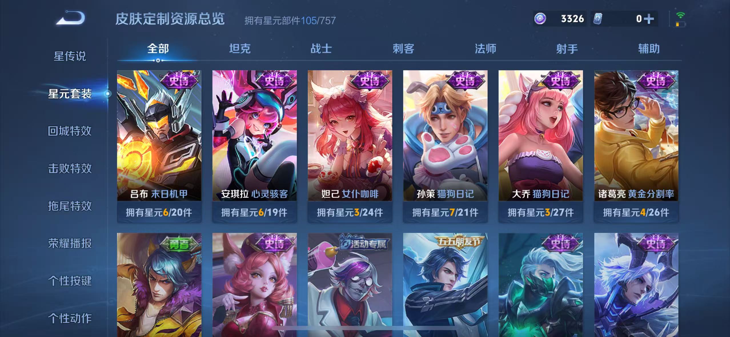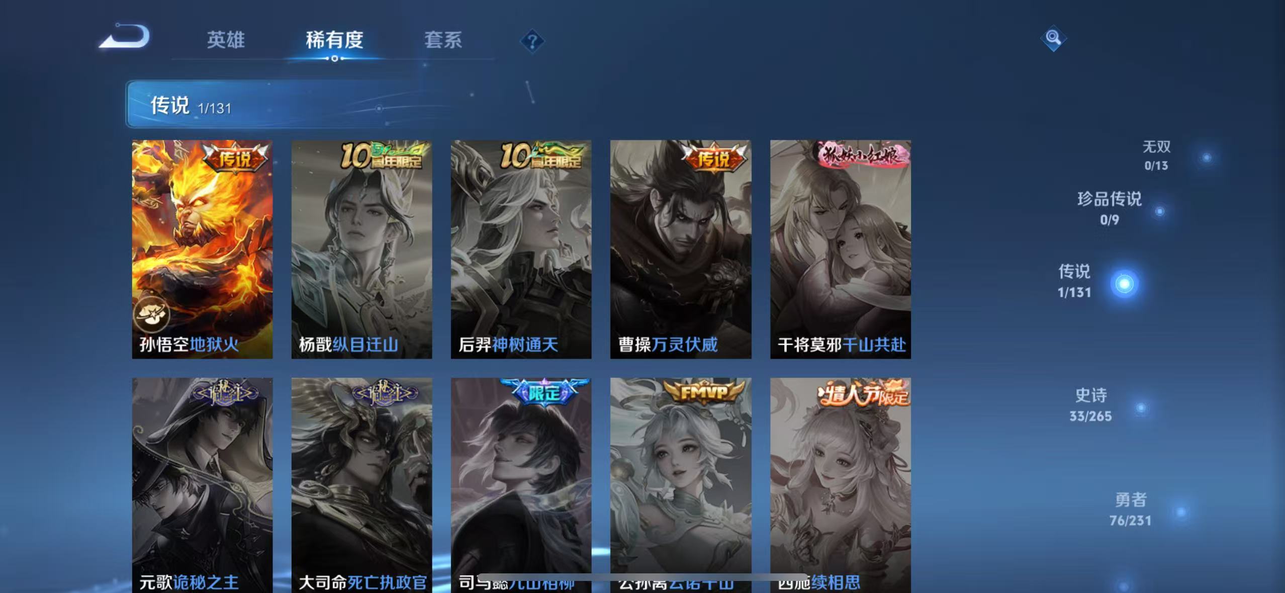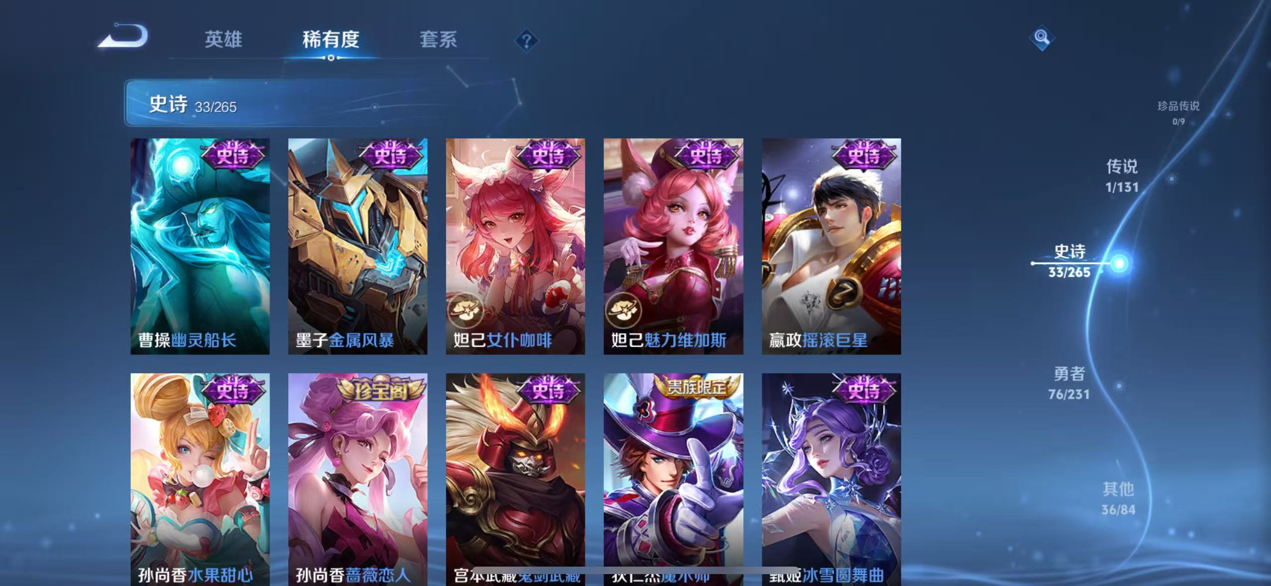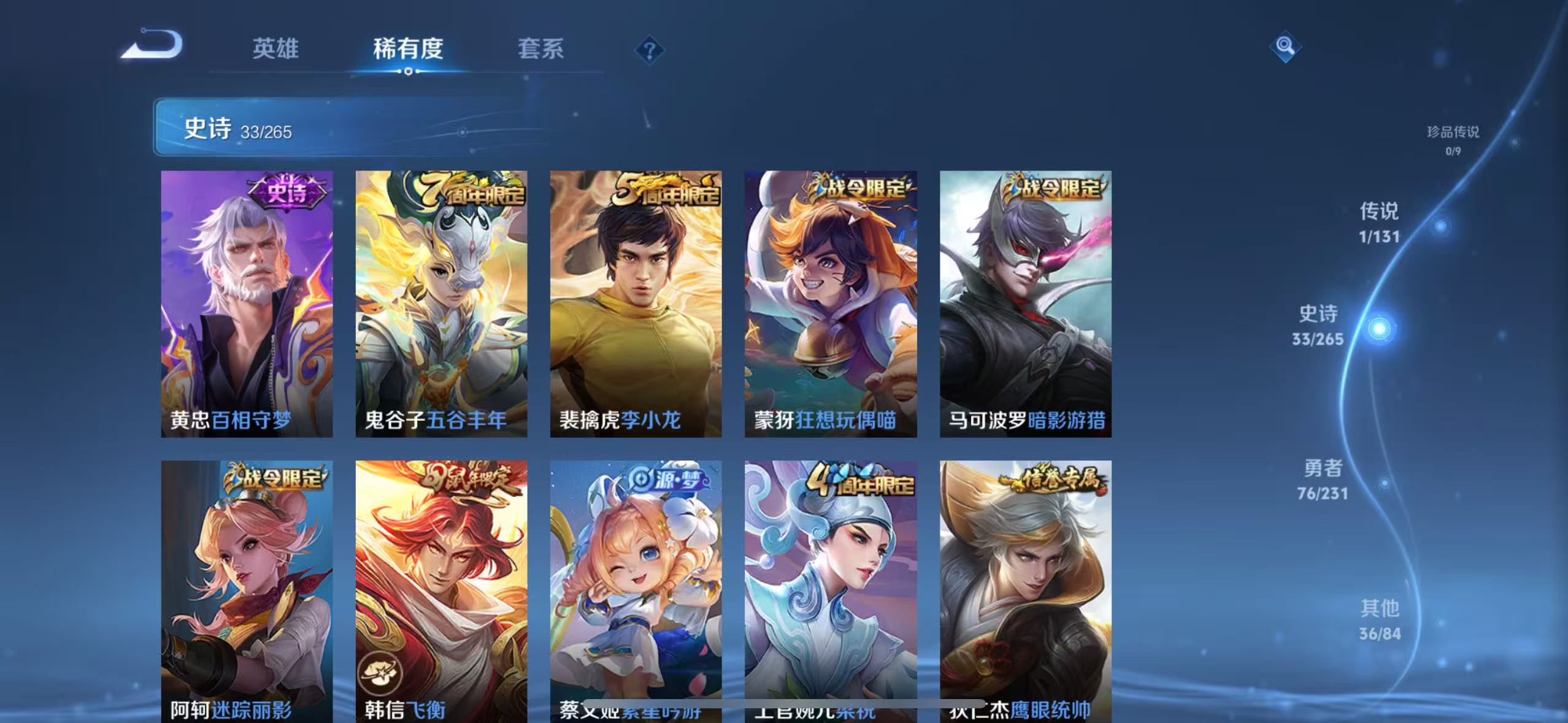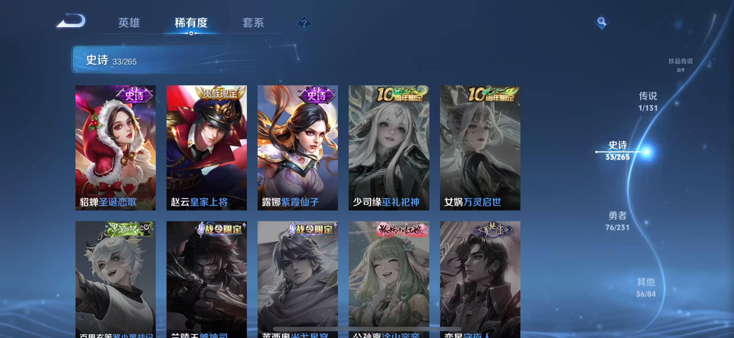 贵族等级:v6皮肤数:146情人节限定1 传说品质1 生肖限定1 英雄数:124