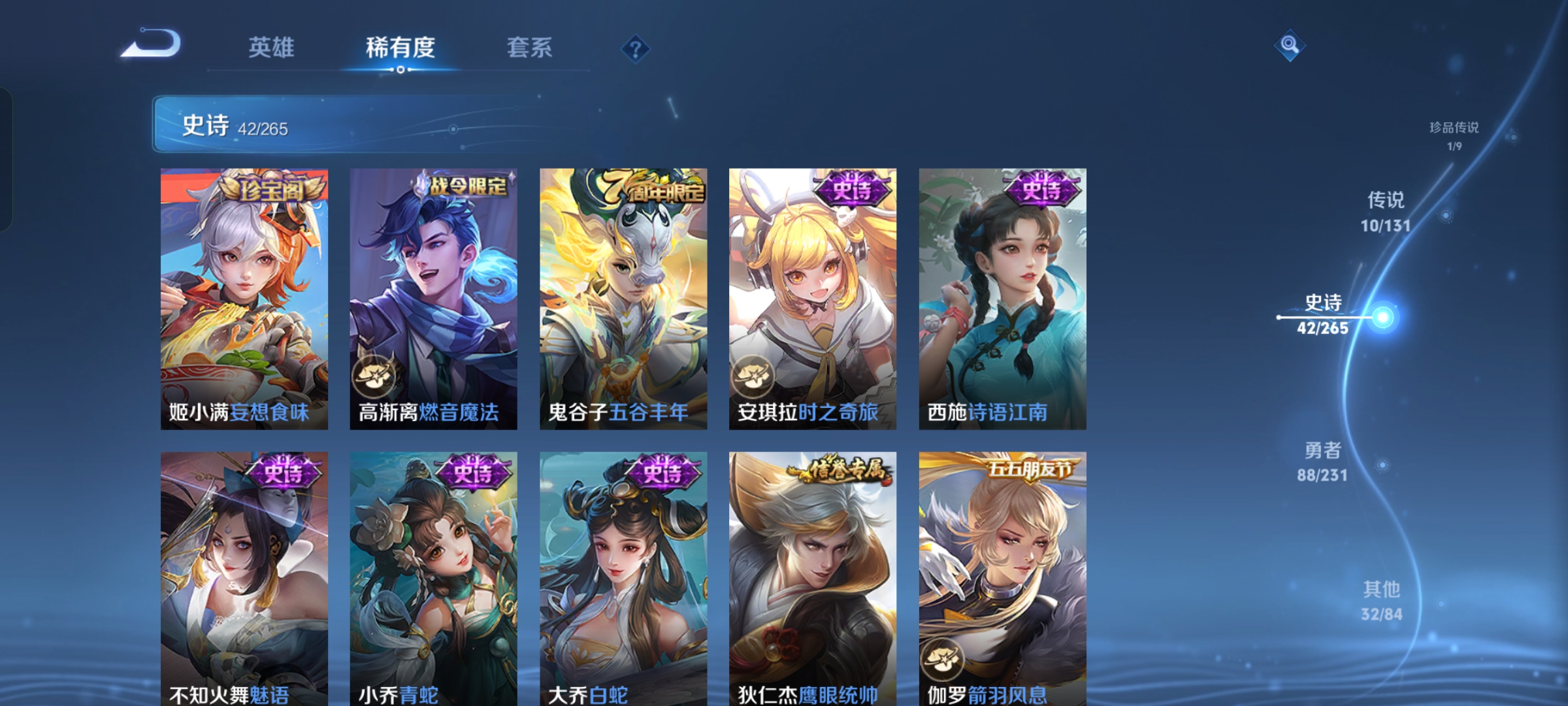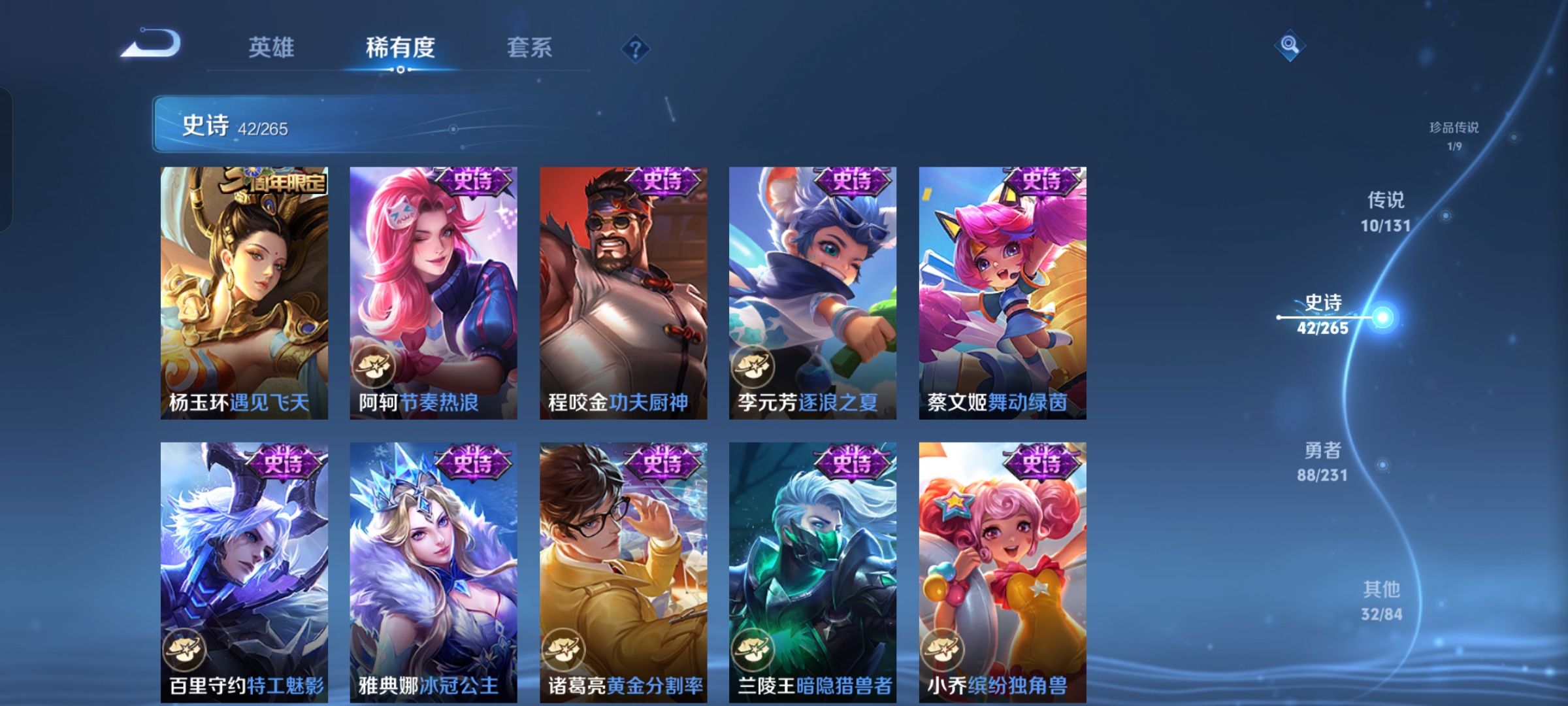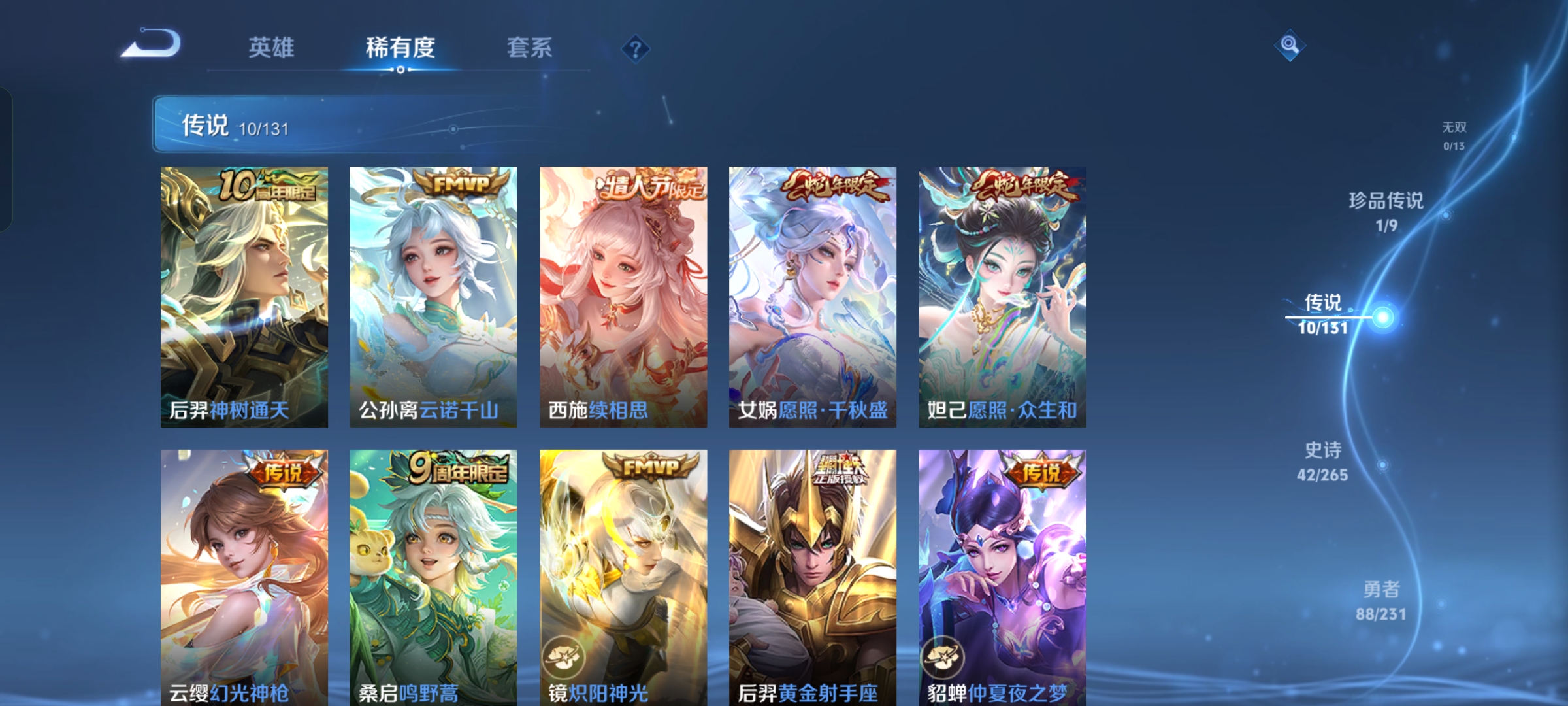 贵族等级:v6皮肤数:174传说品质10 情人节限定1 珍品传说1 生肖限定2 荣耀典藏1 英雄数:125