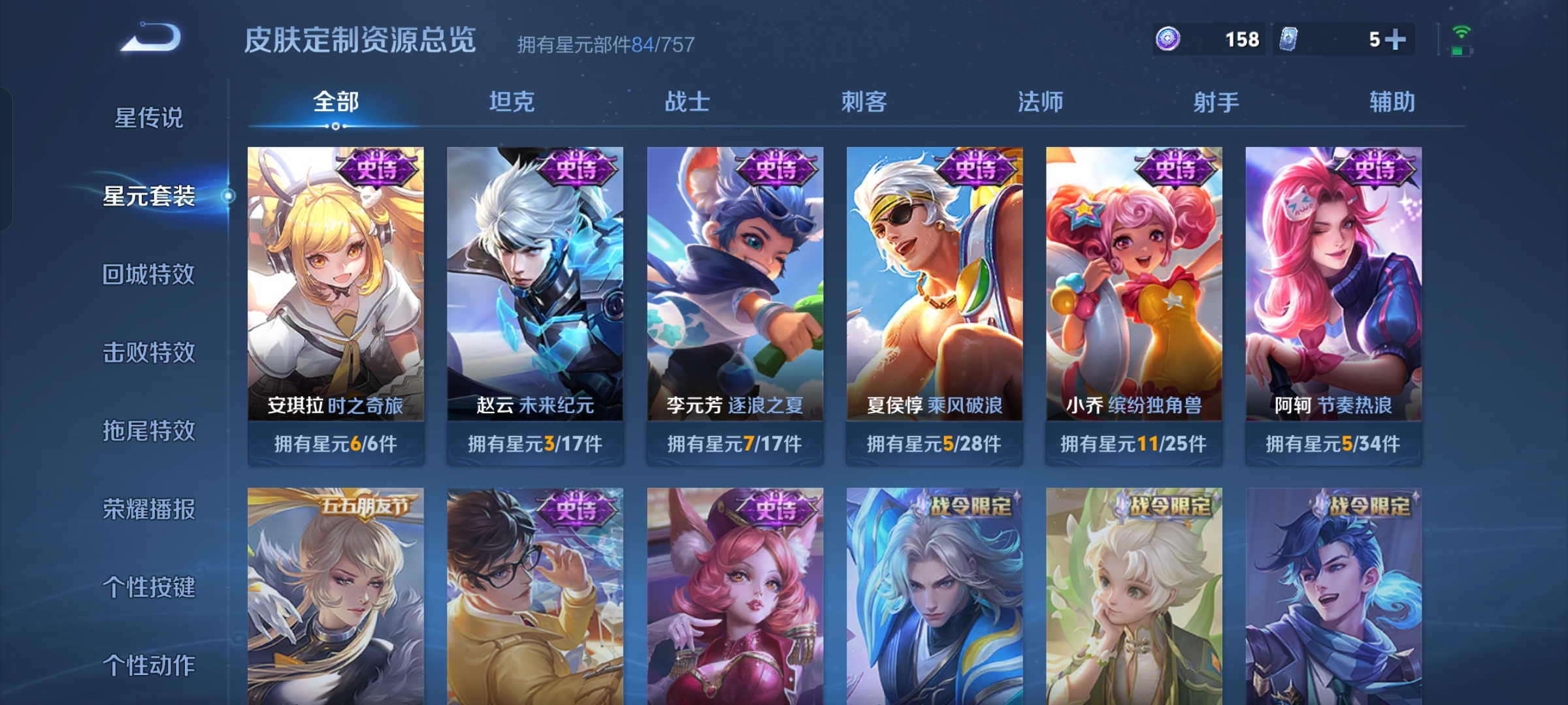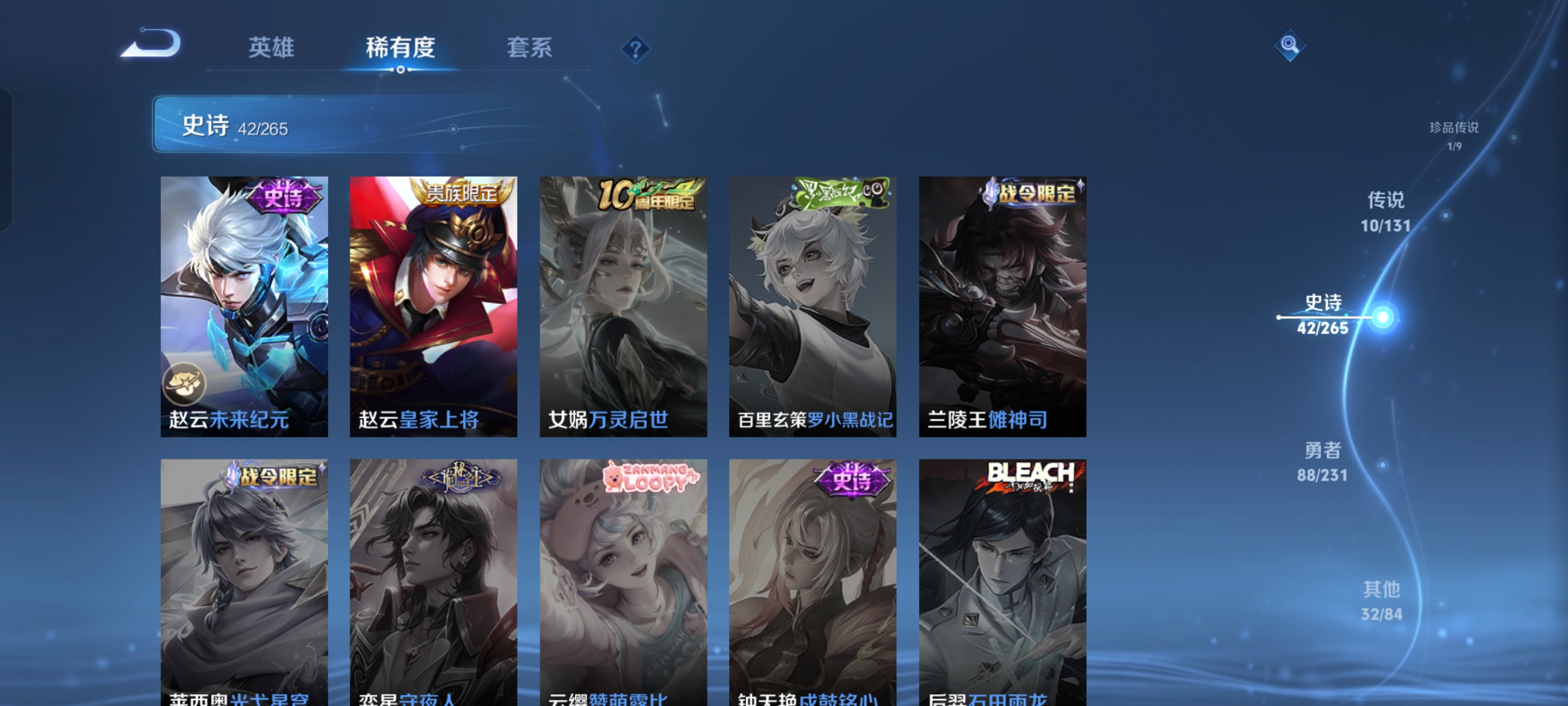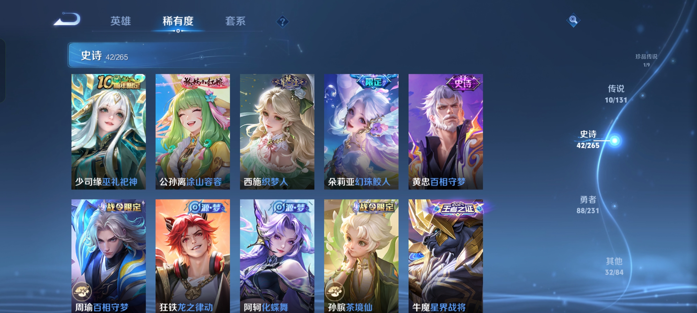 贵族等级:v6皮肤数:174传说品质10 情人节限定1 珍品传说1 生肖限定2 荣耀典藏1 英雄数:125