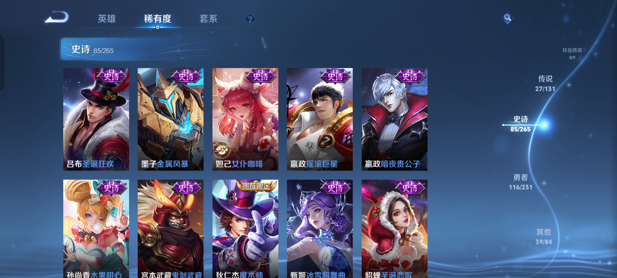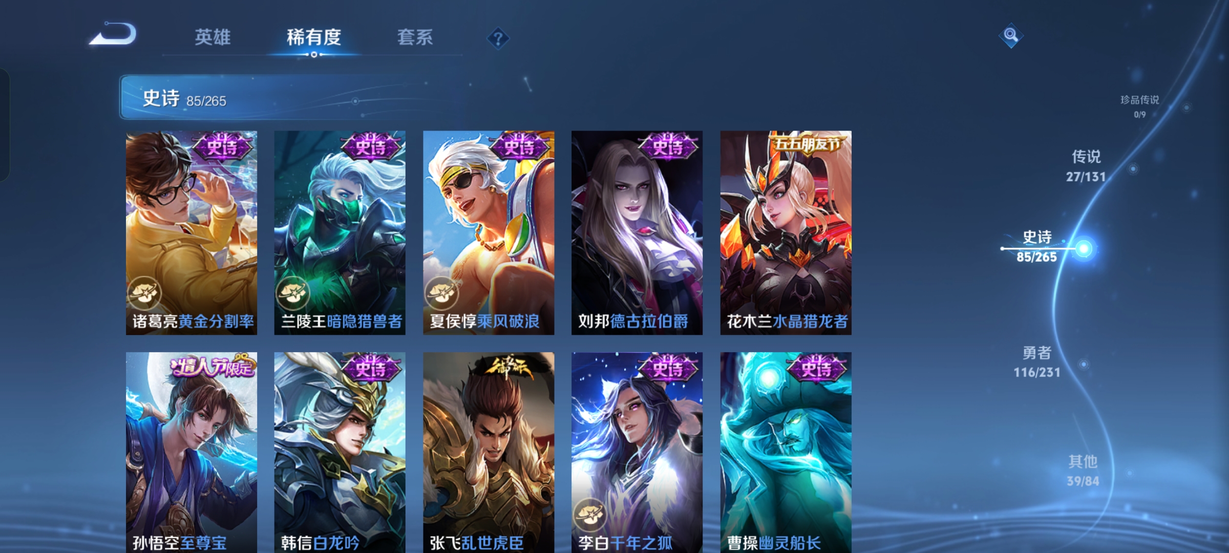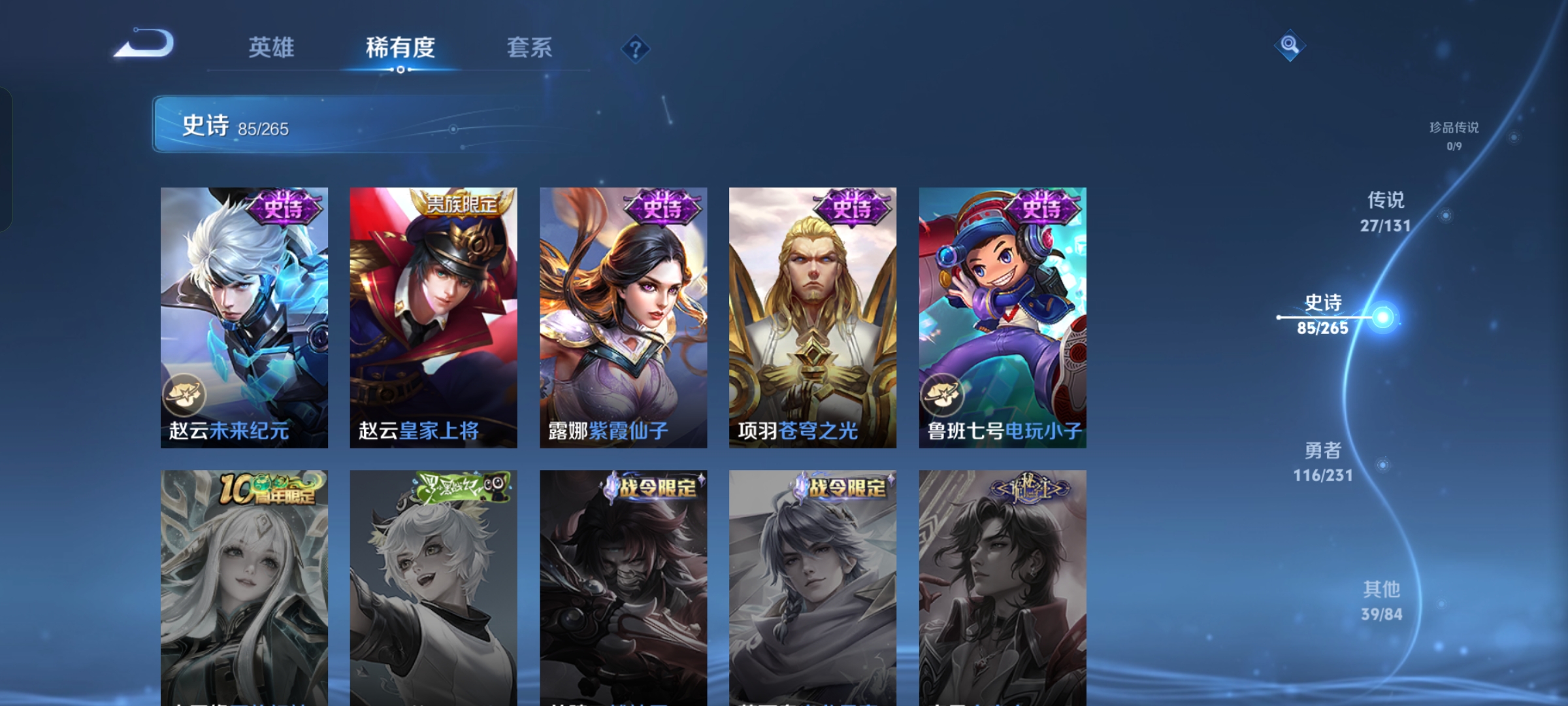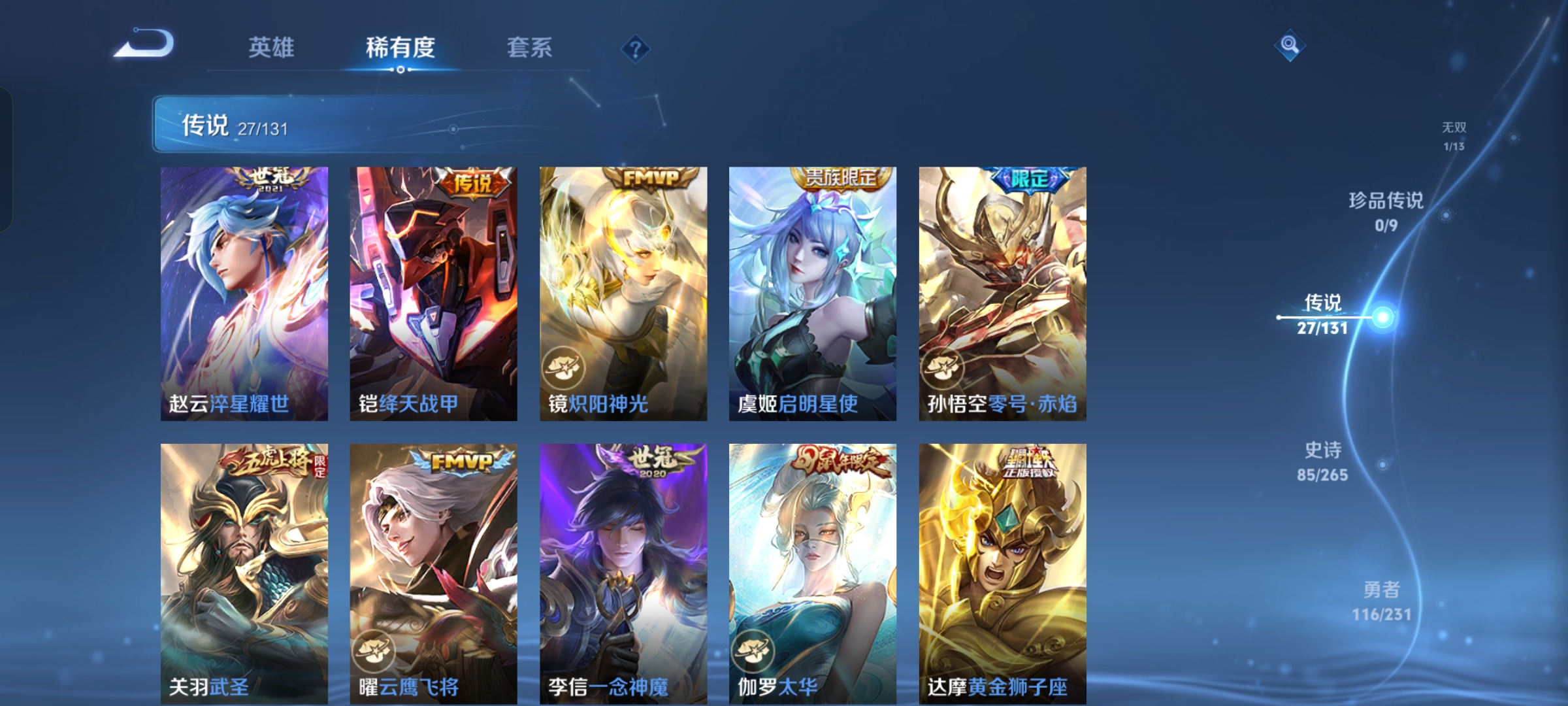 贵族等级:v8皮肤数:269情人节限定5 传说品质27 生肖限定11 荣耀典藏1 无双1 英雄数:127