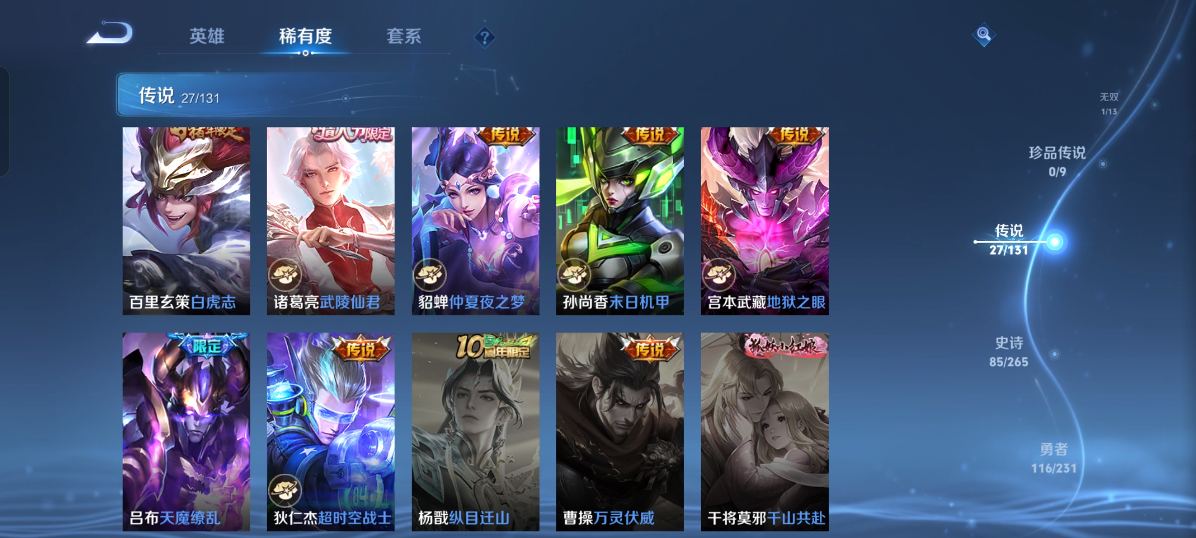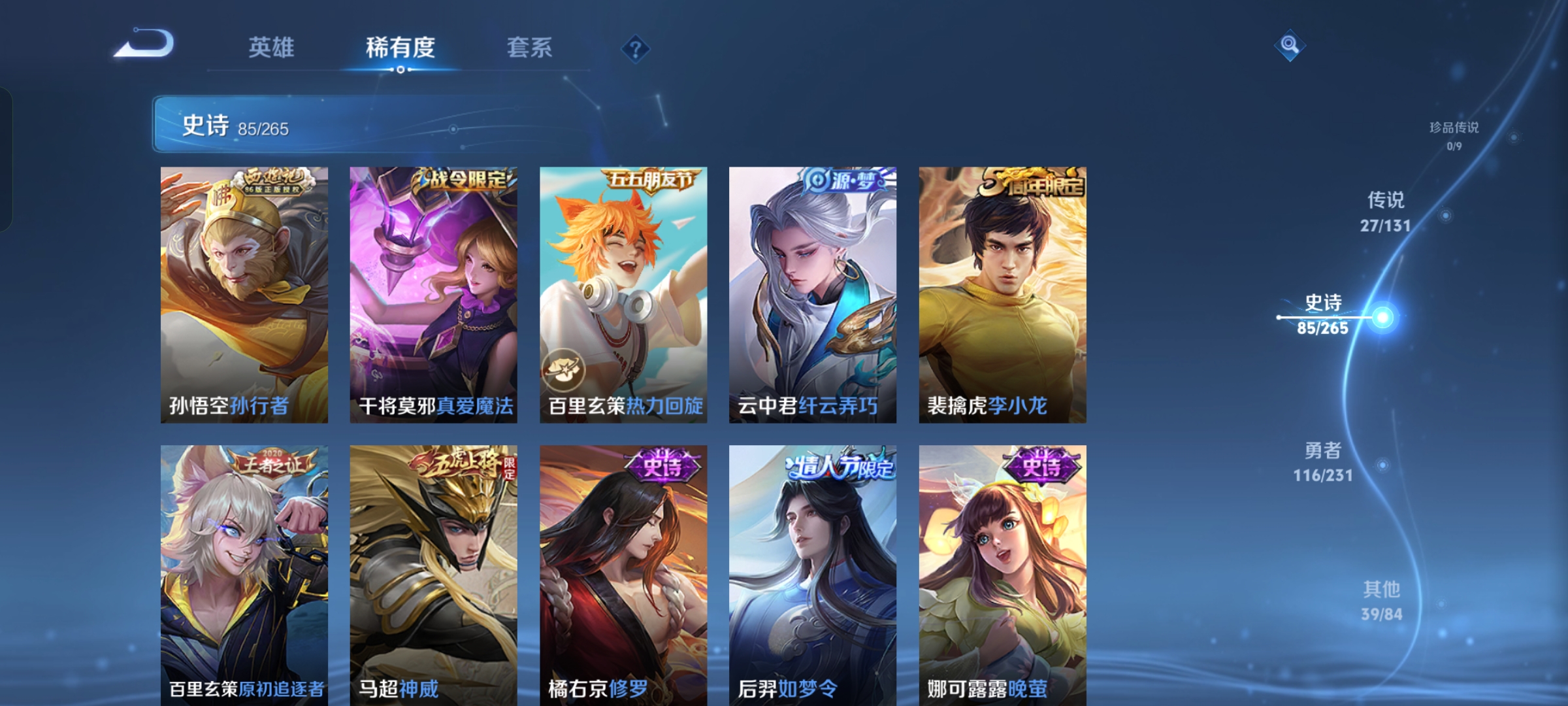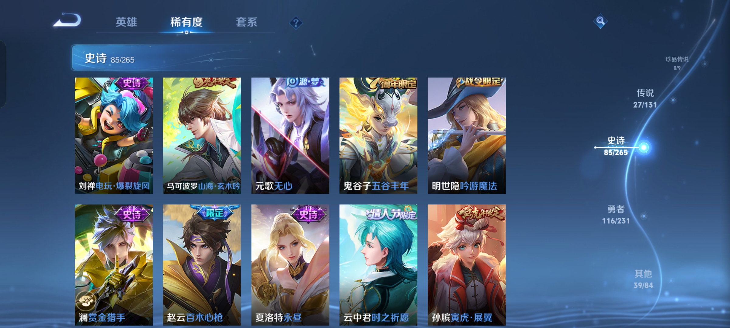 贵族等级:v8皮肤数:269情人节限定5 传说品质27 生肖限定11 荣耀典藏1 无双1 英雄数:127