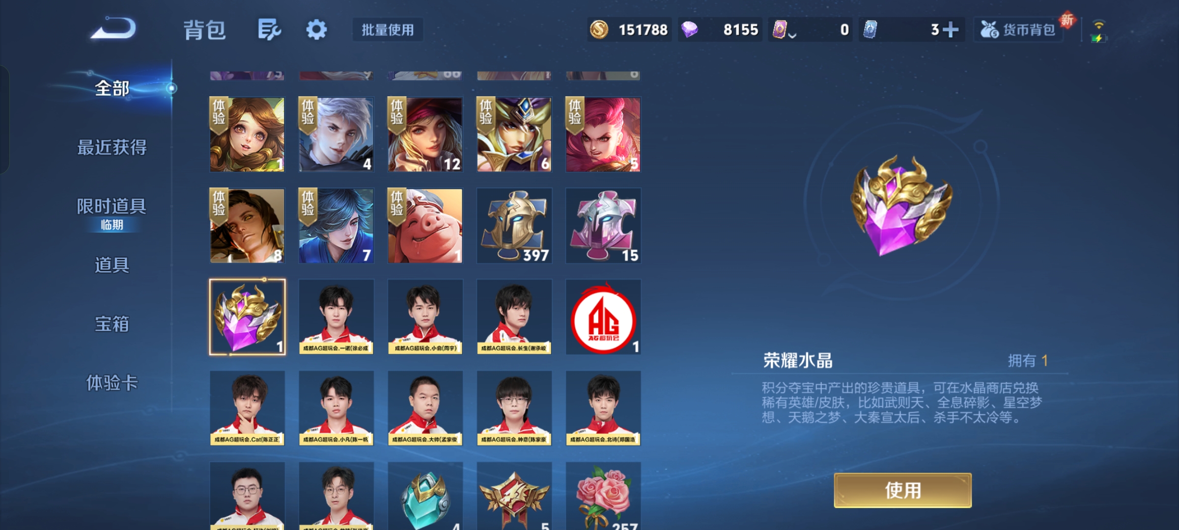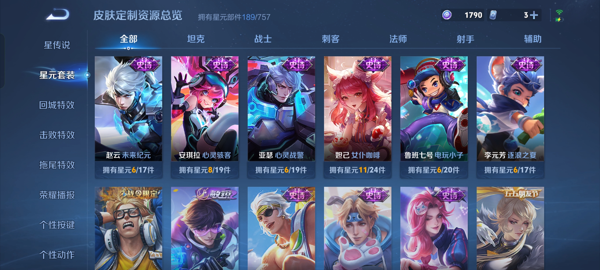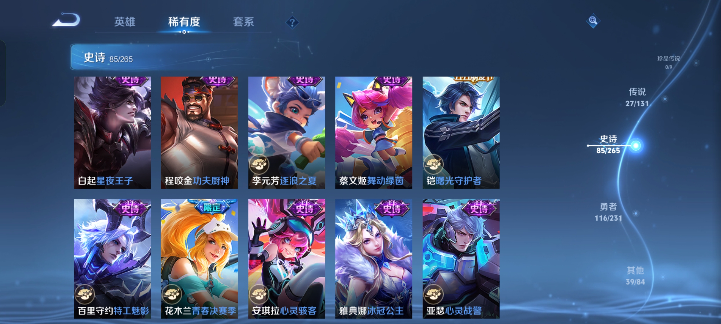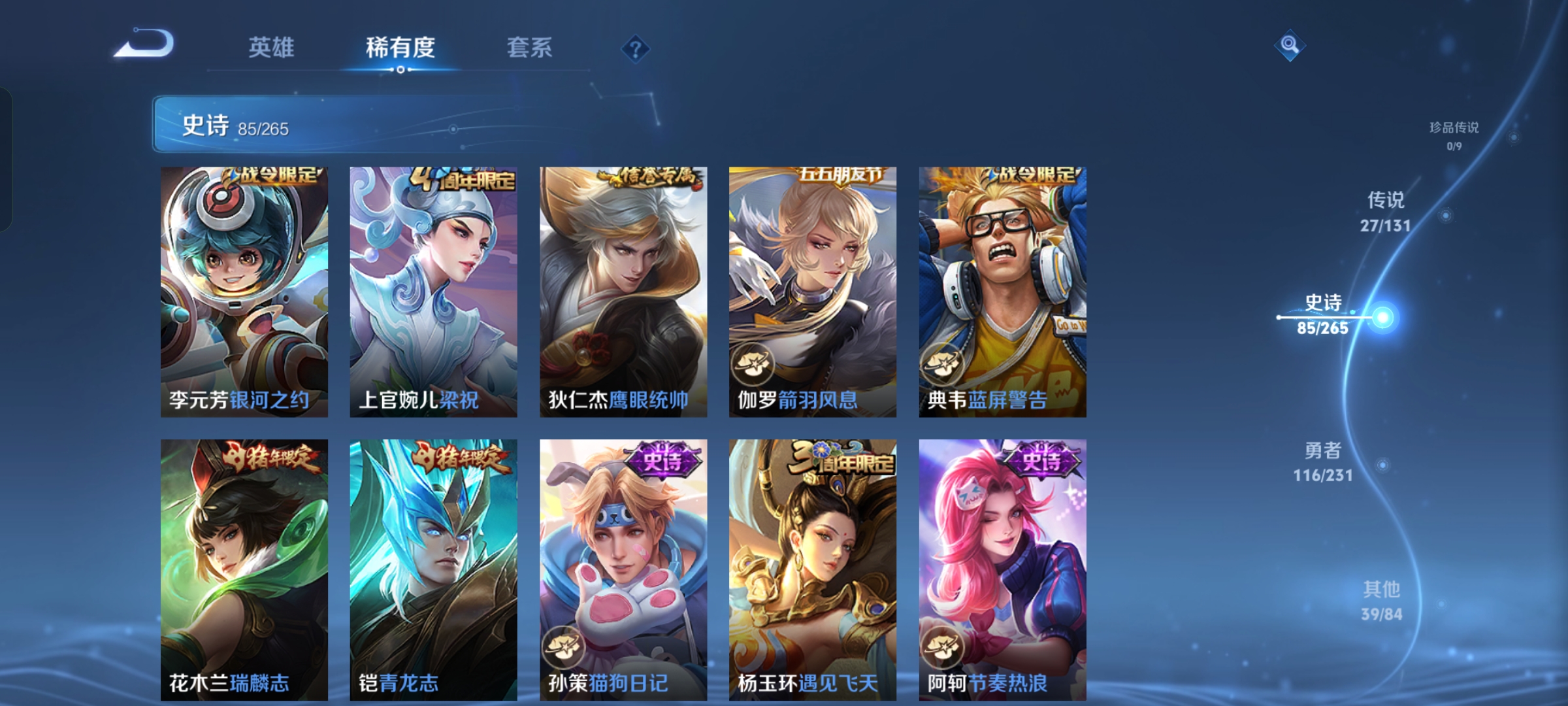 贵族等级:v8皮肤数:269情人节限定5 传说品质27 生肖限定11 荣耀典藏1 无双1 英雄数:127
