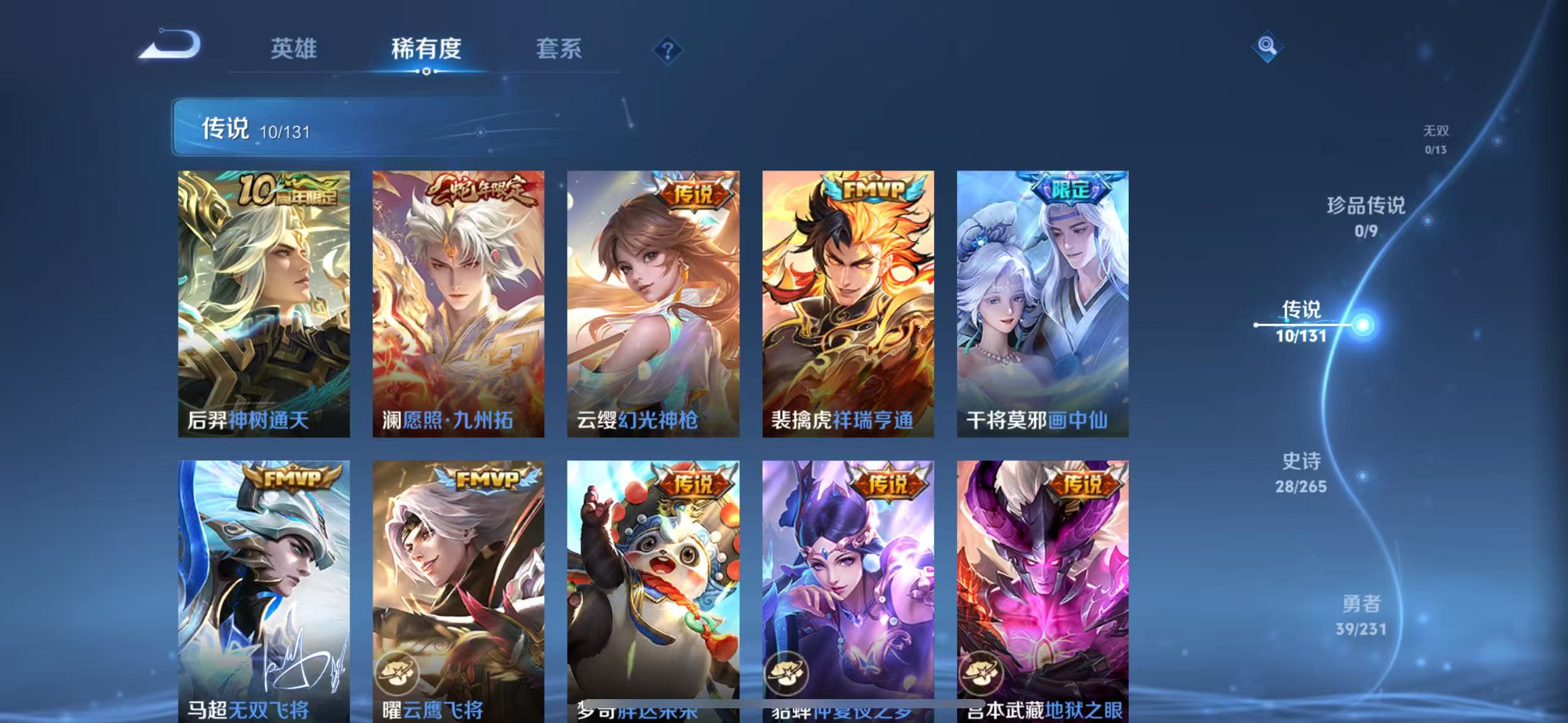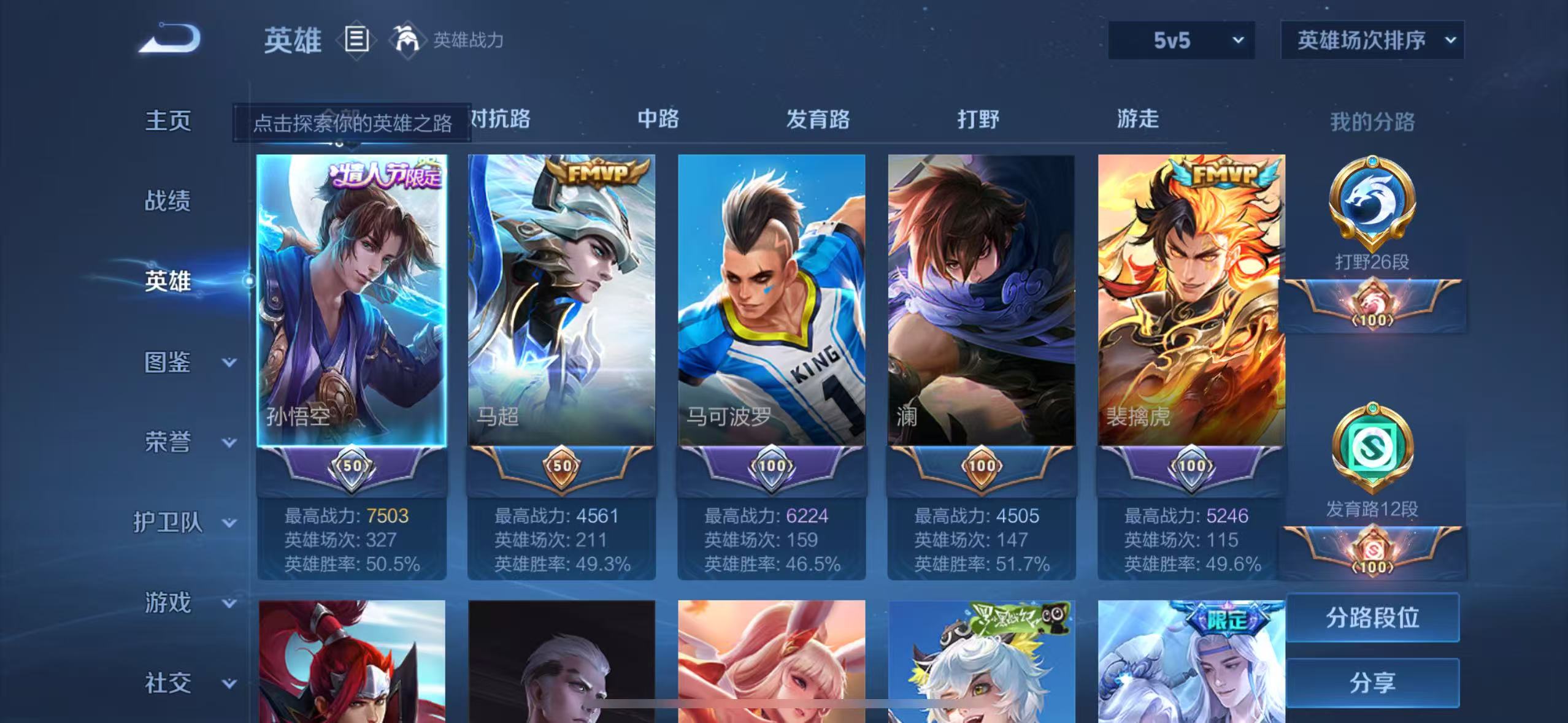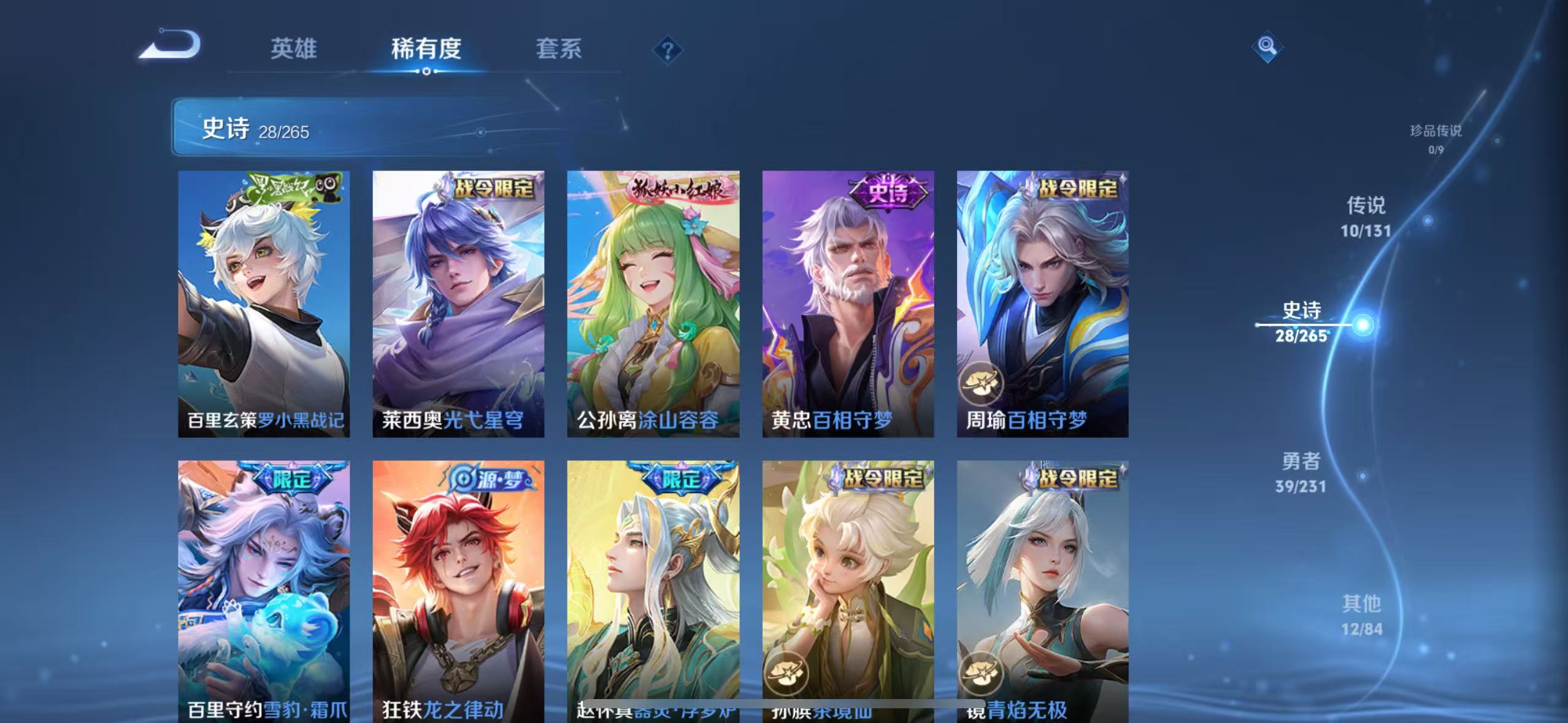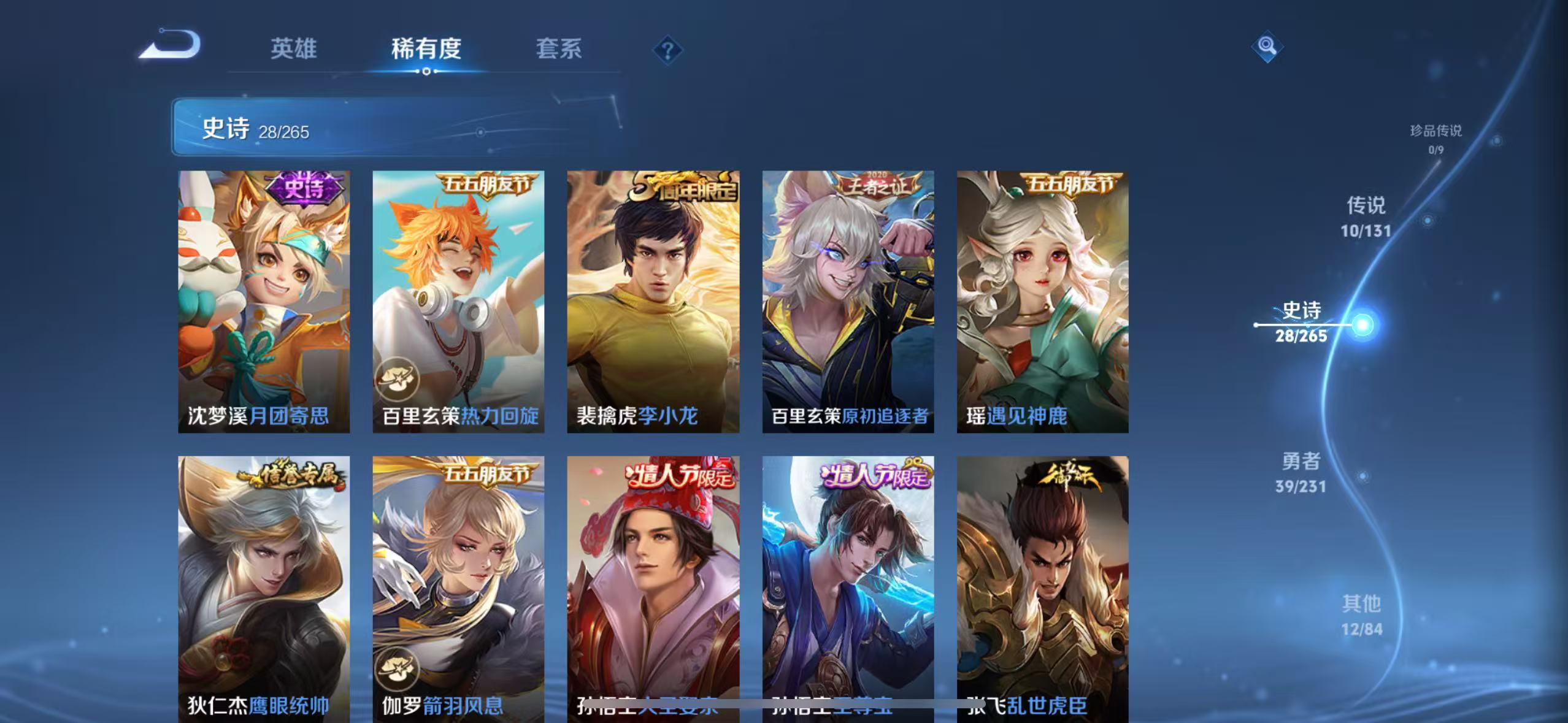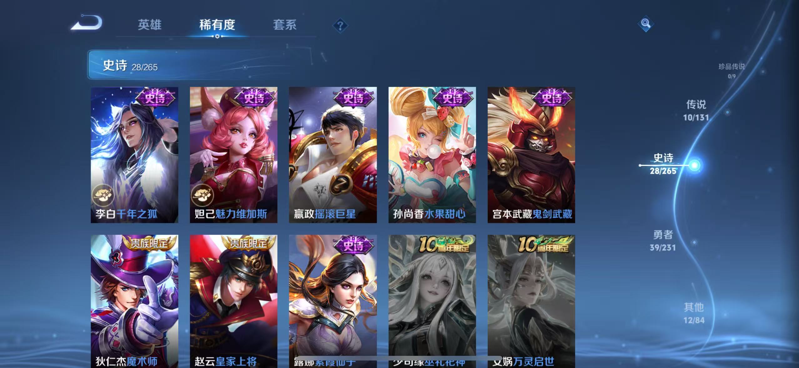 贵族等级:v6皮肤数:90传说品质10 生肖限定1 情人节限定2 荣耀典藏1 英雄数:105