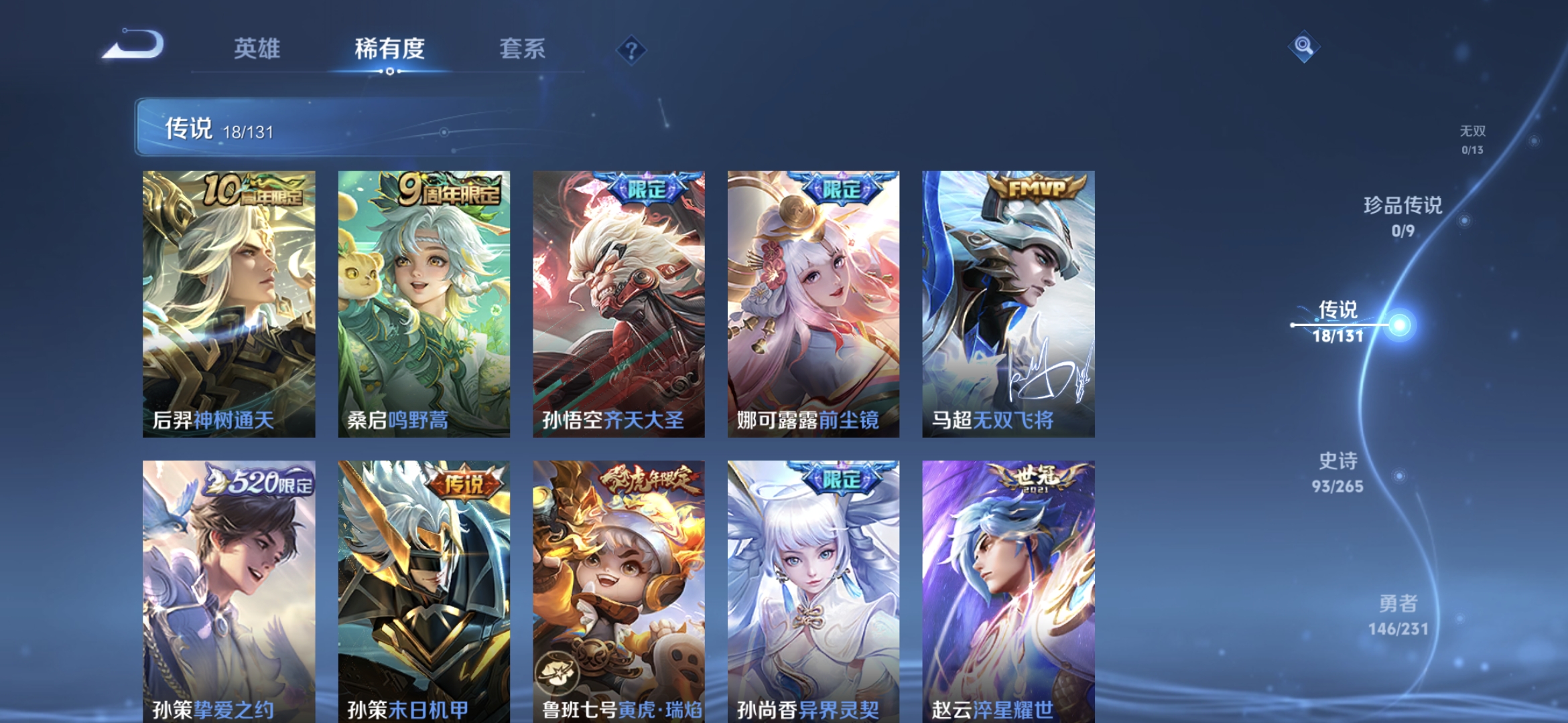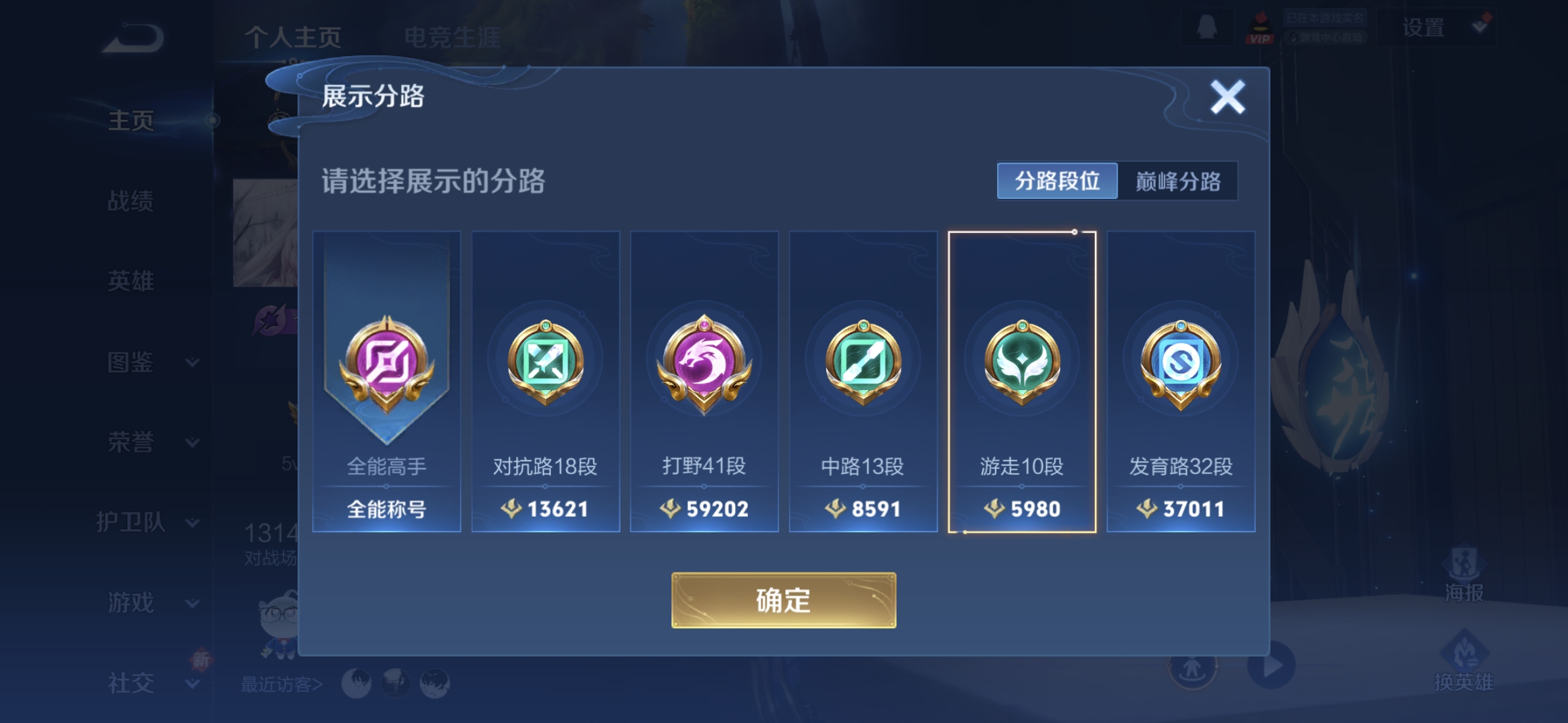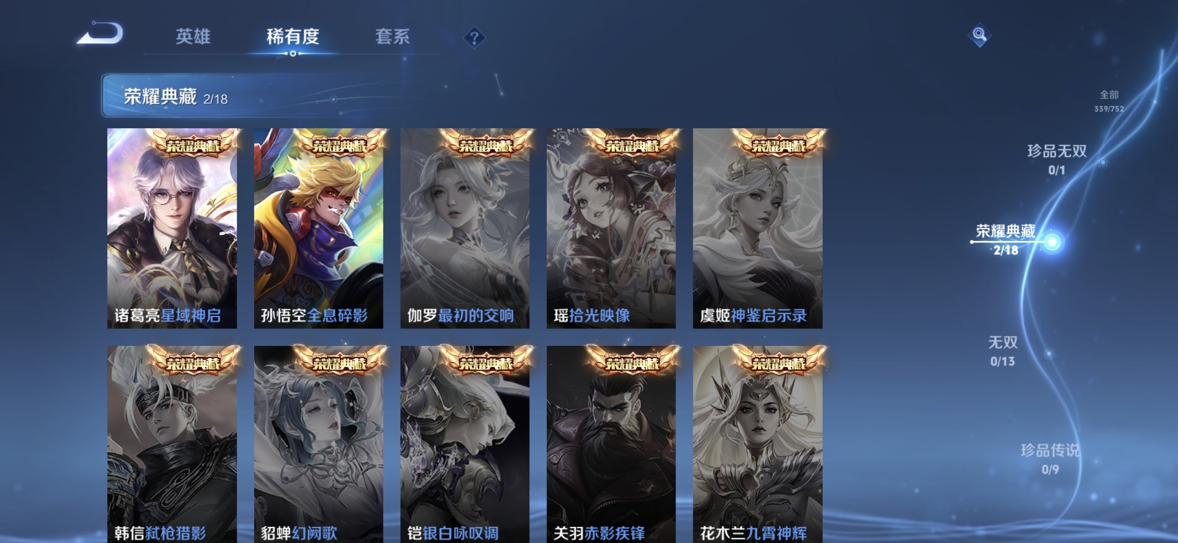 贵族等级:v8皮肤数:339情人节限定3 传说品质18 生肖限定5 荣耀典藏2 英雄数:126