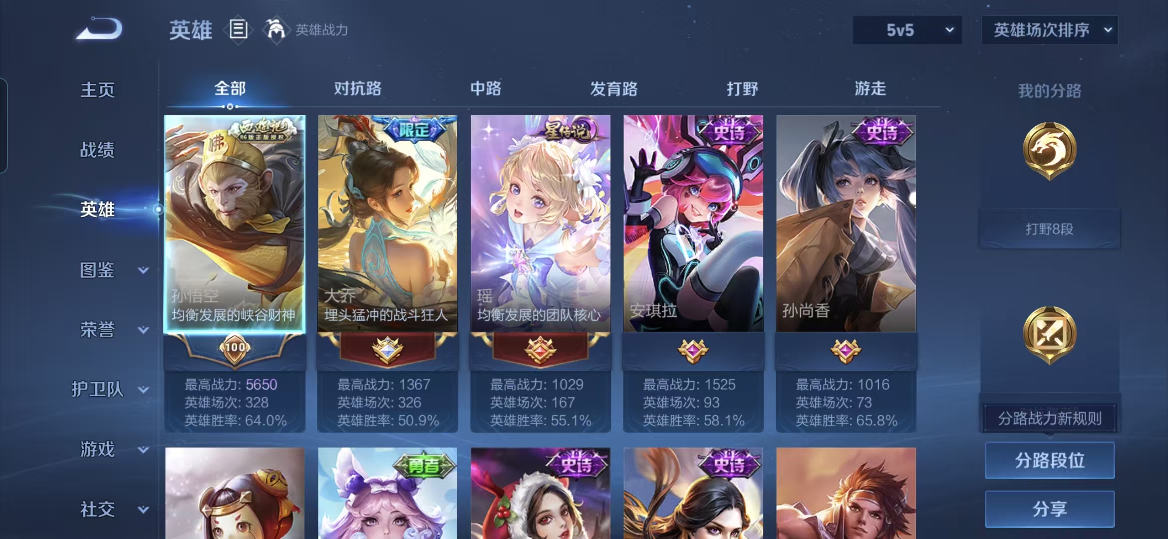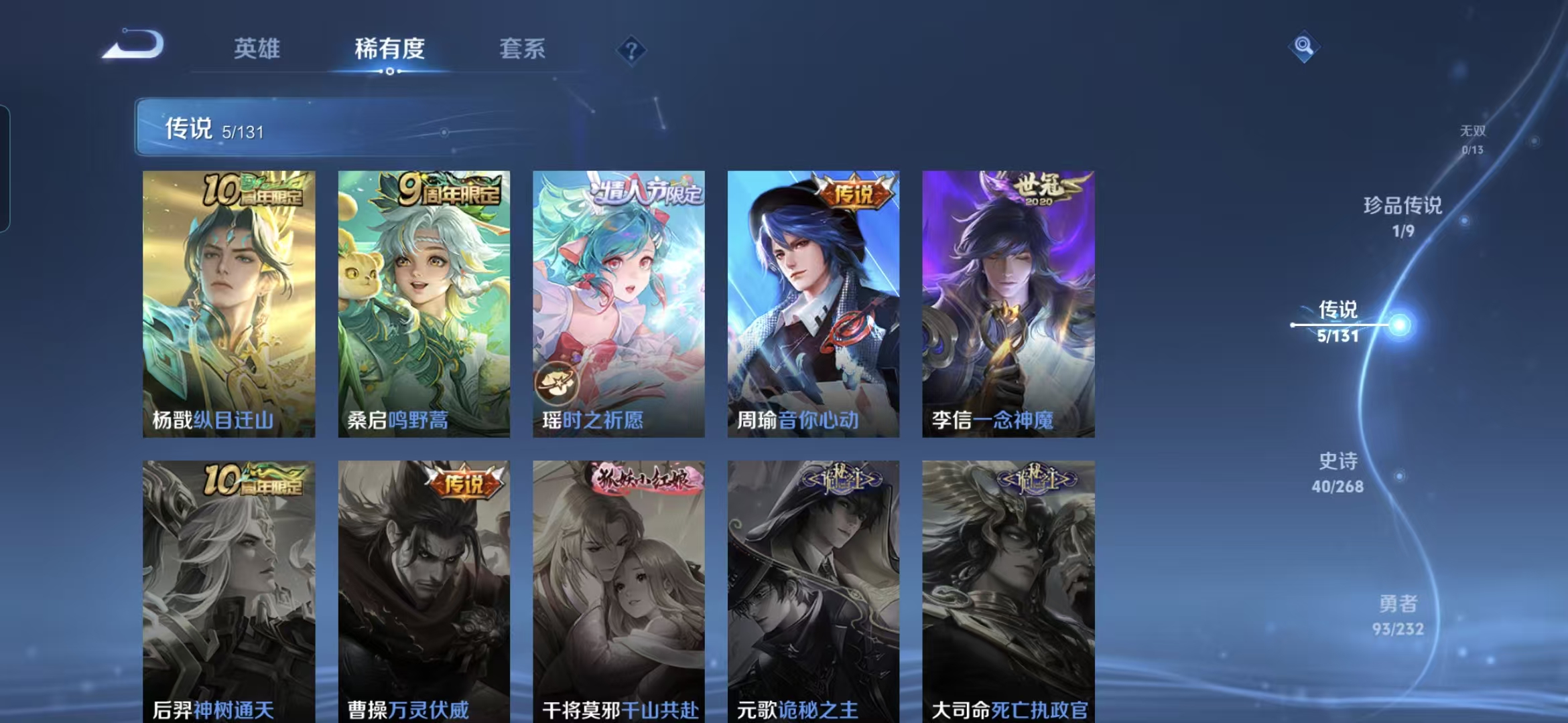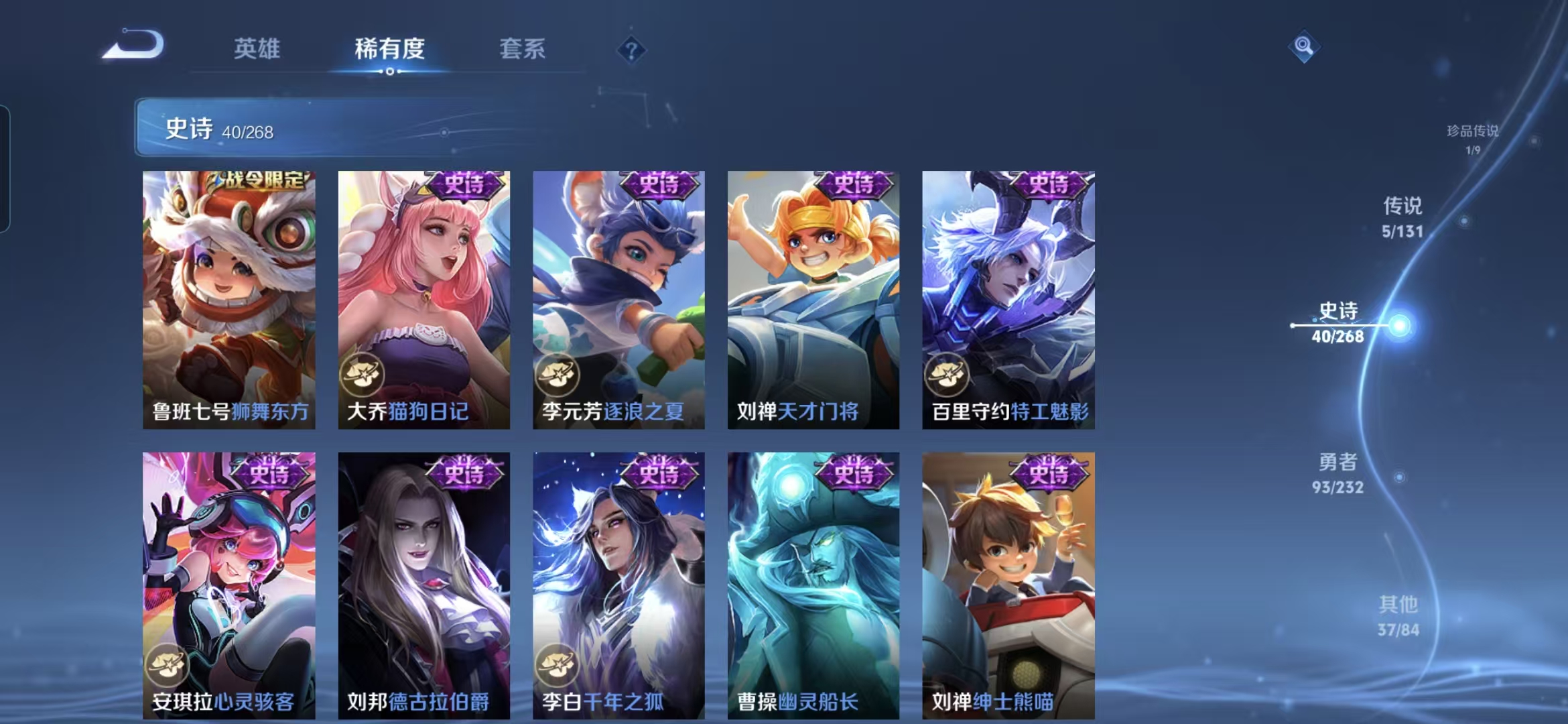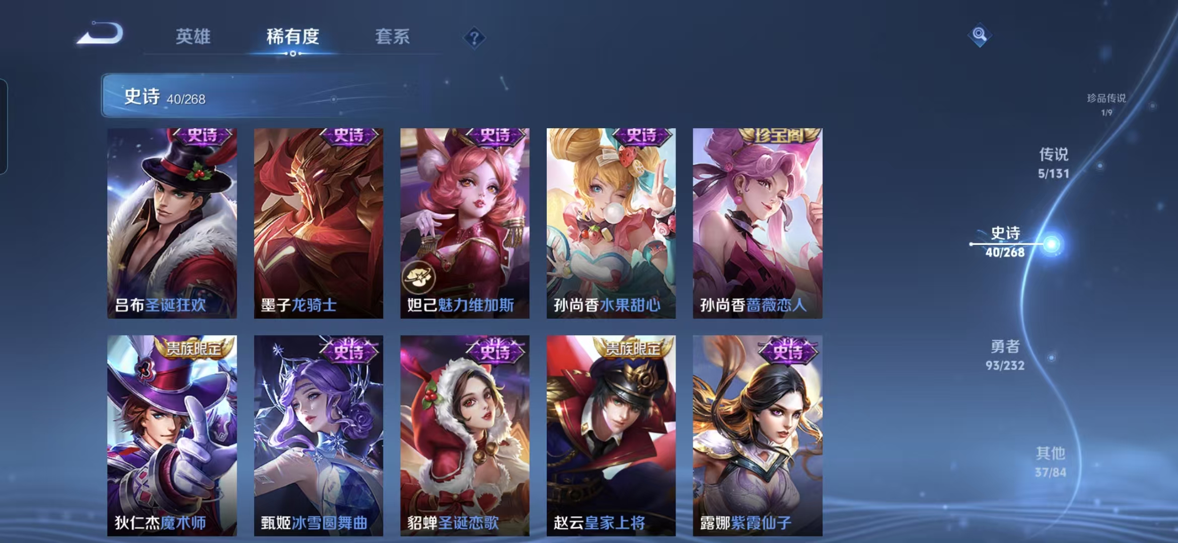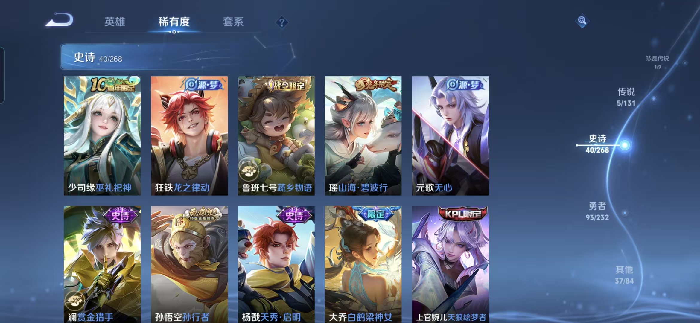 贵族等级:v7皮肤数:177传说品质5 荣耀典藏1 珍品传说1 情人节限定1 生肖限定1 英雄数:125