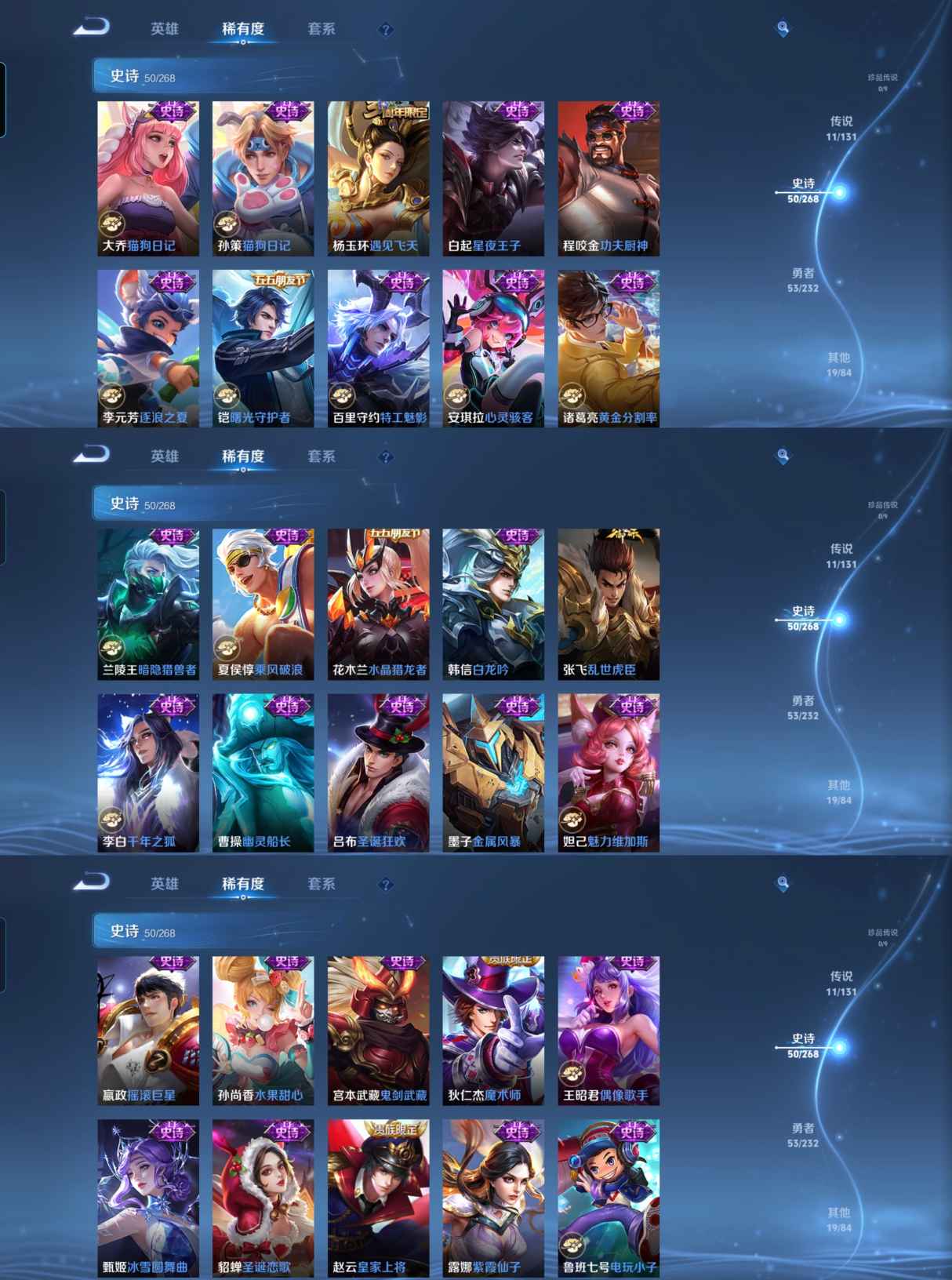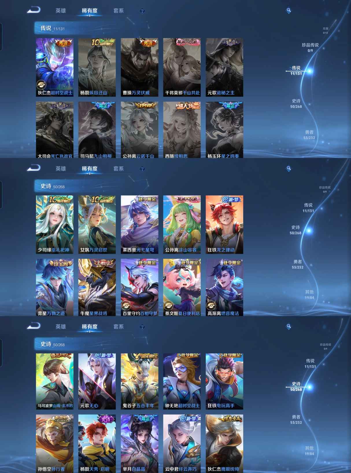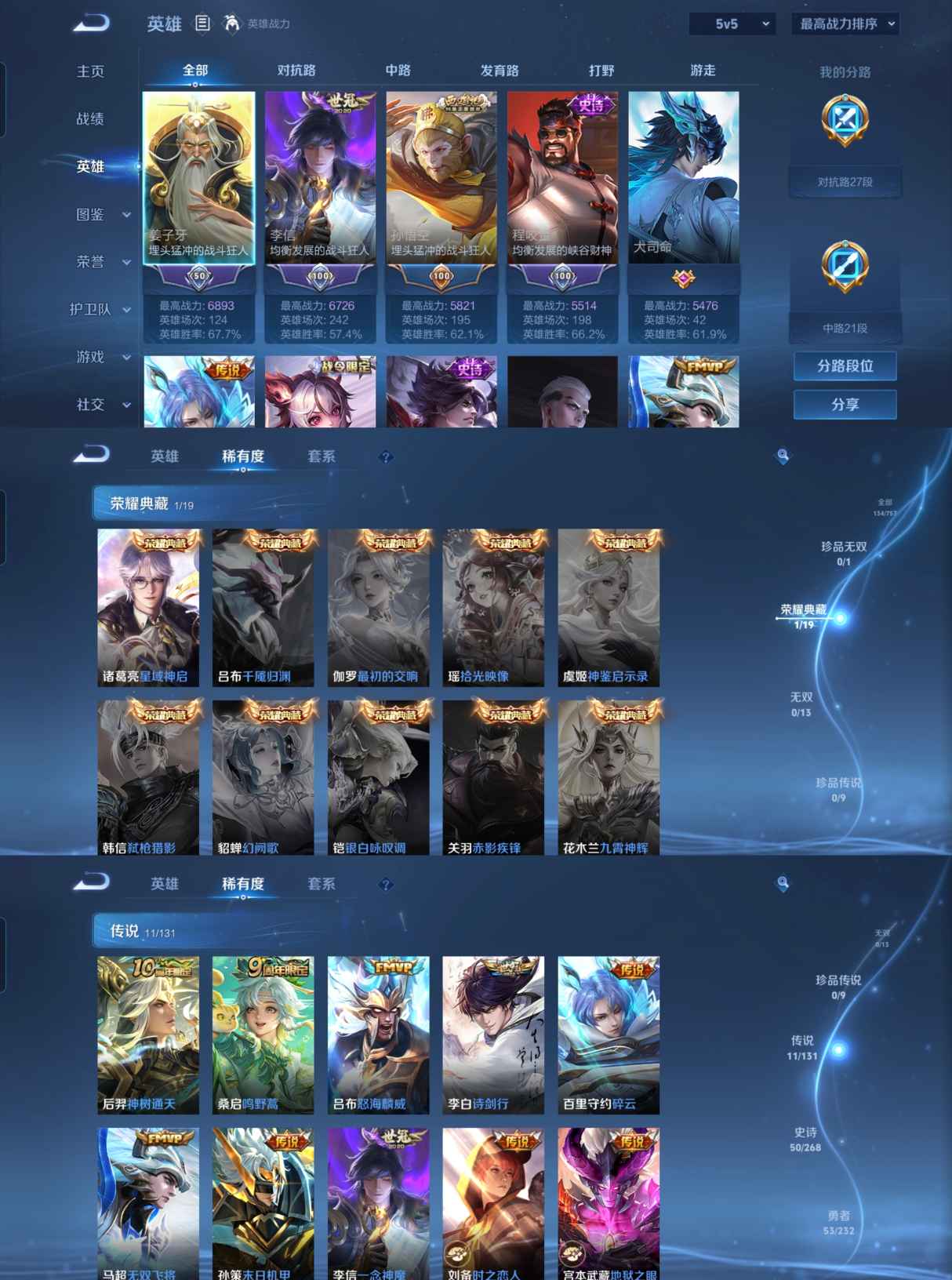 贵族等级:v7皮肤数:134传说品质11 荣耀典藏1 生肖限定1 英雄数:126