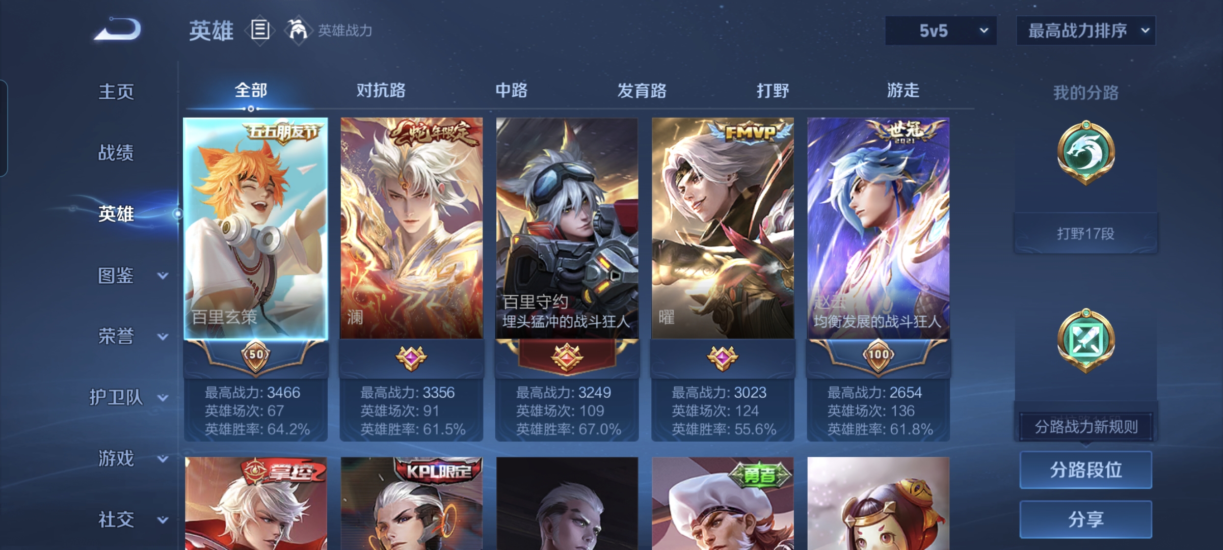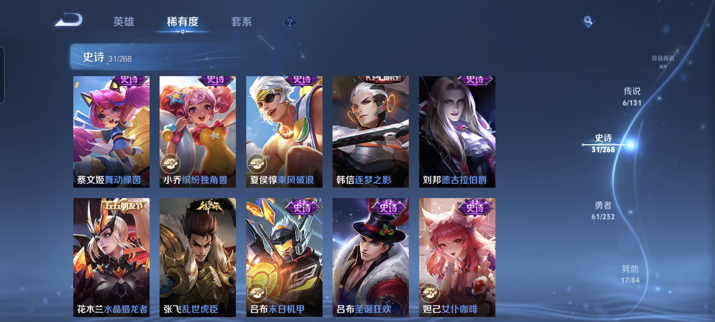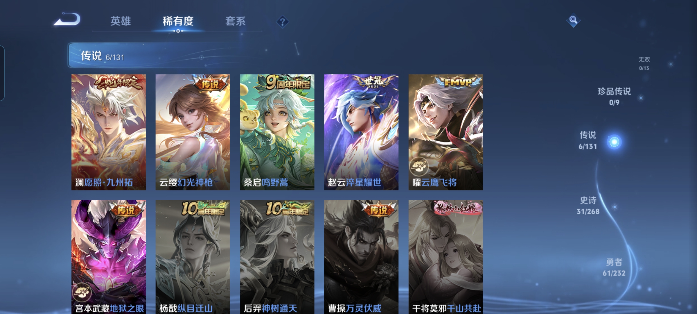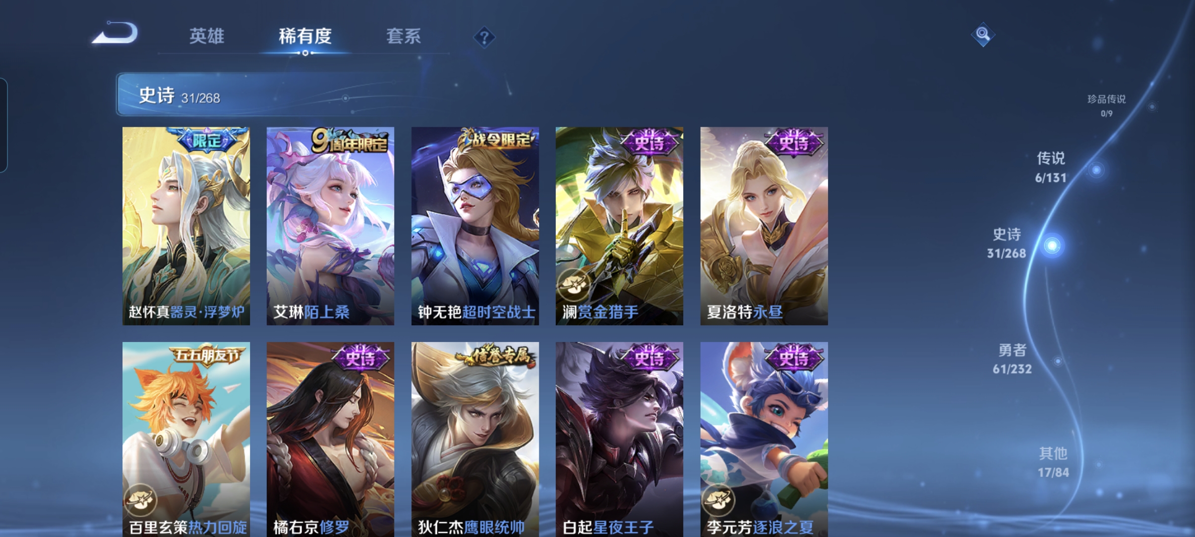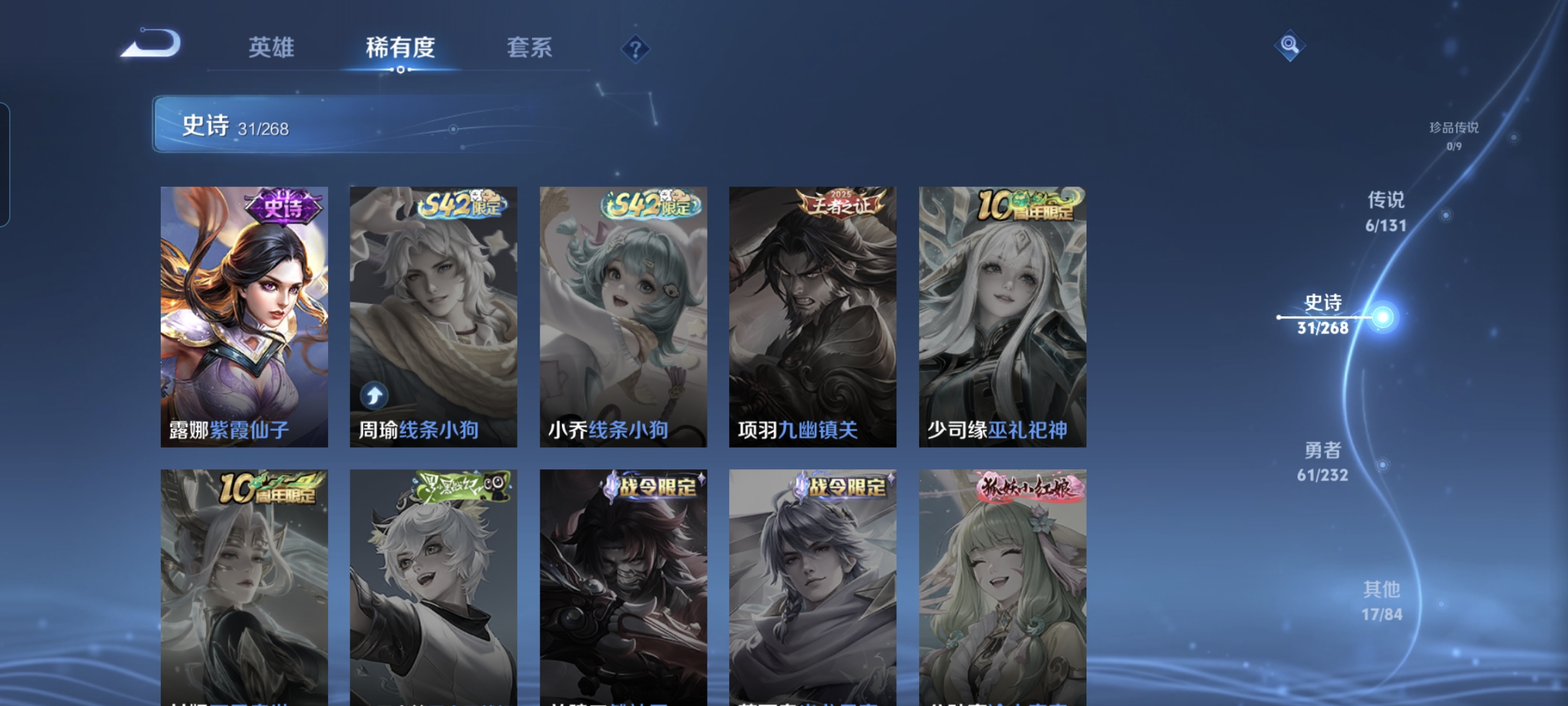贵族等级:v6皮肤数:115传说品质6 生肖限定1 英雄数:124