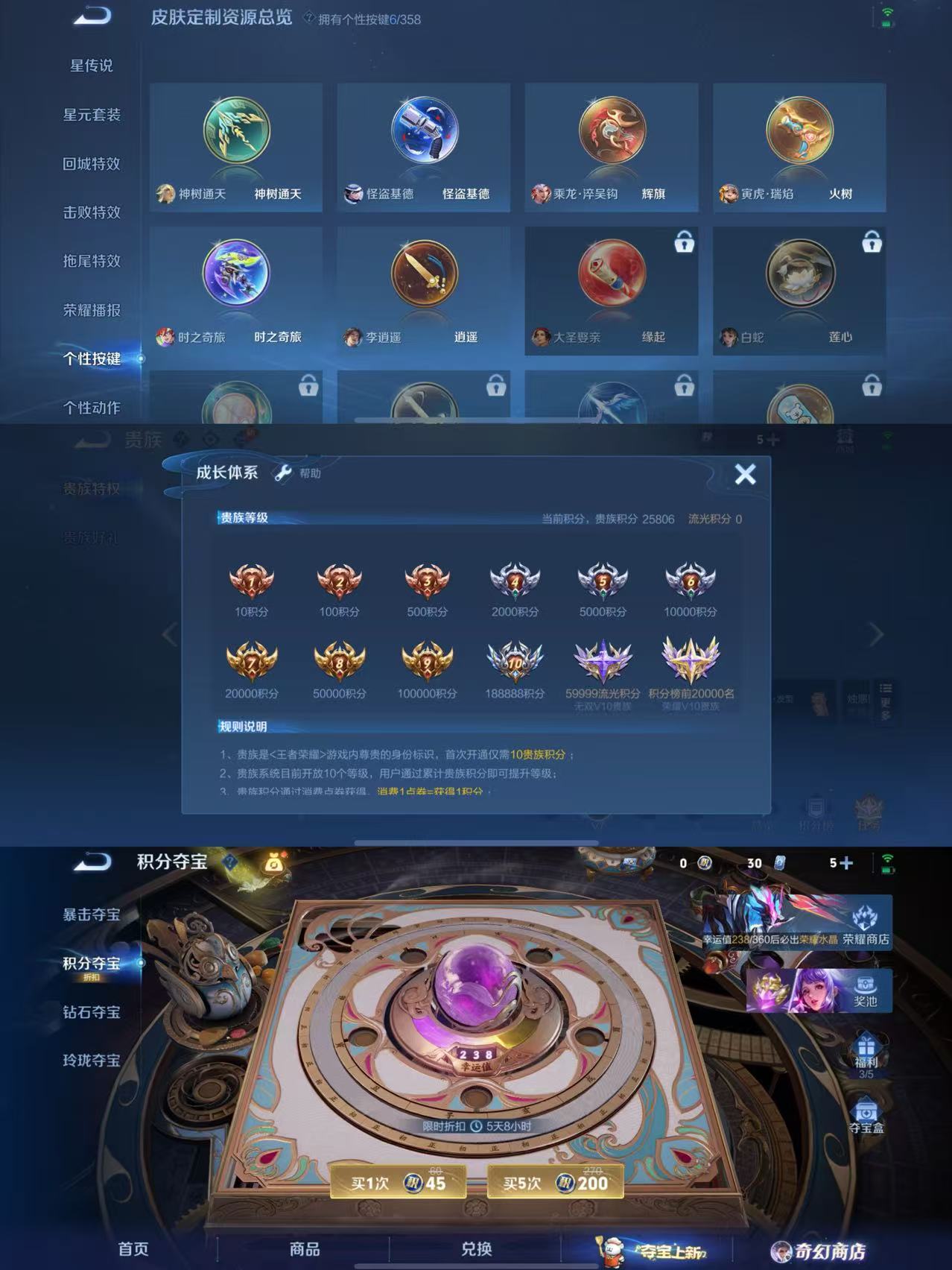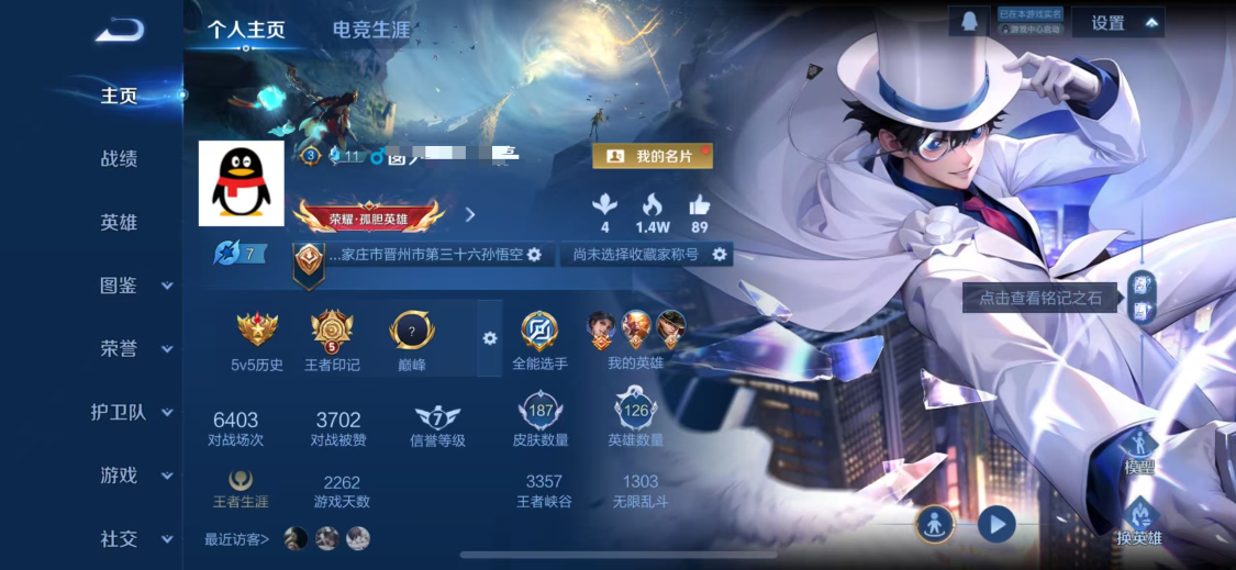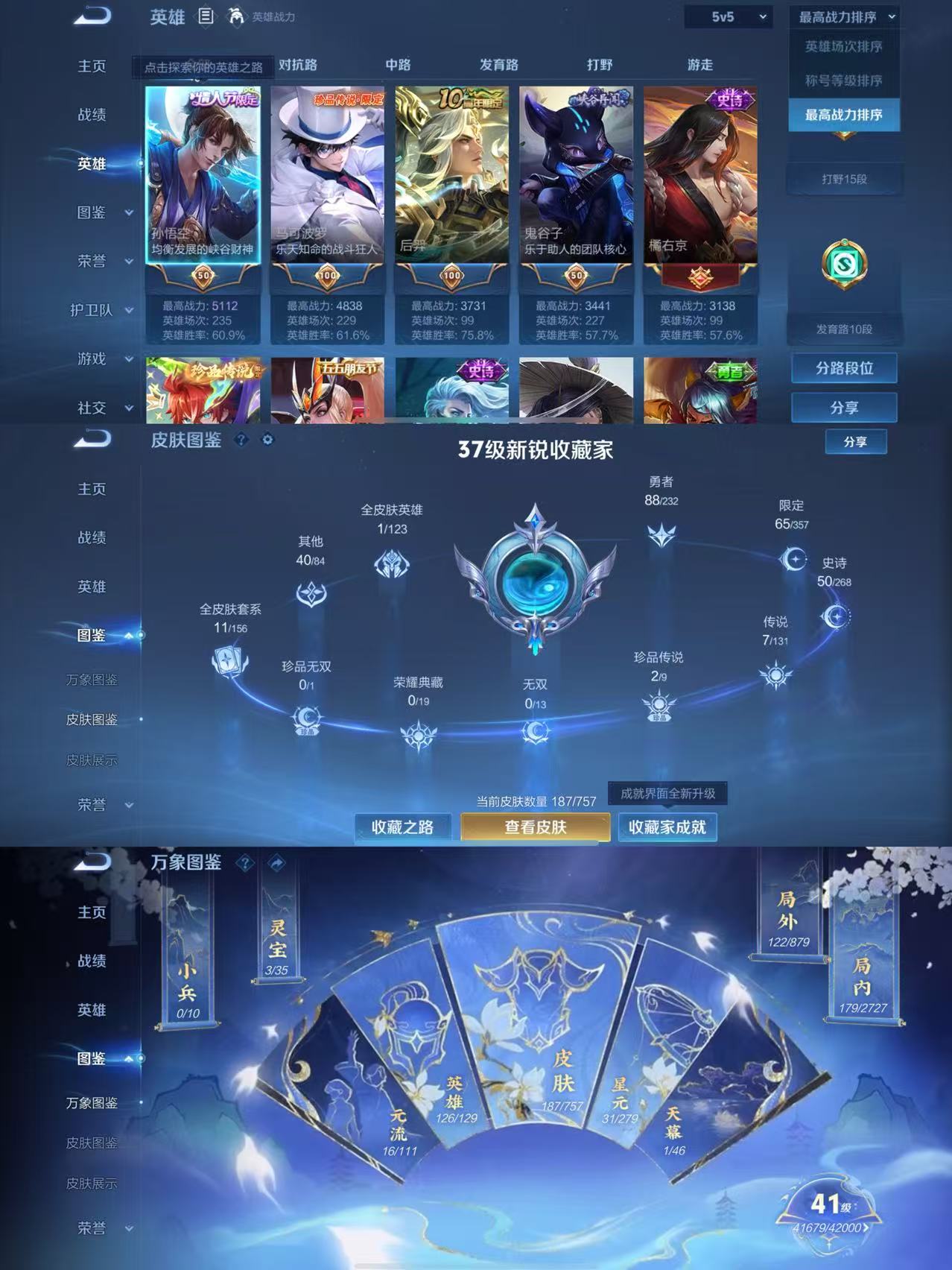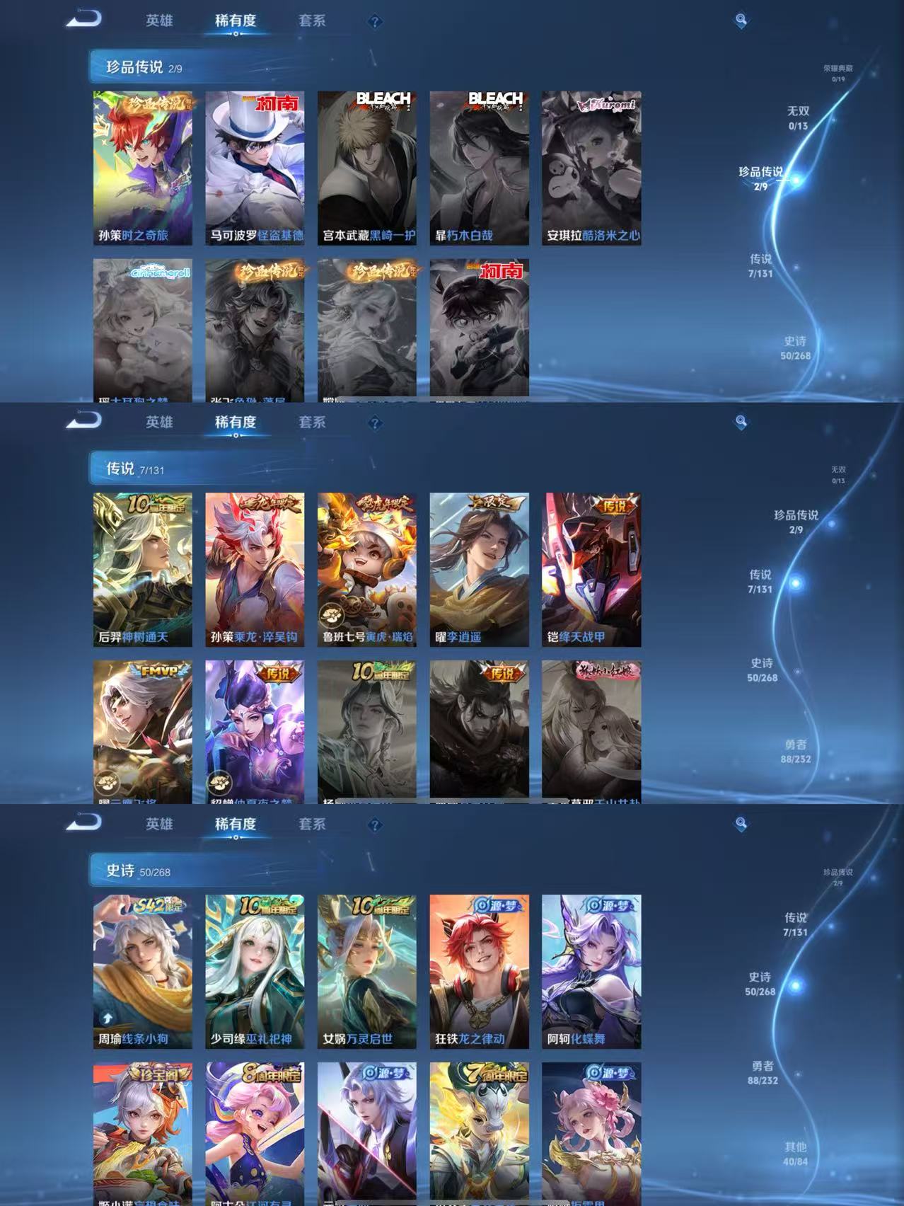 贵族等级:v7皮肤数:187传说品质7 情人节限定1 珍品传说2 生肖限定2 英雄数:126