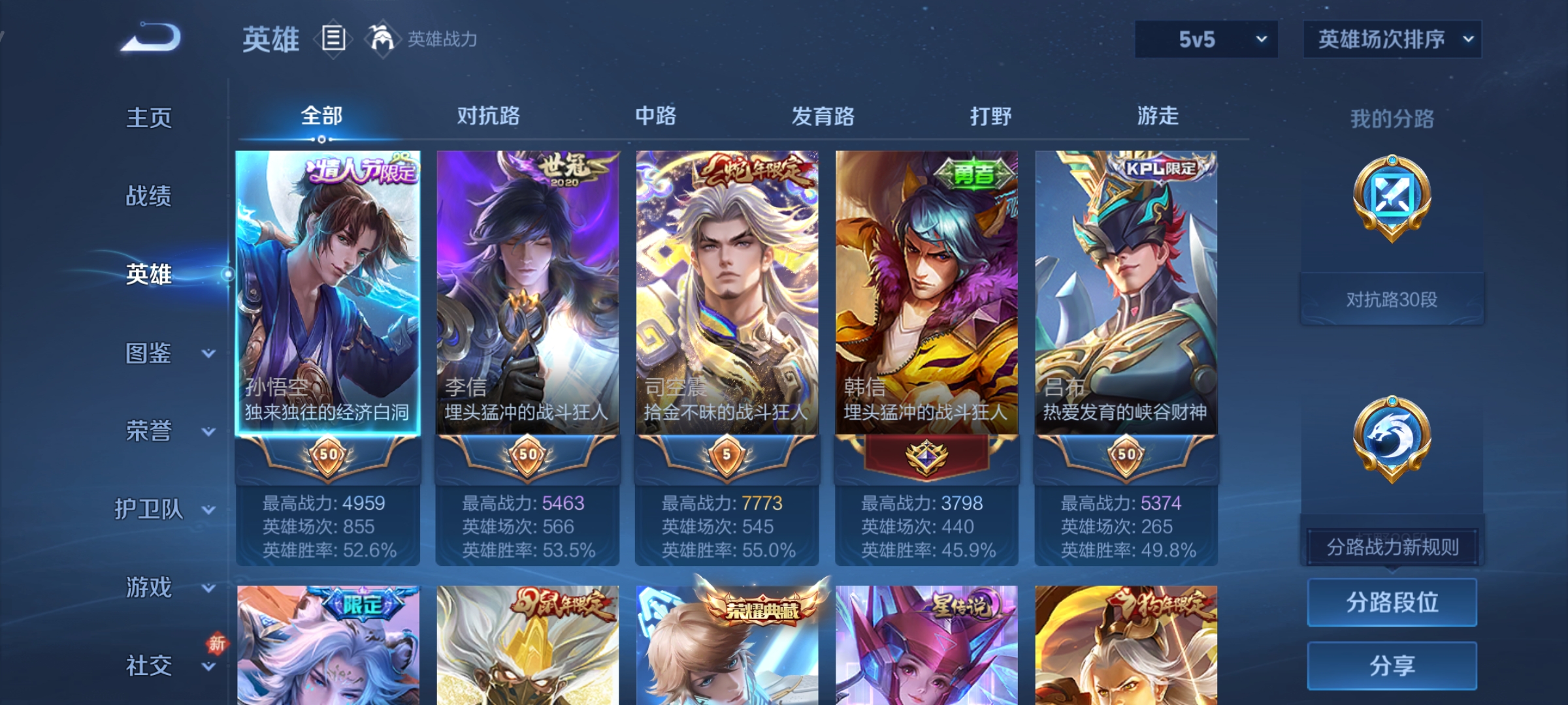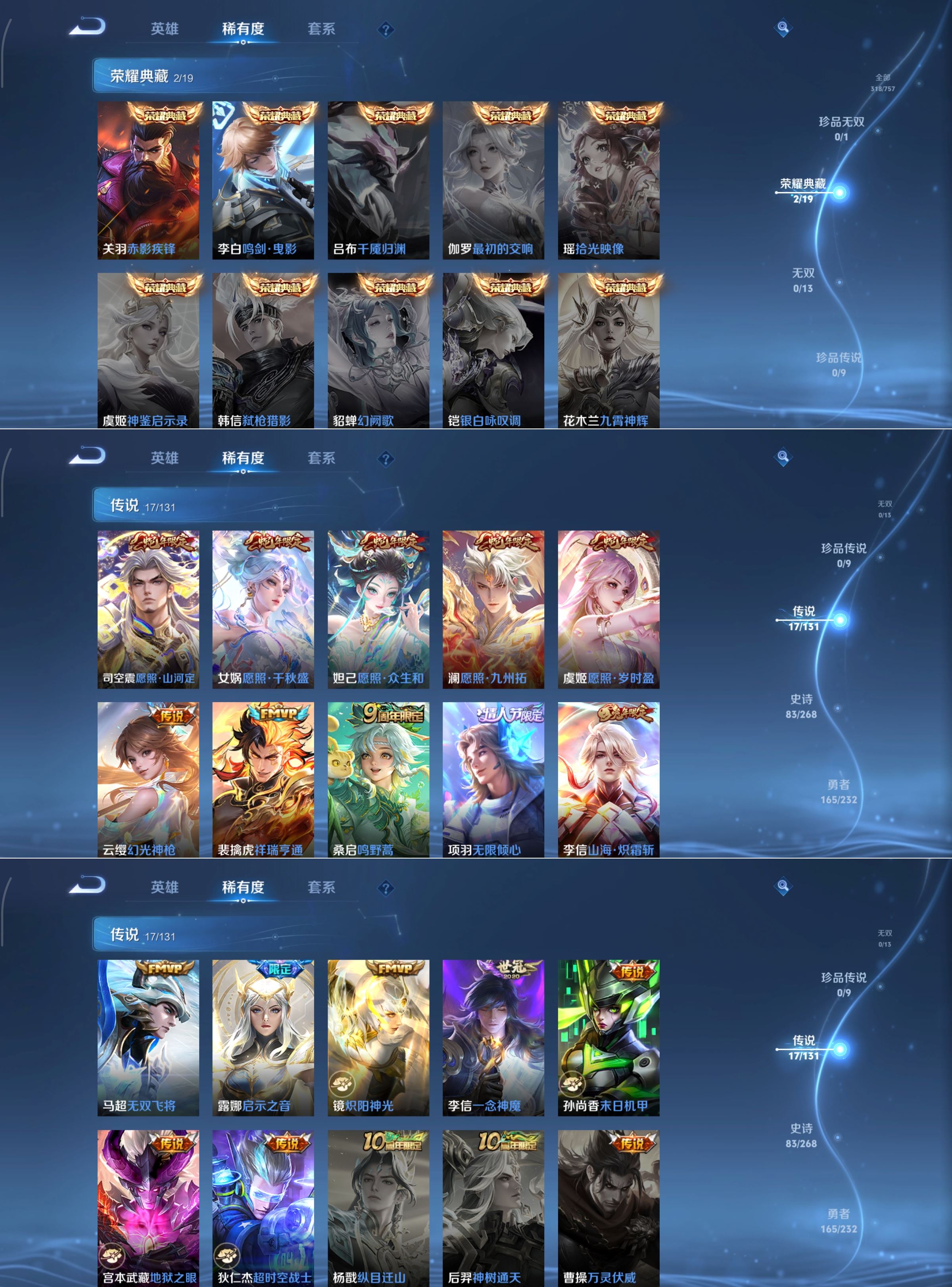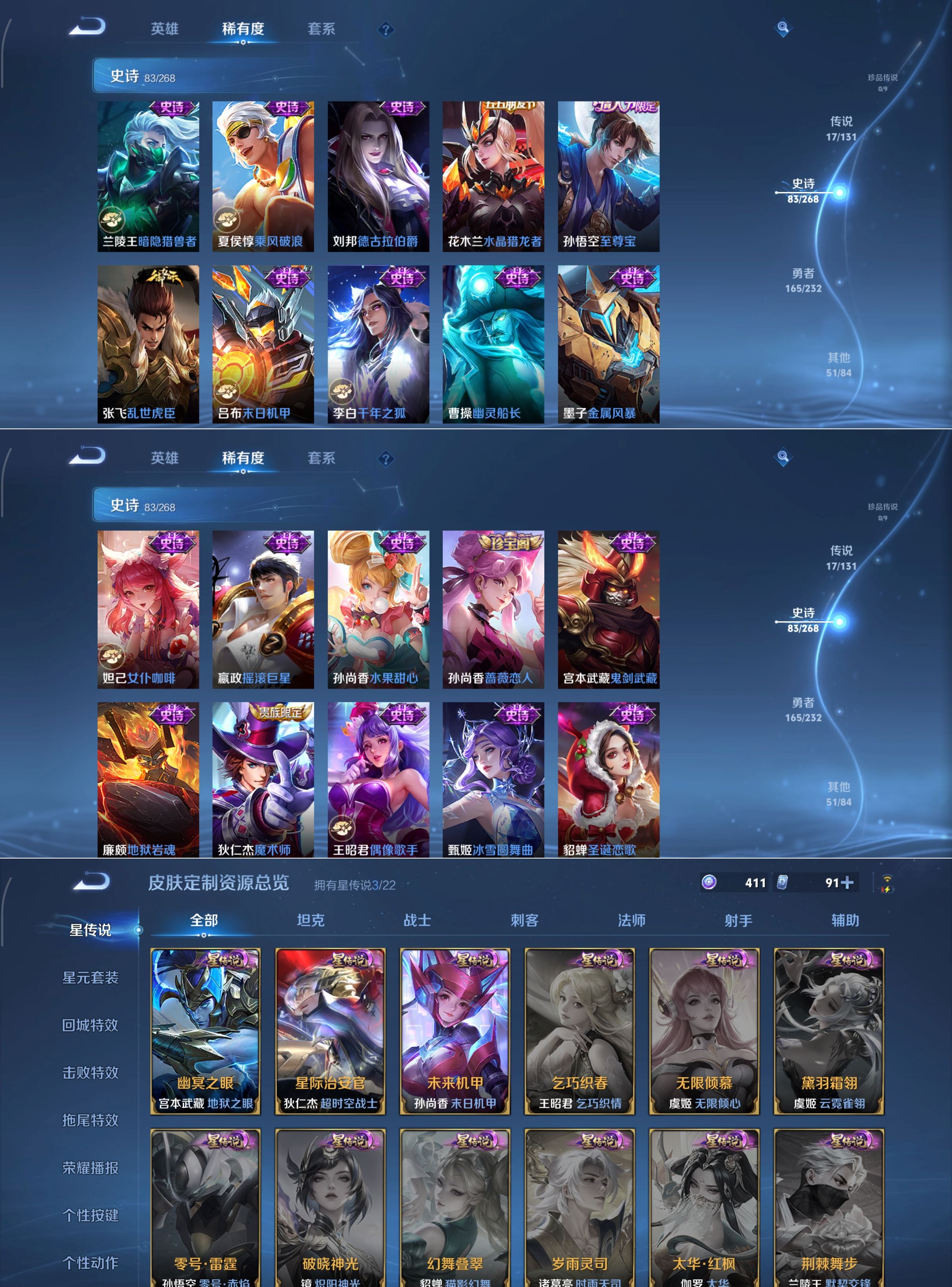 贵族等级:v7皮肤数:318生肖限定8 荣耀典藏2 传说品质17 情人节限定2 英雄数:126