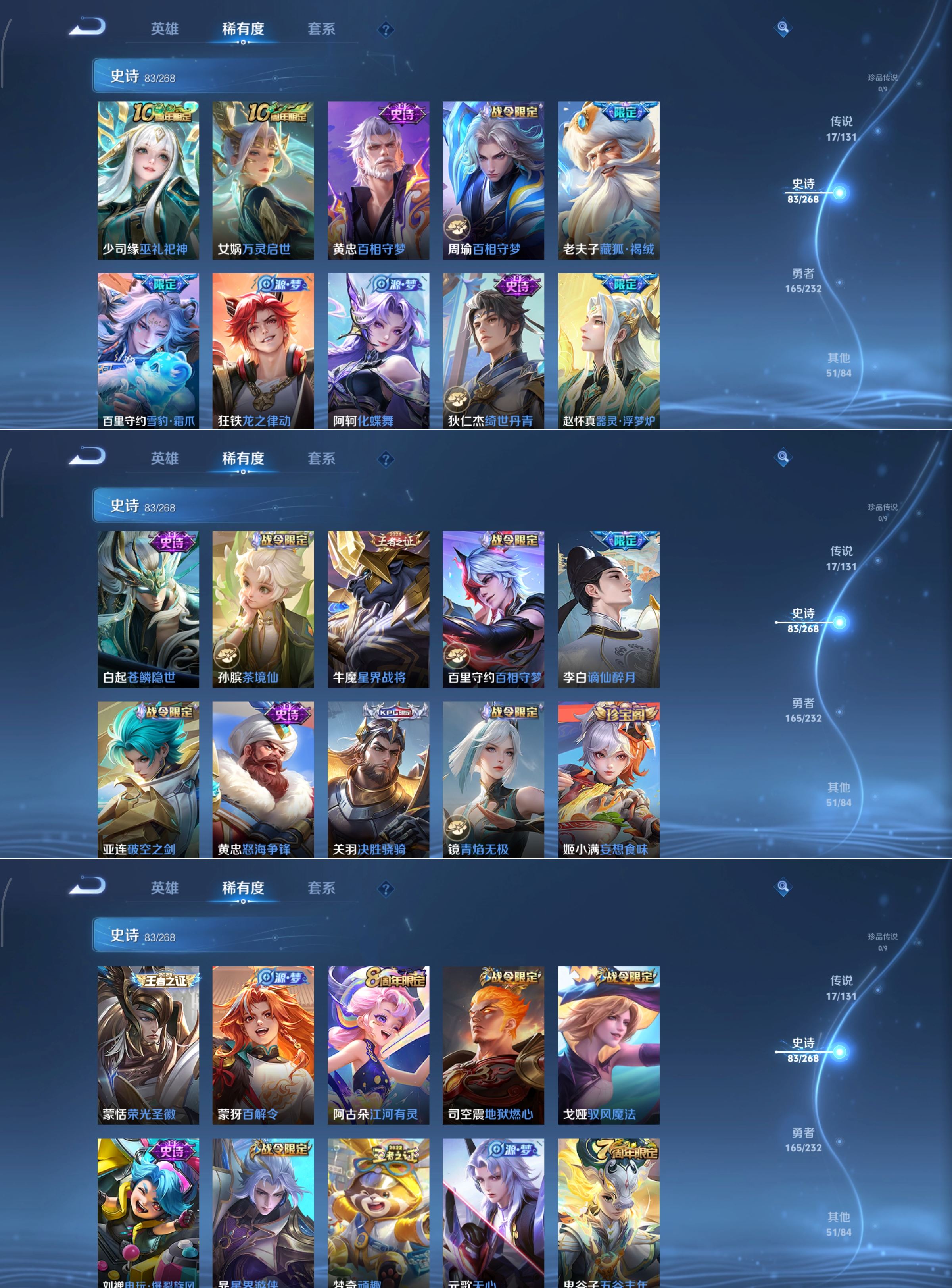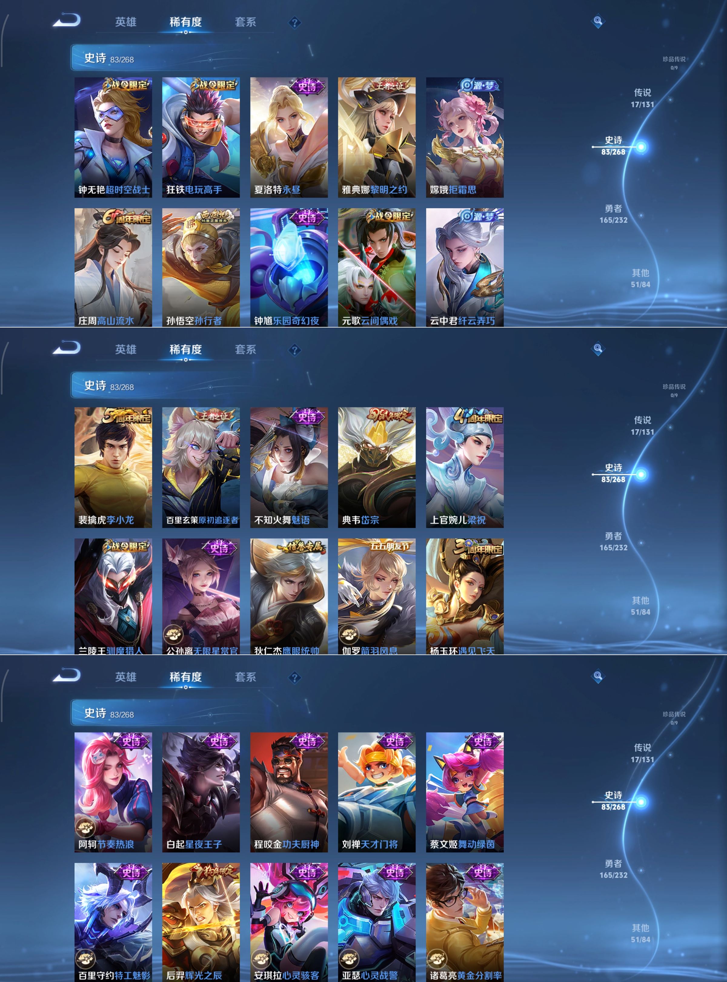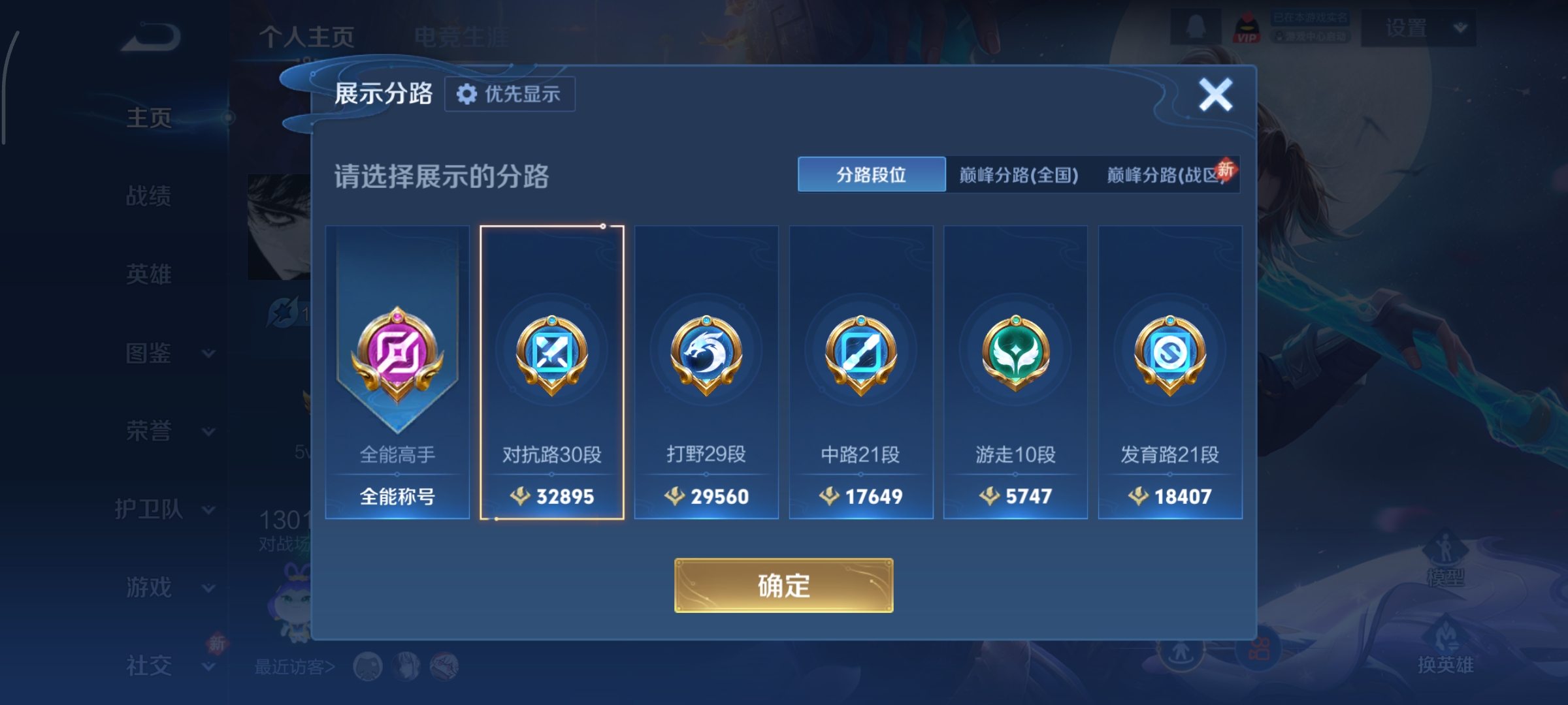 贵族等级:v7皮肤数:318生肖限定8 荣耀典藏2 传说品质17 情人节限定2 英雄数:126