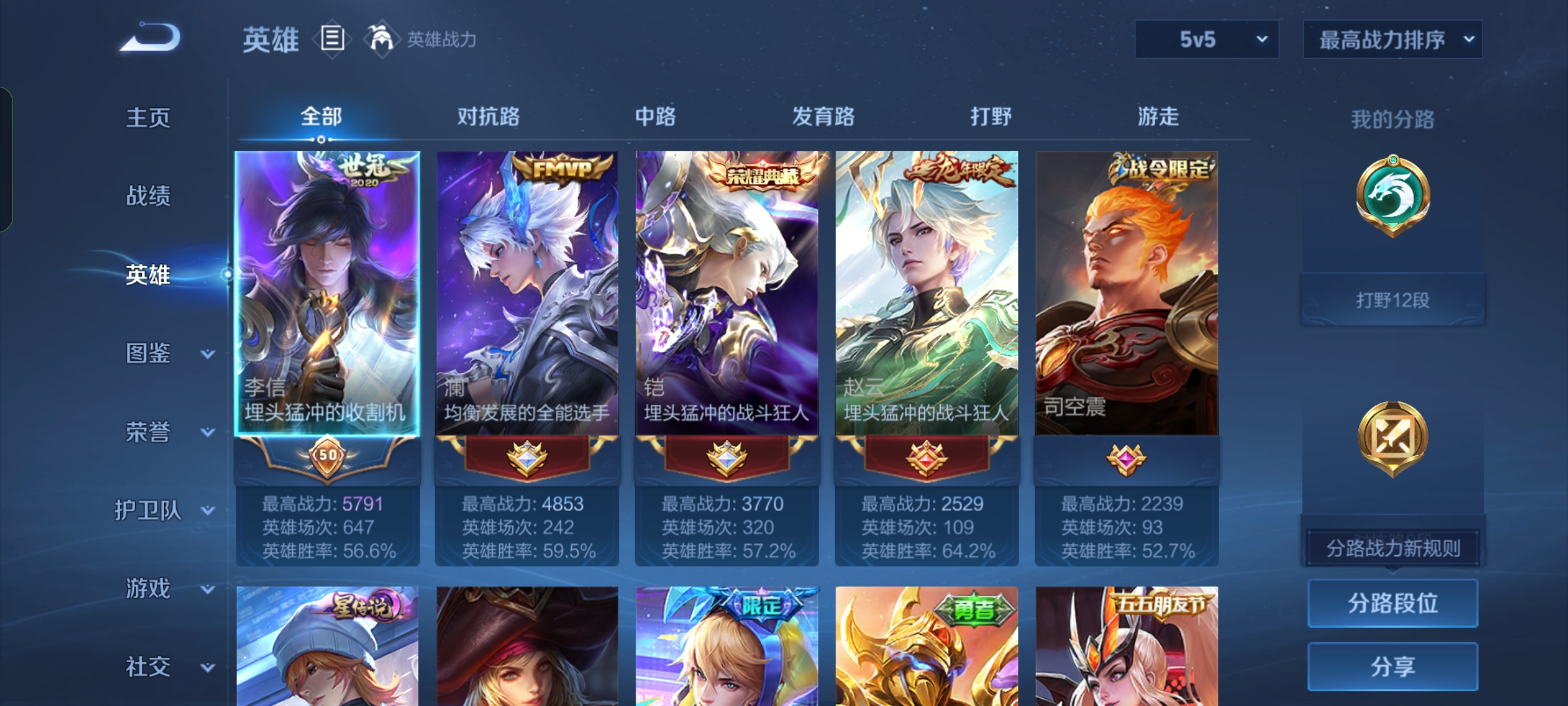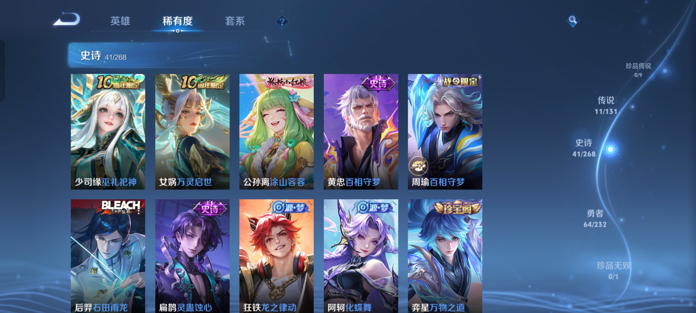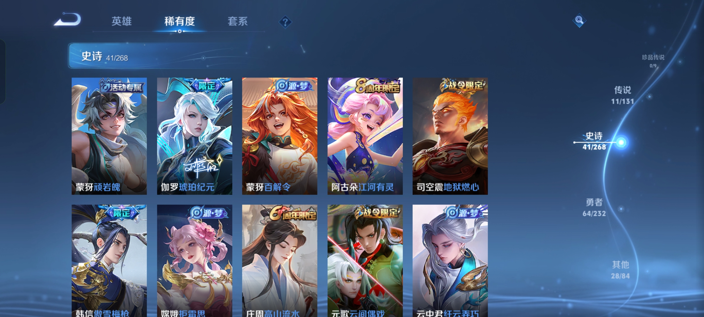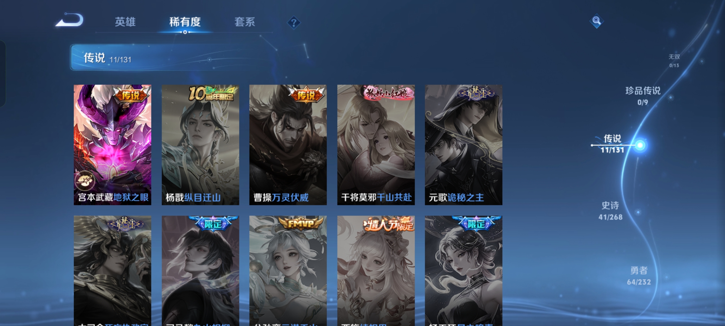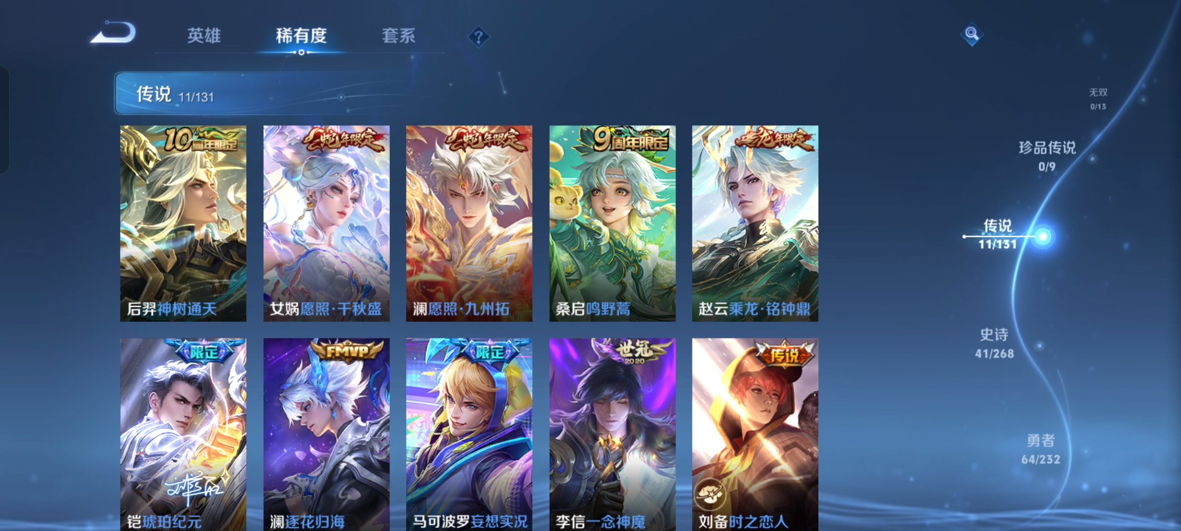 贵族等级:v7皮肤数:145传说品质11 生肖限定3 荣耀典藏1 英雄数:127