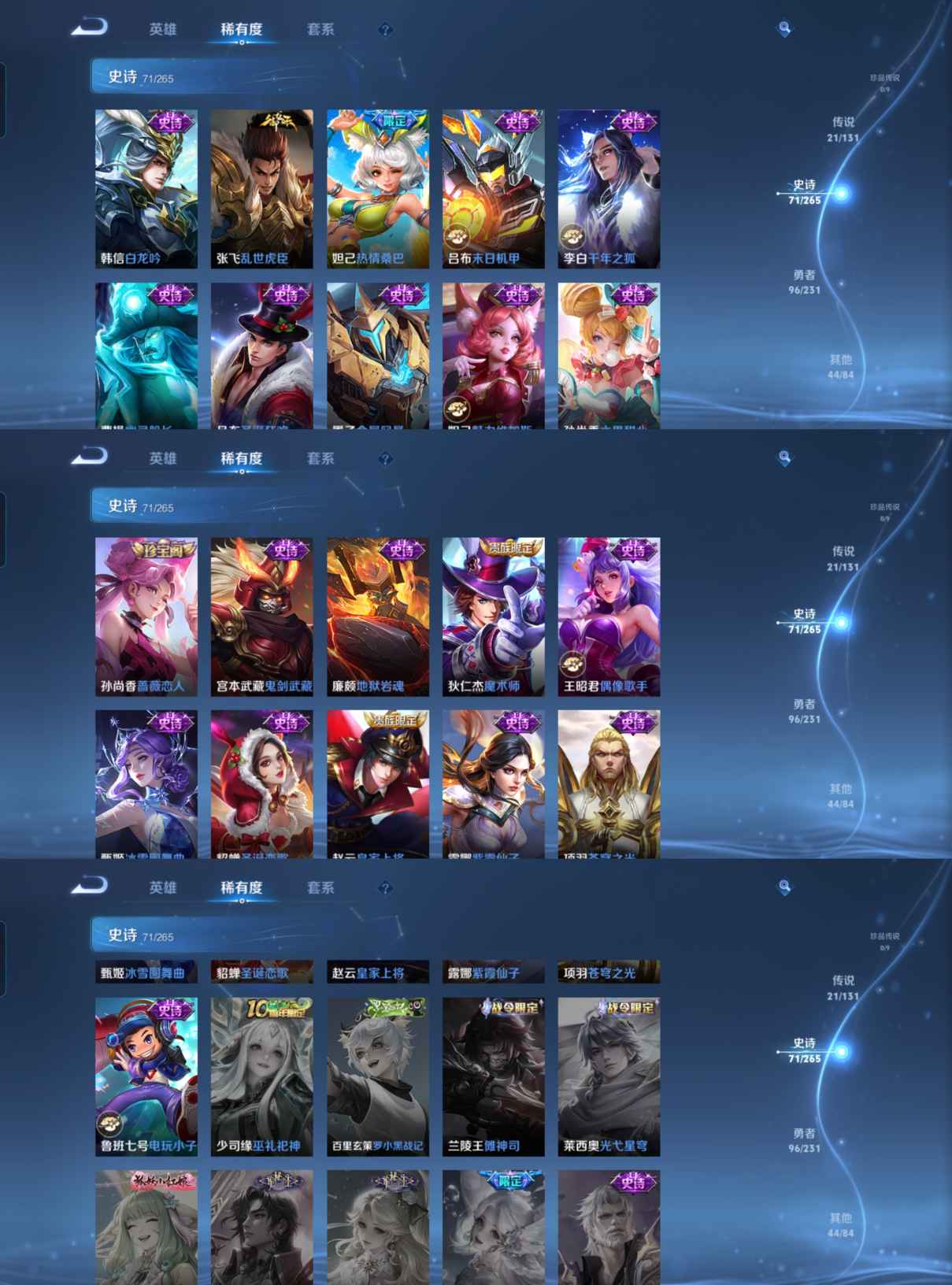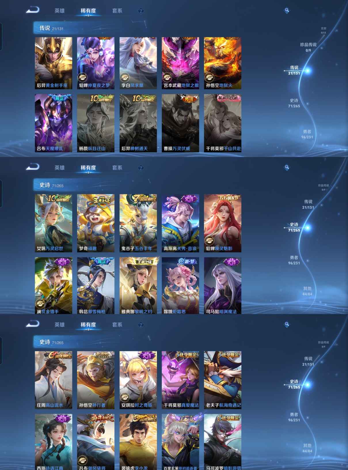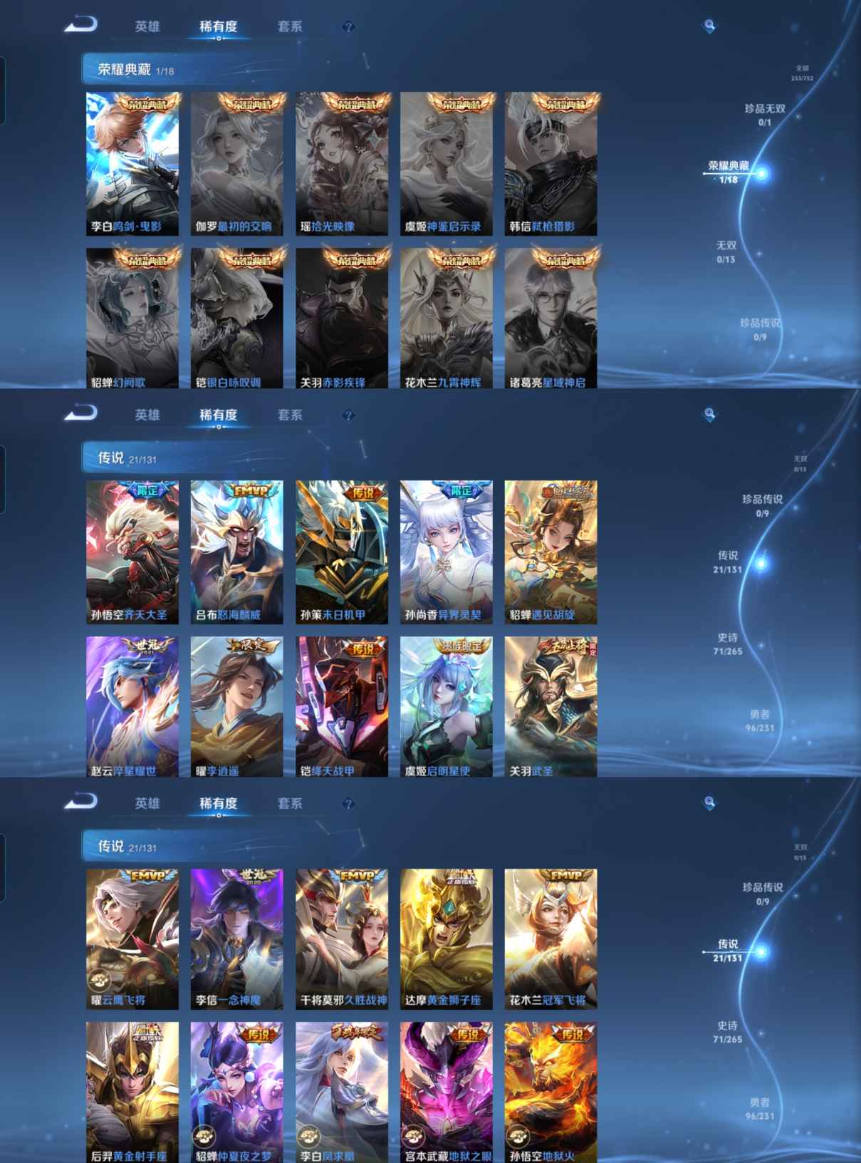 贵族等级:v8皮肤数:234传说品质21 情人节限定2 生肖限定5 荣耀典藏1 英雄数:126
