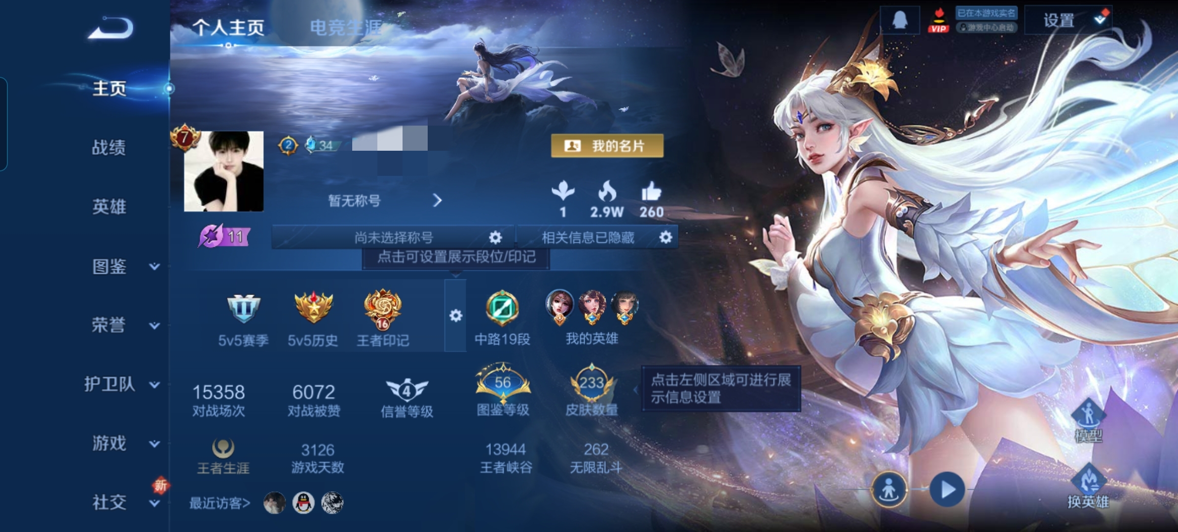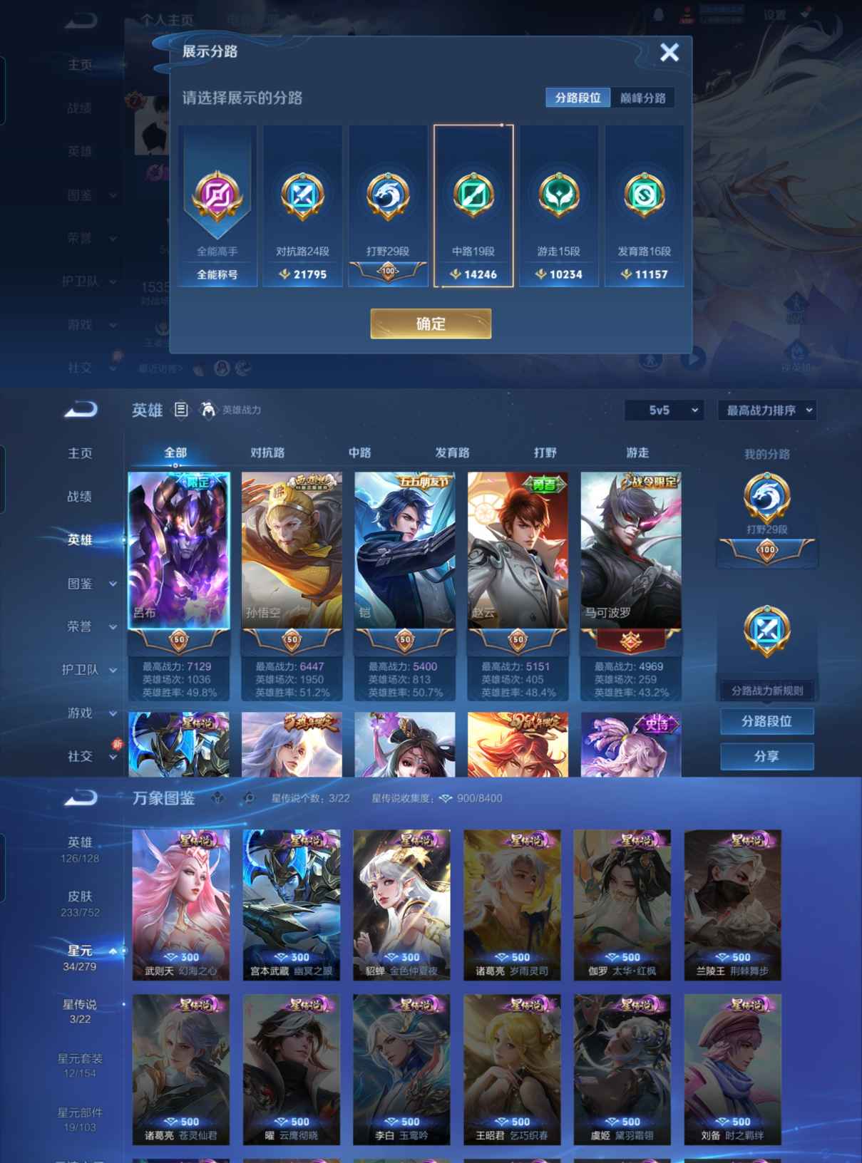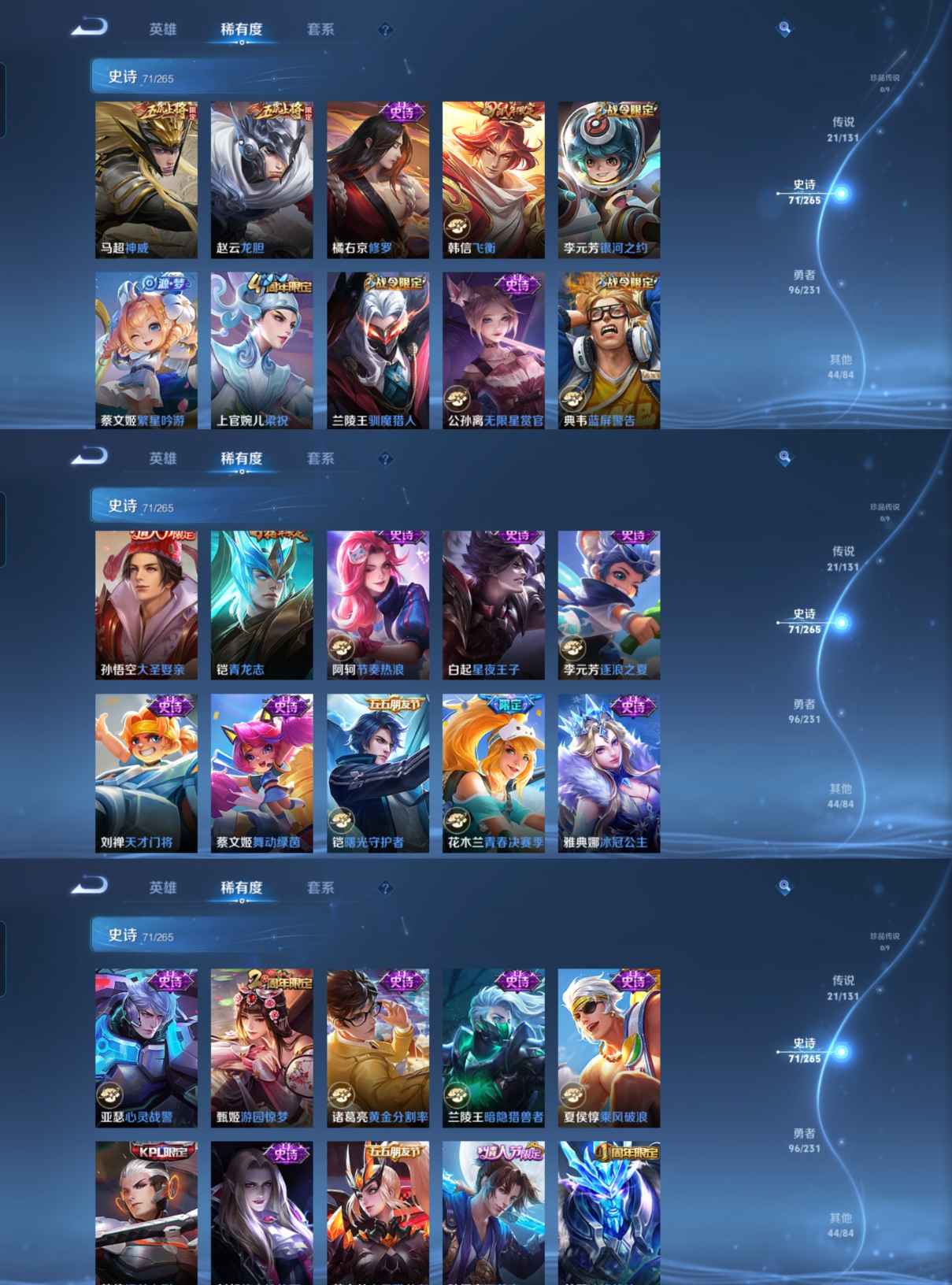 贵族等级:v8皮肤数:234传说品质21 情人节限定2 生肖限定5 荣耀典藏1 英雄数:126