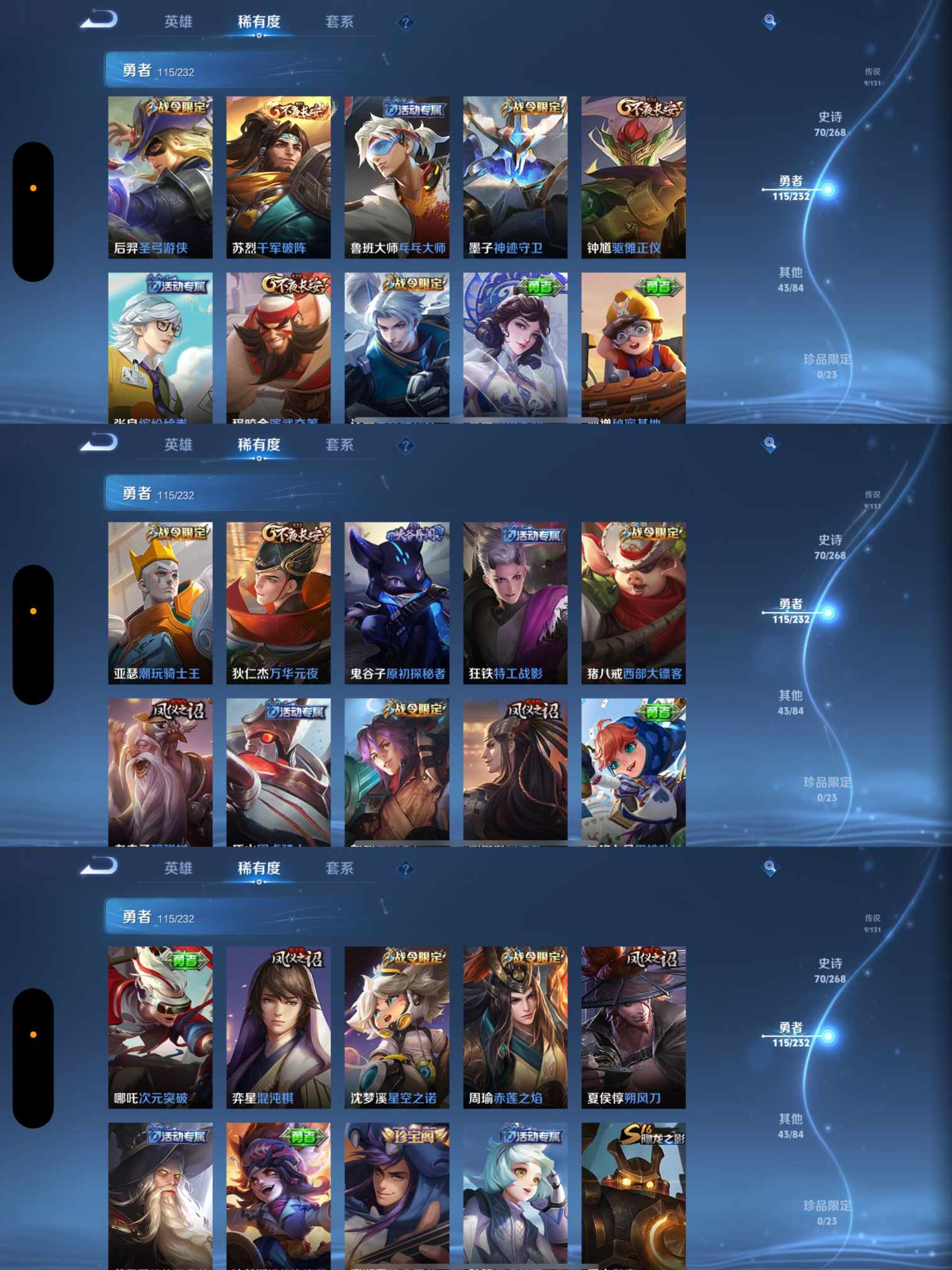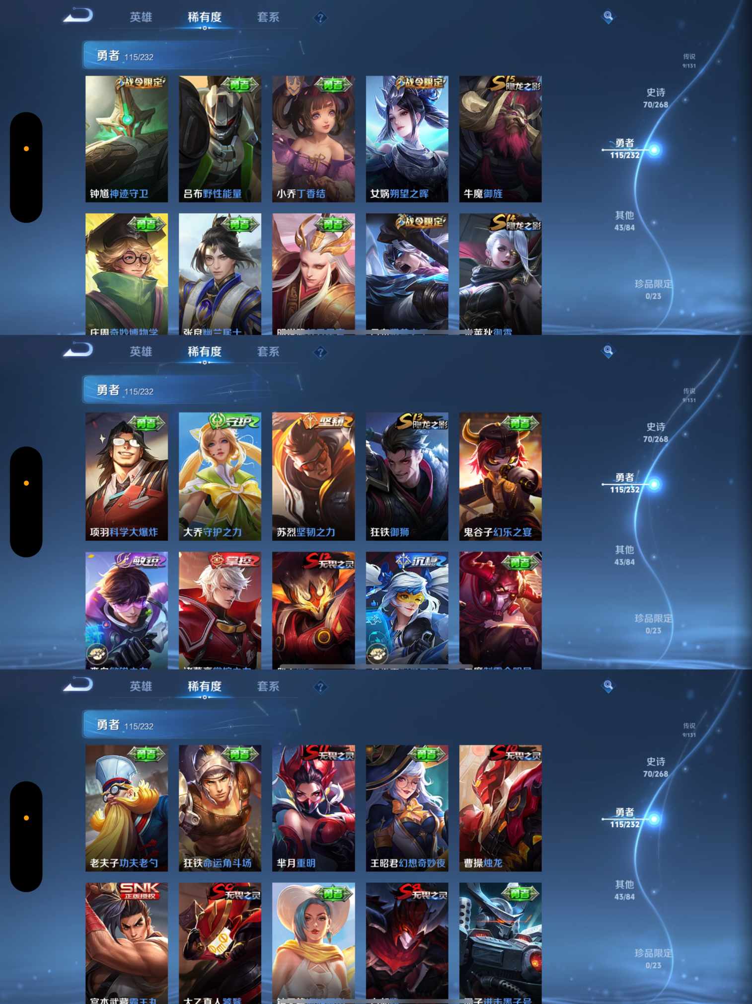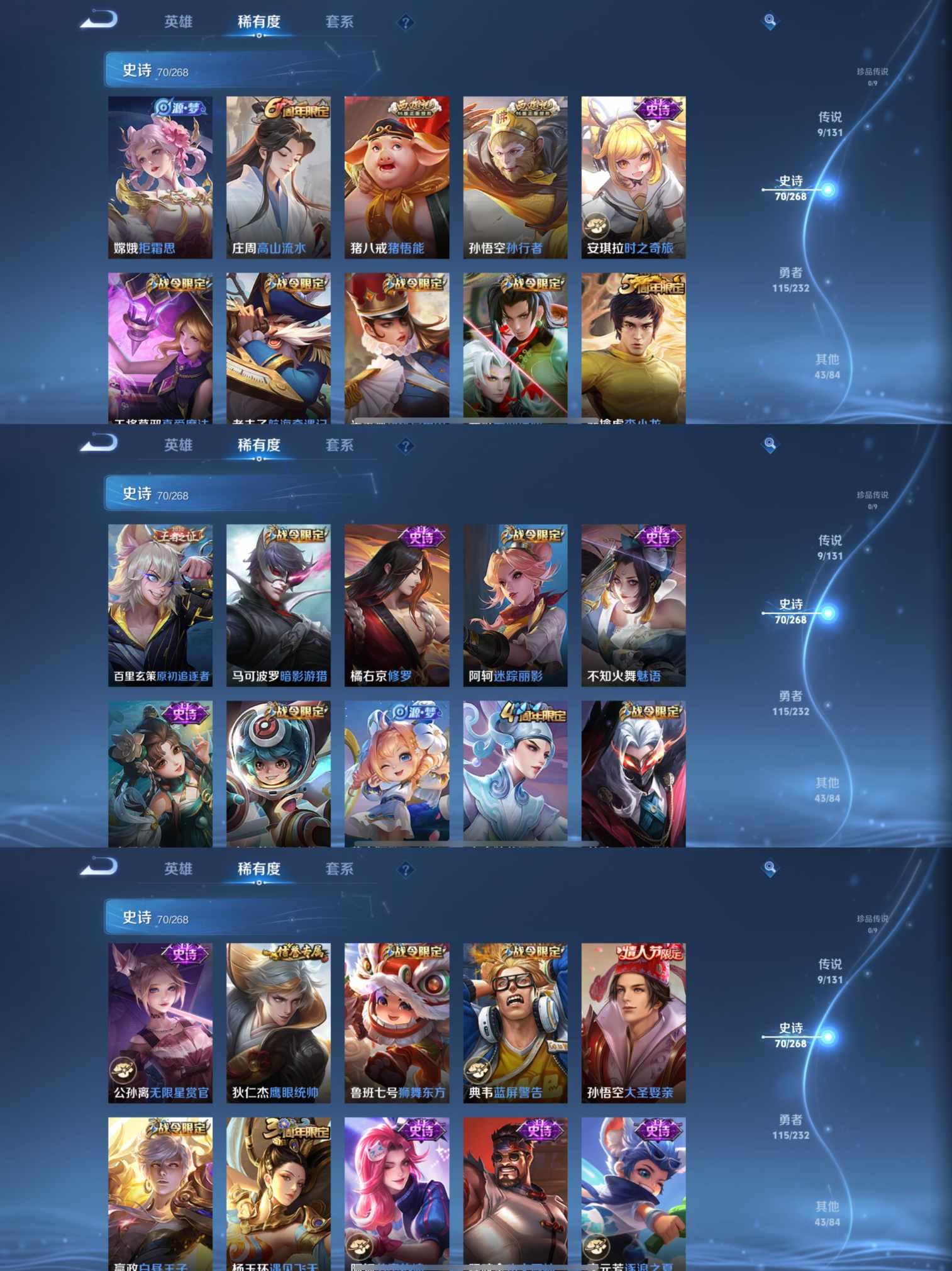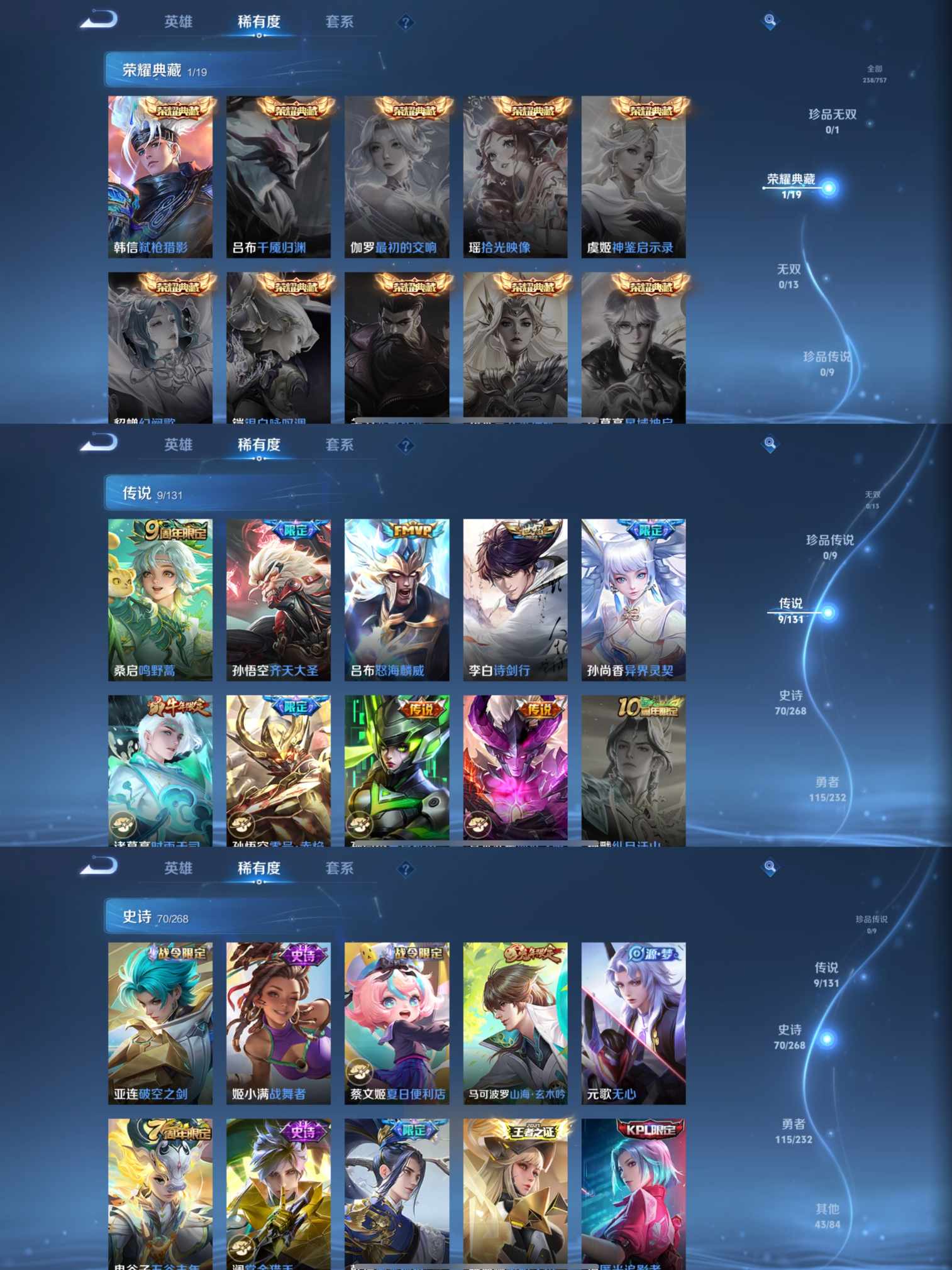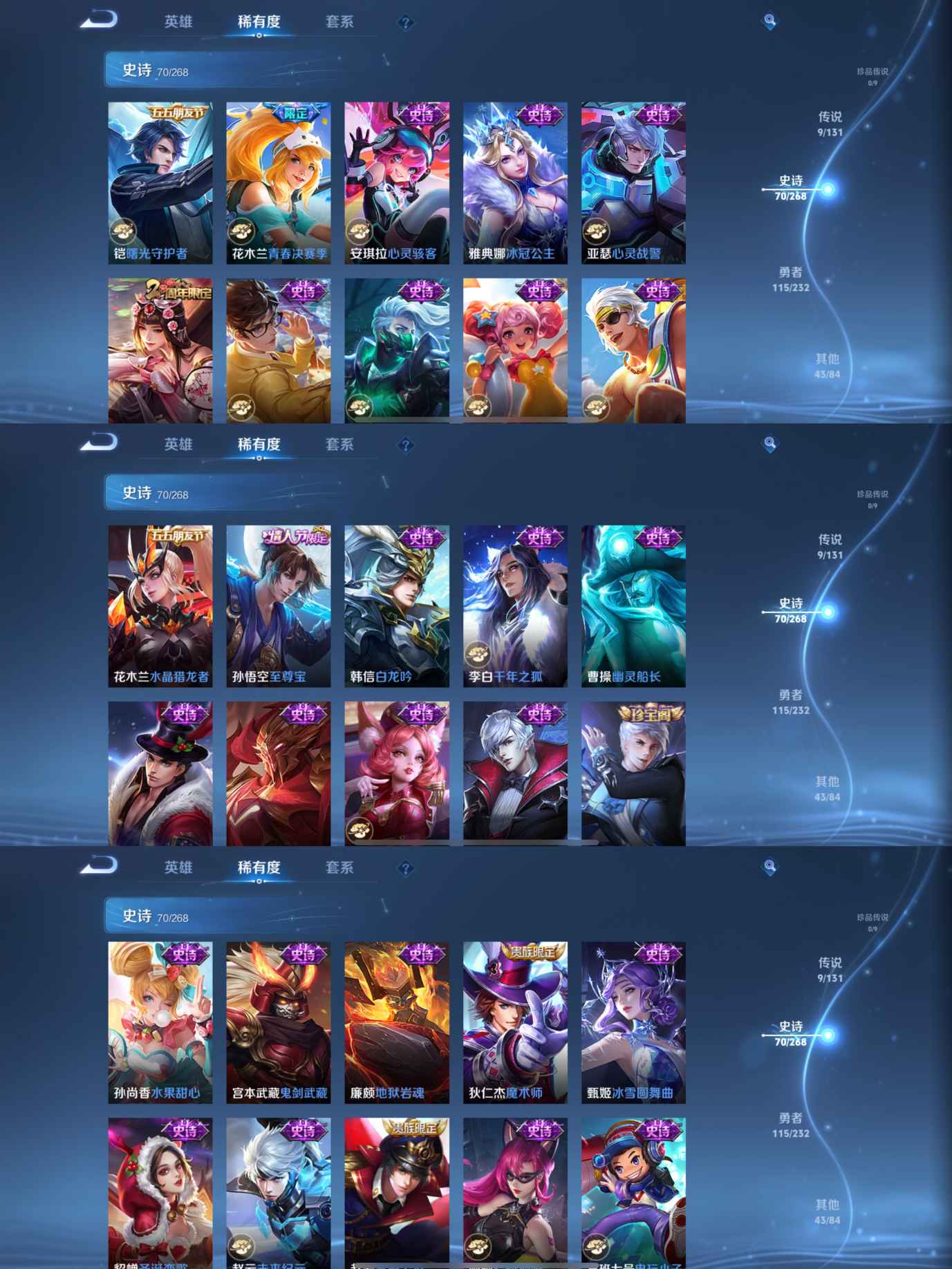 贵族等级:v7皮肤数:238传说品质9 生肖限定2 情人节限定2 荣耀典藏1 英雄数:126