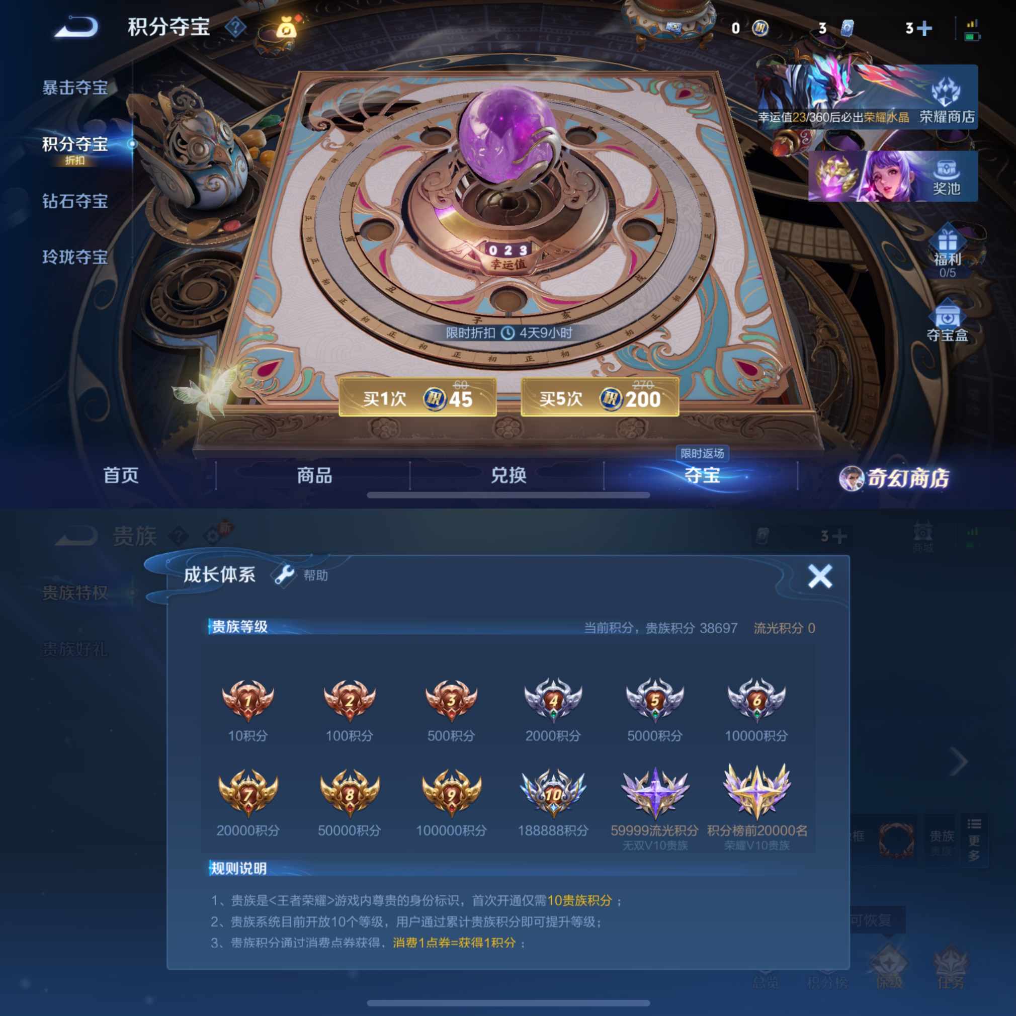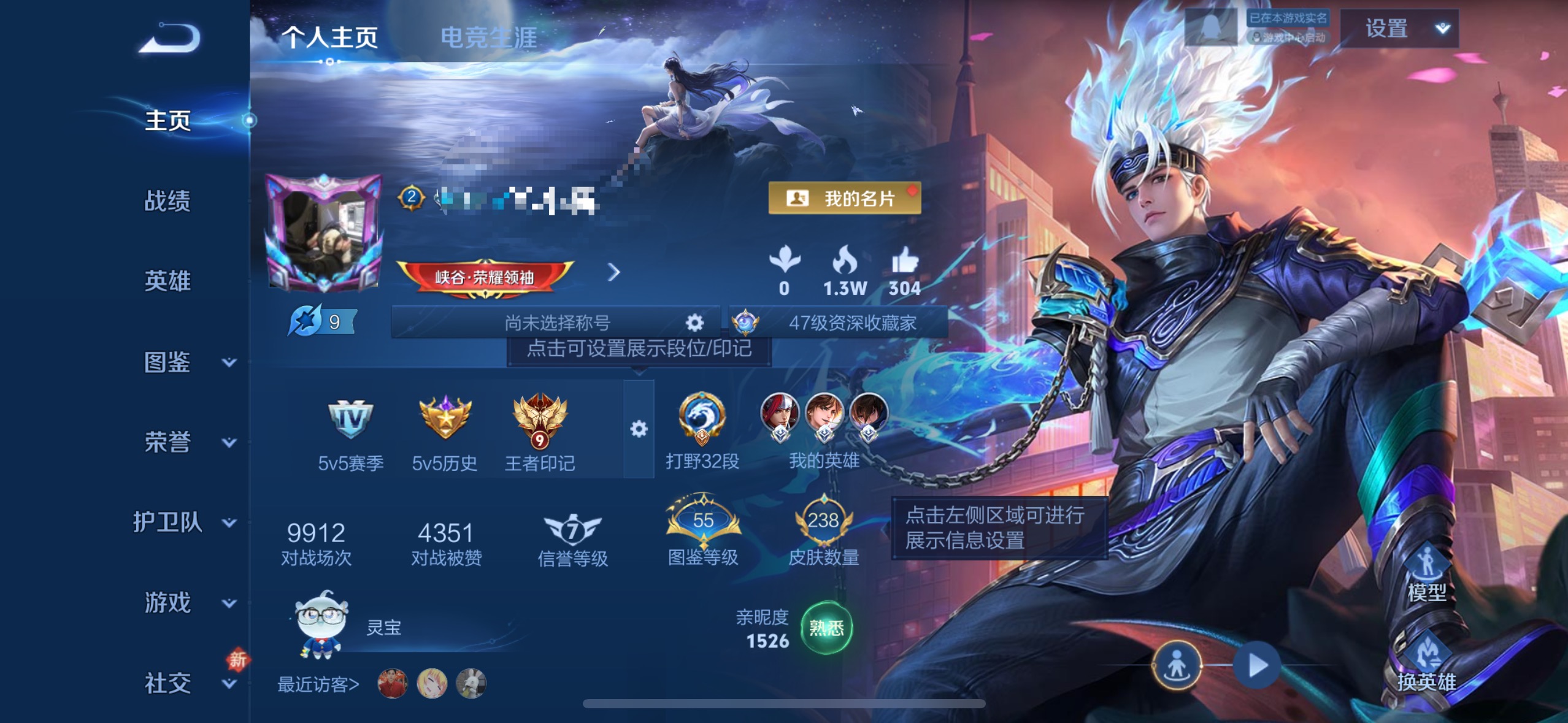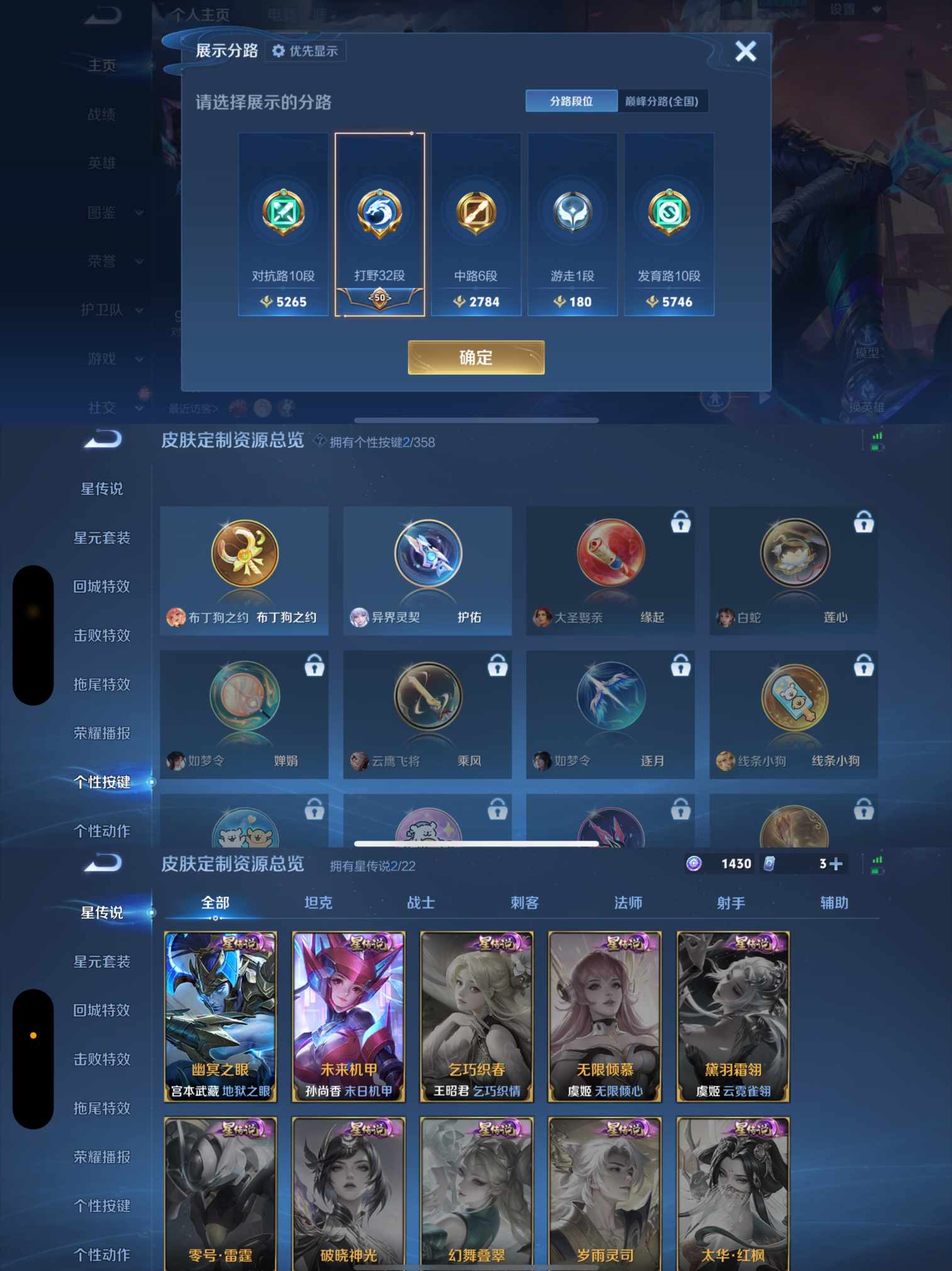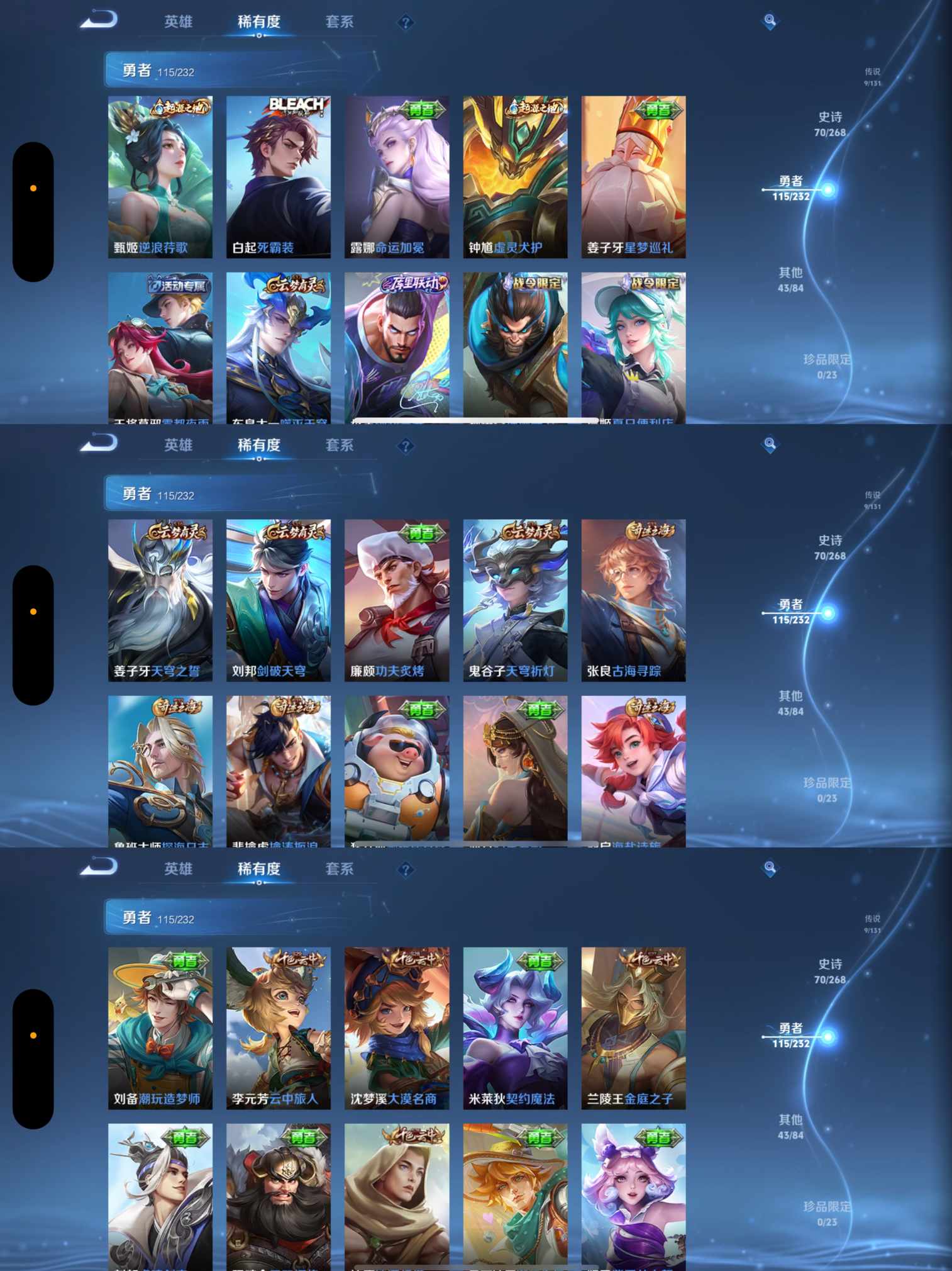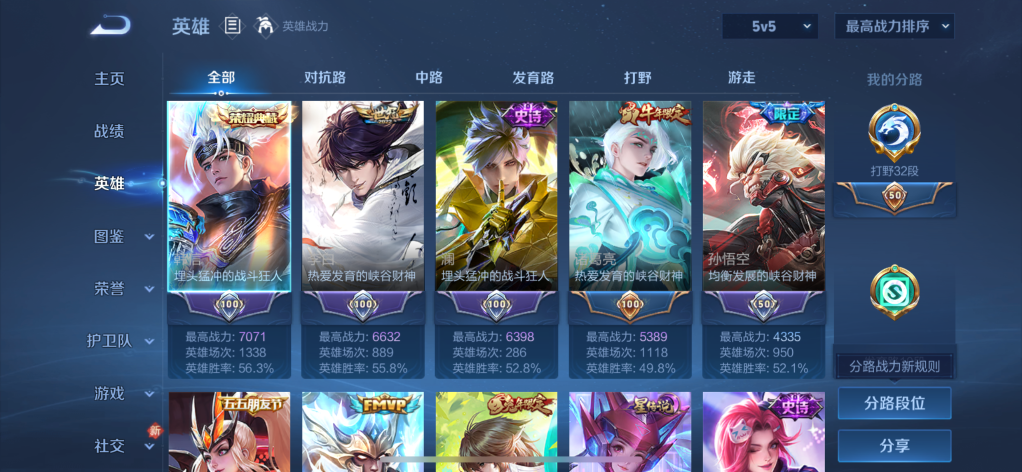 贵族等级:v7皮肤数:238传说品质9 生肖限定2 情人节限定2 荣耀典藏1 英雄数:126