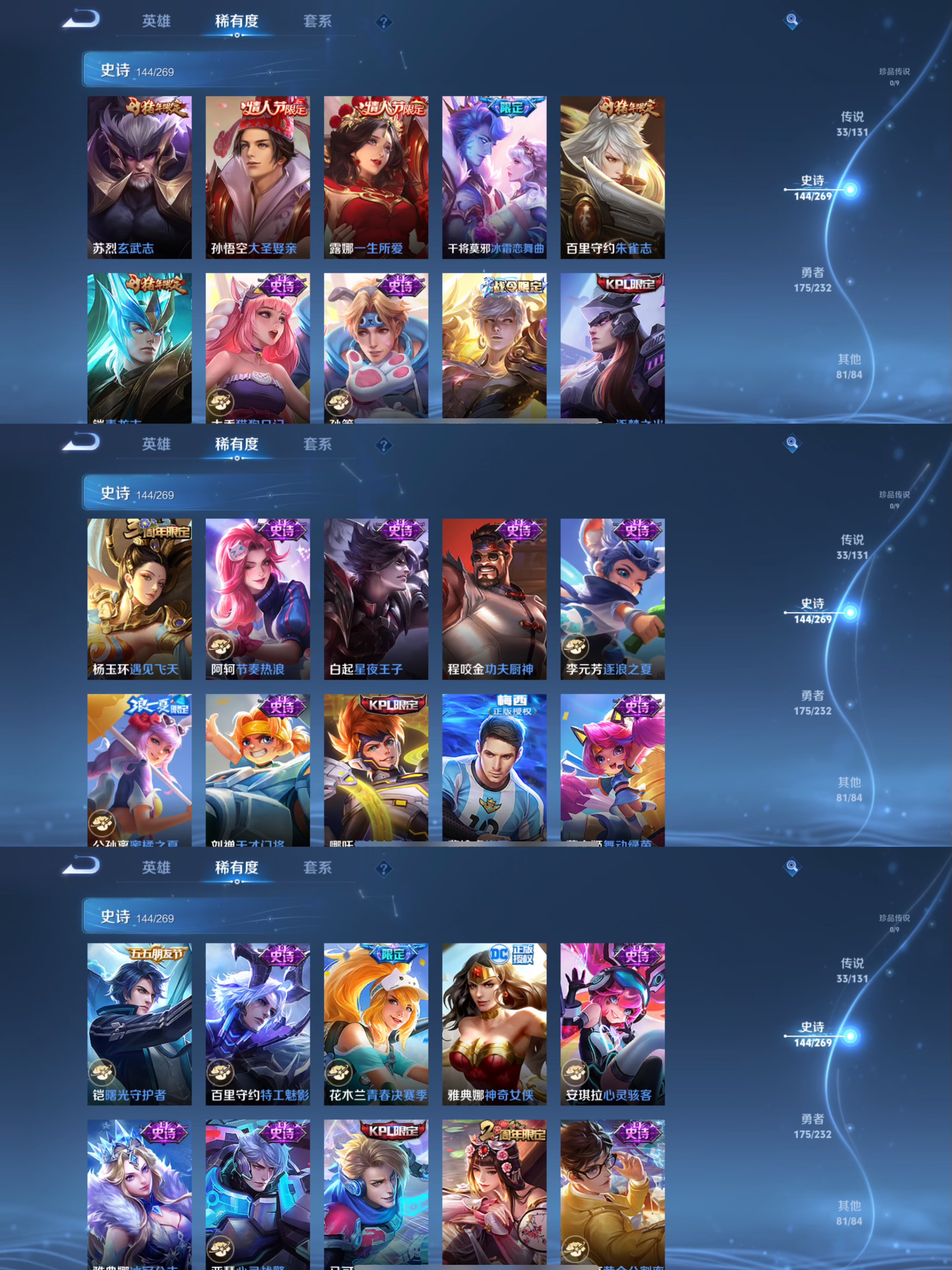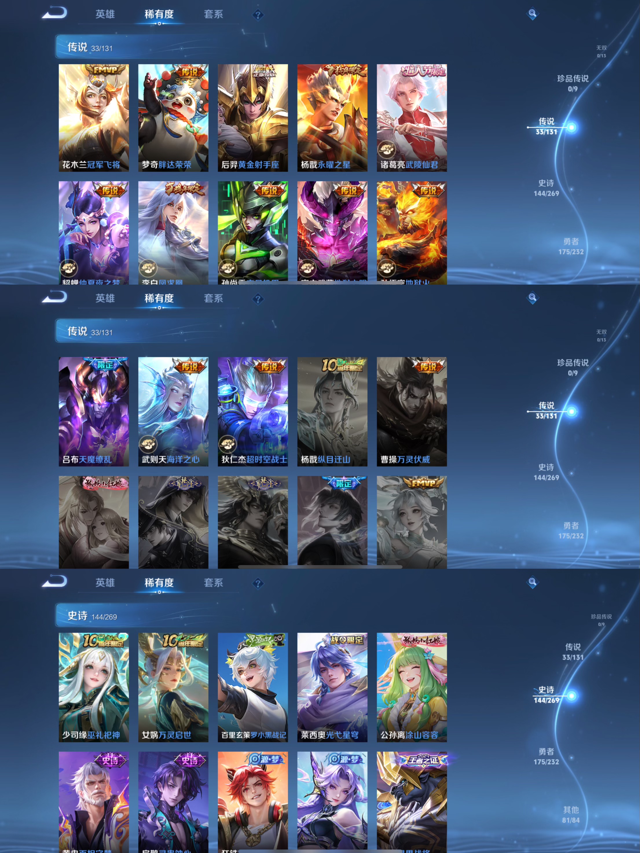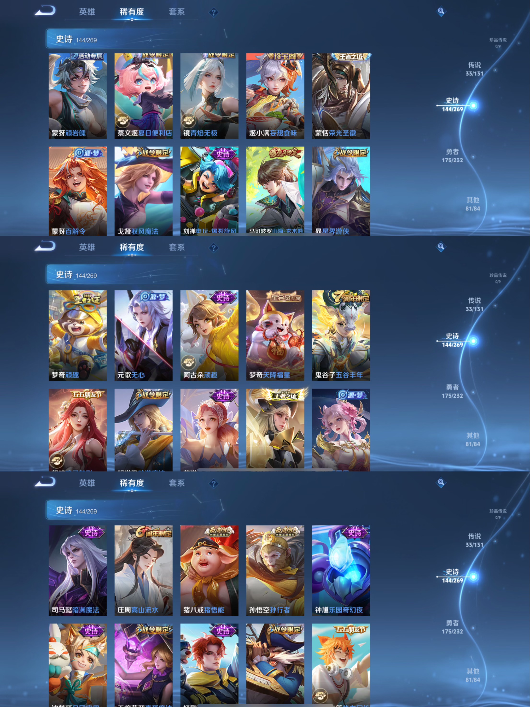传说品质_后羿_黄金射手座传说品质_后羿_神树通天传说品质_诸葛亮_武陵仙君传说品质_诸葛亮_时雨天司传说品质_孙悟空_地狱火传说品质_吕布_天魔缭乱传说品质_吕布_遇见神鼓传说品质_马超_无双飞将传说品质_武则天_海洋之心传说品质_杨戬_永曜之星传说品质_干将莫邪_久胜战神传说品质_宫本武藏_地狱之眼传说品质_周瑜_音你心动传说品质_花木兰_冠军飞将传说品质_貂蝉_仲夏夜之梦传说品质_貂蝉_猫影幻舞传说品质_李信_山海·炽霜斩传说品质_李信_一念神魔传说品质_孙尚香_末日机甲传说品质_小乔_音你心动传说品质_梦奇_胖达荣荣传说品质_桑启_鸣野蒿传说品质_艾琳_觅芳踪传说品质_张良_黄金白羊座传说品质_李白_凤求凰传说品质_曜_李逍遥 传说品质_曜_山海·苍雷引传说品质_狄仁杰_超时空战士传说品质_达摩_黄金狮子座传说品质_虞姬_云霓雀翎传说品质_虞姬_启明星使传说品质_李元芳_飞鸢探春传说品质_百里玄策_白虎志