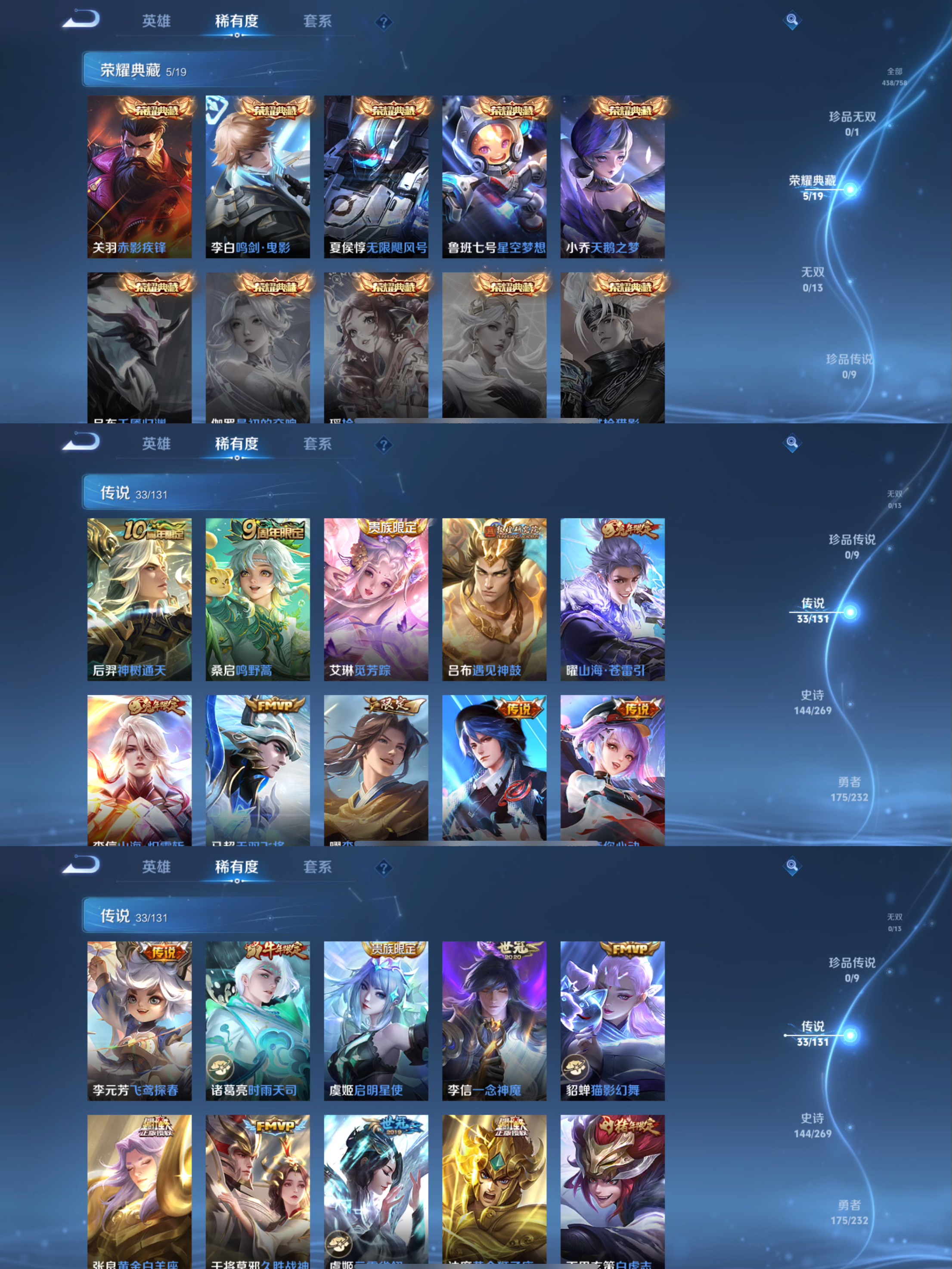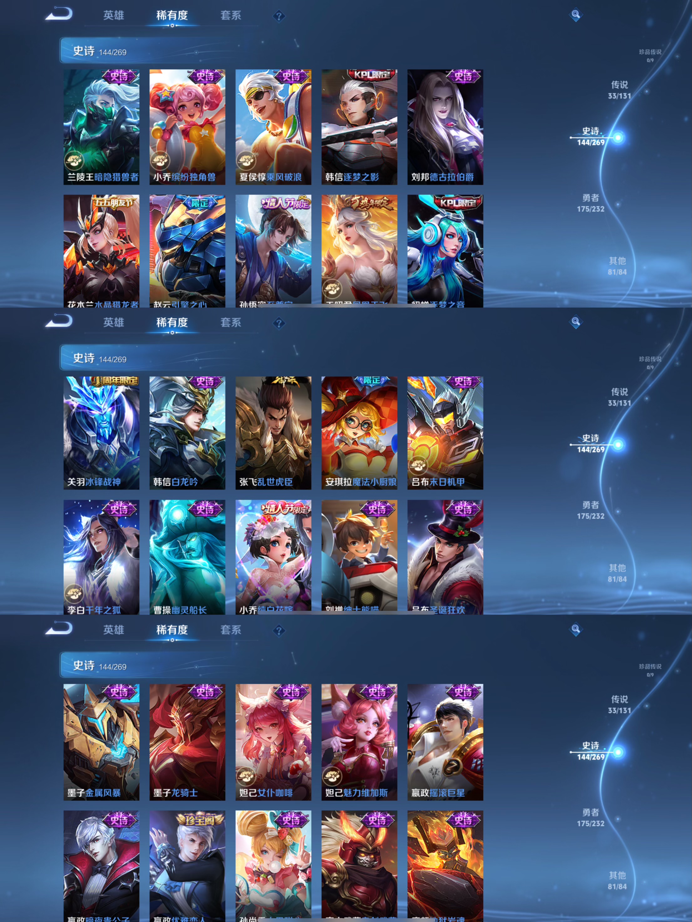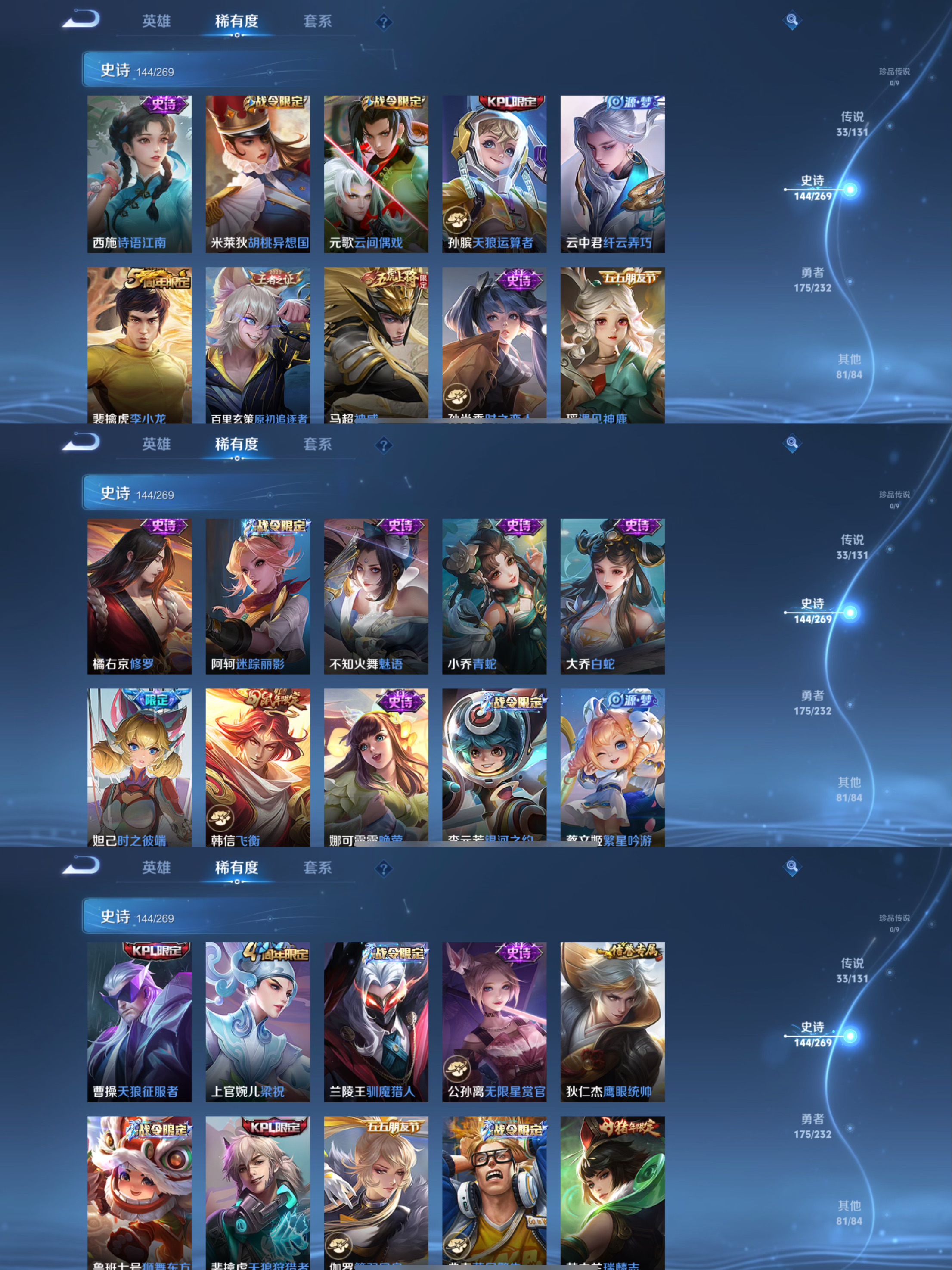传说品质_后羿_黄金射手座传说品质_后羿_神树通天传说品质_诸葛亮_武陵仙君传说品质_诸葛亮_时雨天司传说品质_孙悟空_地狱火传说品质_吕布_天魔缭乱传说品质_吕布_遇见神鼓传说品质_马超_无双飞将传说品质_武则天_海洋之心传说品质_杨戬_永曜之星传说品质_干将莫邪_久胜战神传说品质_宫本武藏_地狱之眼传说品质_周瑜_音你心动传说品质_花木兰_冠军飞将传说品质_貂蝉_仲夏夜之梦传说品质_貂蝉_猫影幻舞传说品质_李信_山海·炽霜斩传说品质_李信_一念神魔传说品质_孙尚香_末日机甲传说品质_小乔_音你心动传说品质_梦奇_胖达荣荣传说品质_桑启_鸣野蒿传说品质_艾琳_觅芳踪传说品质_张良_黄金白羊座传说品质_李白_凤求凰传说品质_曜_李逍遥 传说品质_曜_山海·苍雷引传说品质_狄仁杰_超时空战士传说品质_达摩_黄金狮子座传说品质_虞姬_云霓雀翎传说品质_虞姬_启明星使传说品质_李元芳_飞鸢探春传说品质_百里玄策_白虎志